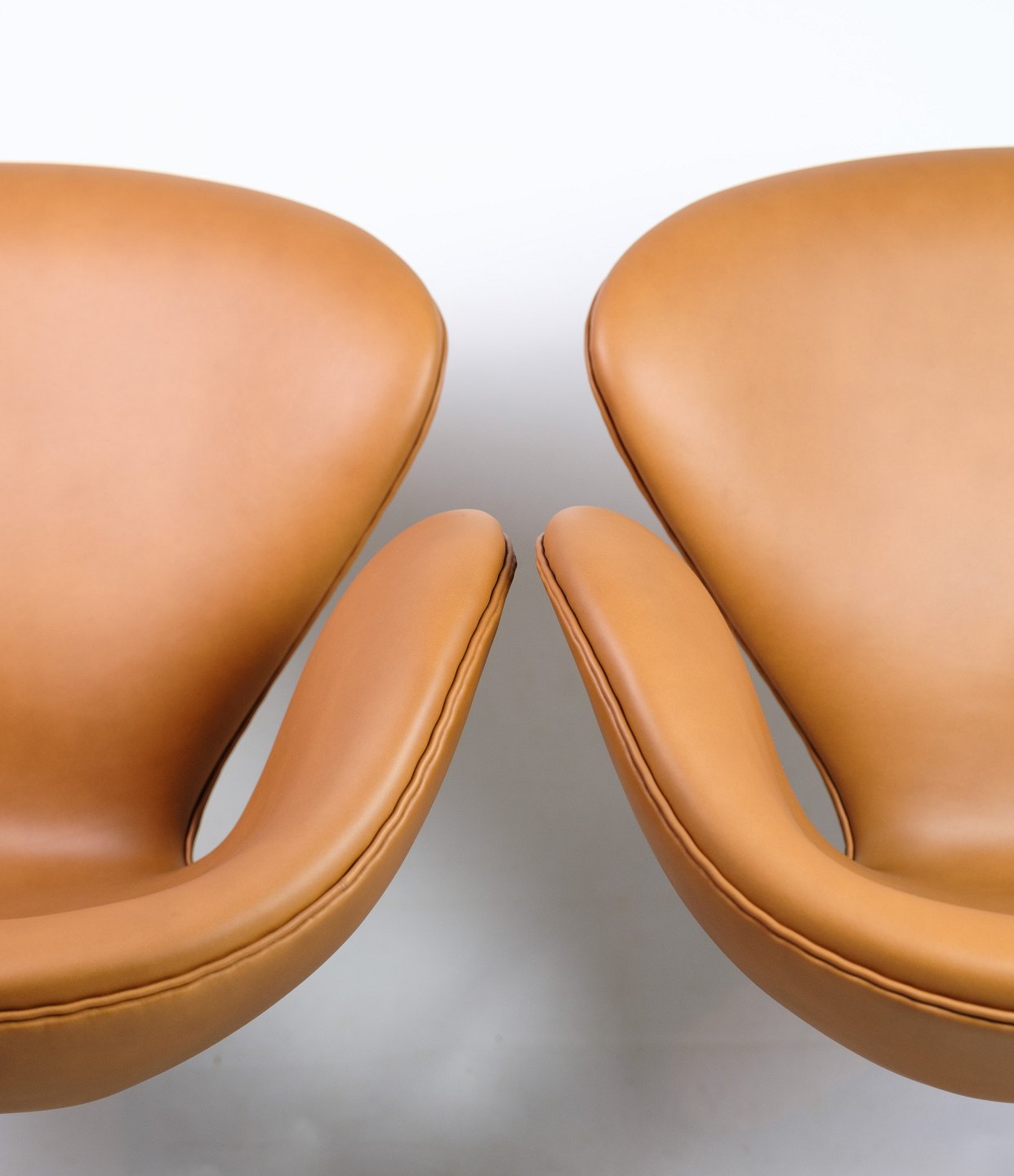 Svanen, model 3320, designet af Arne Jacobsen fremstillet hos Fritz Hansen og formgivet i 1957-1958. Lænestolen står med originalt læder af den højeste kvalitet og i fremragende stand. Stolen er drejelig, med føder af aluminium.