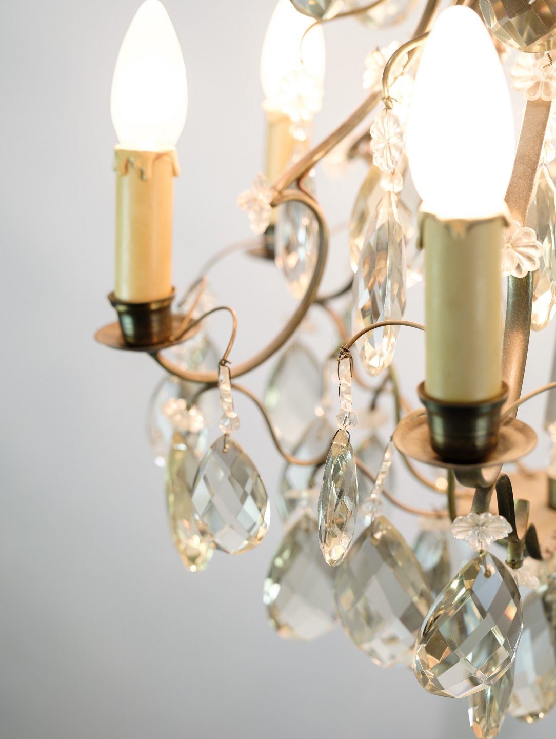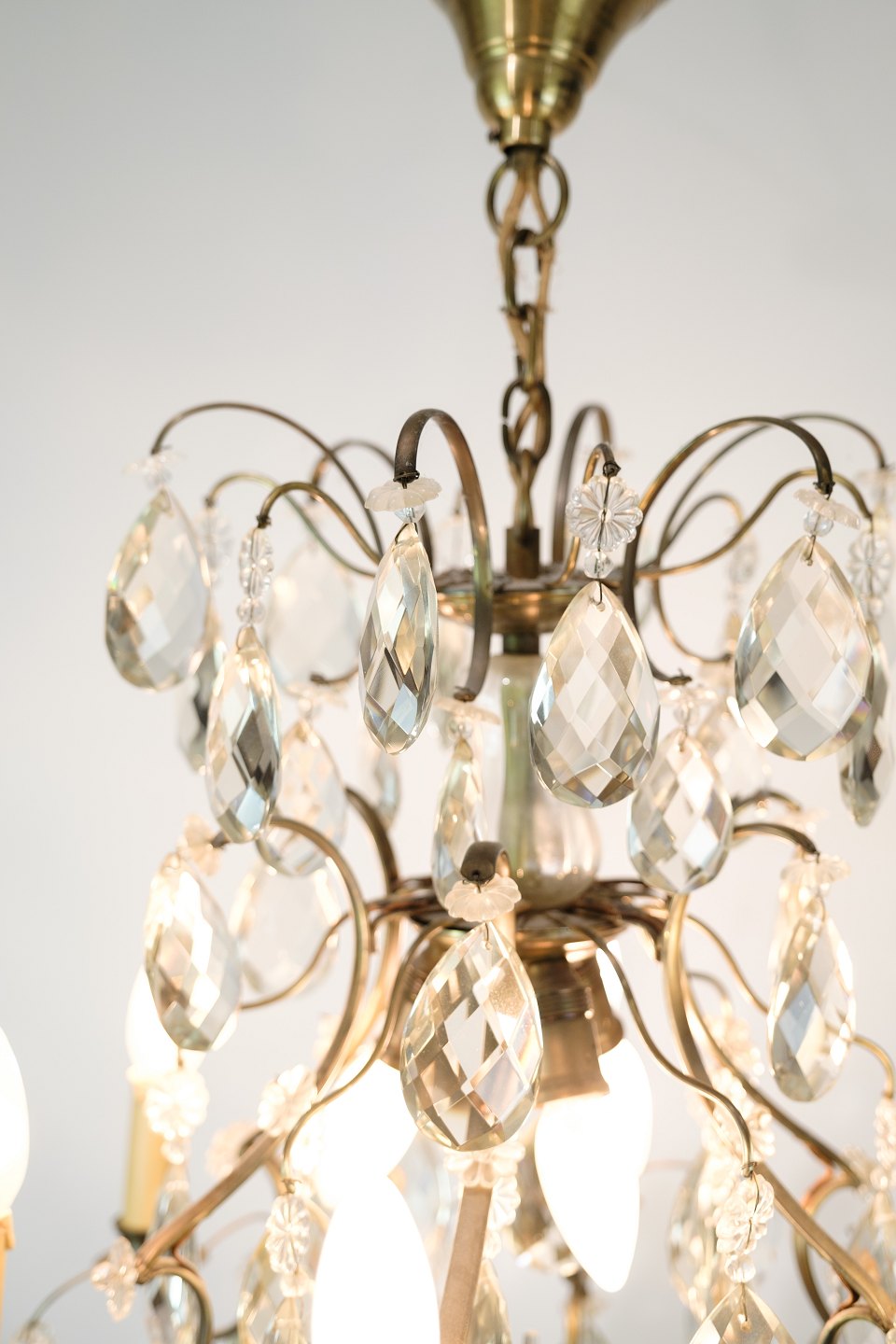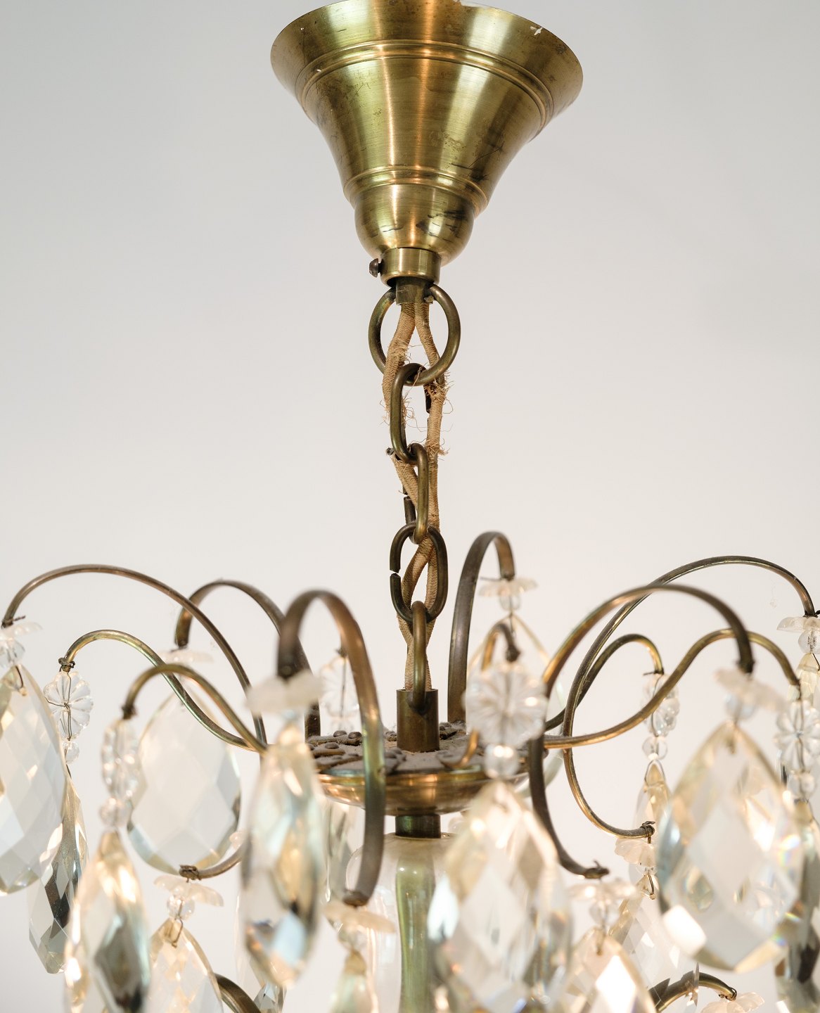 SolgtPrismekrone af messing og slebne prismer fra Frankrig omkring 1920erne. Til lampen medfølger en baldakin i messing.