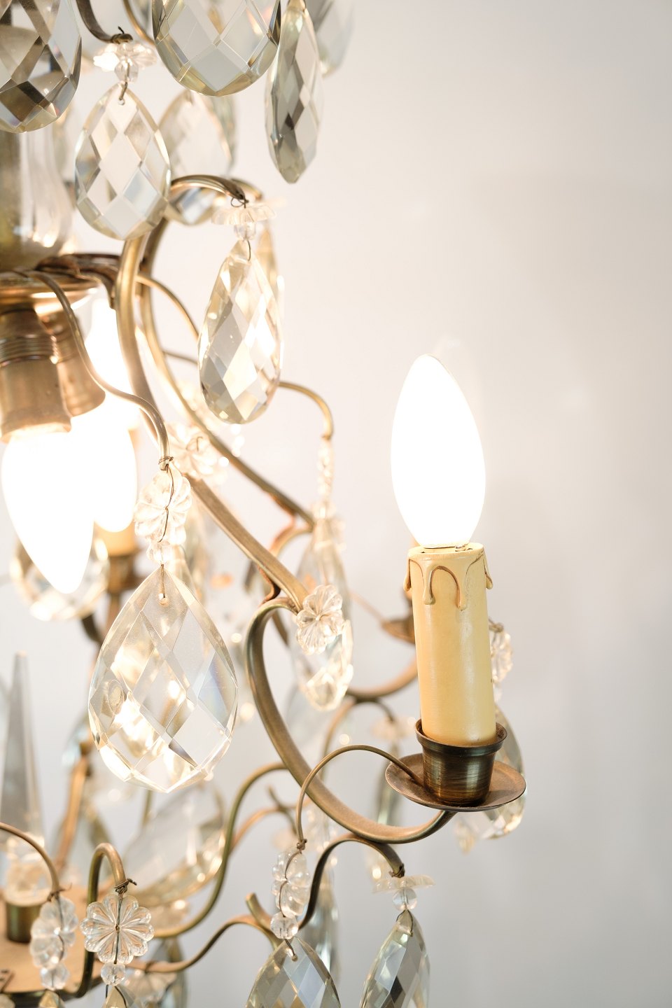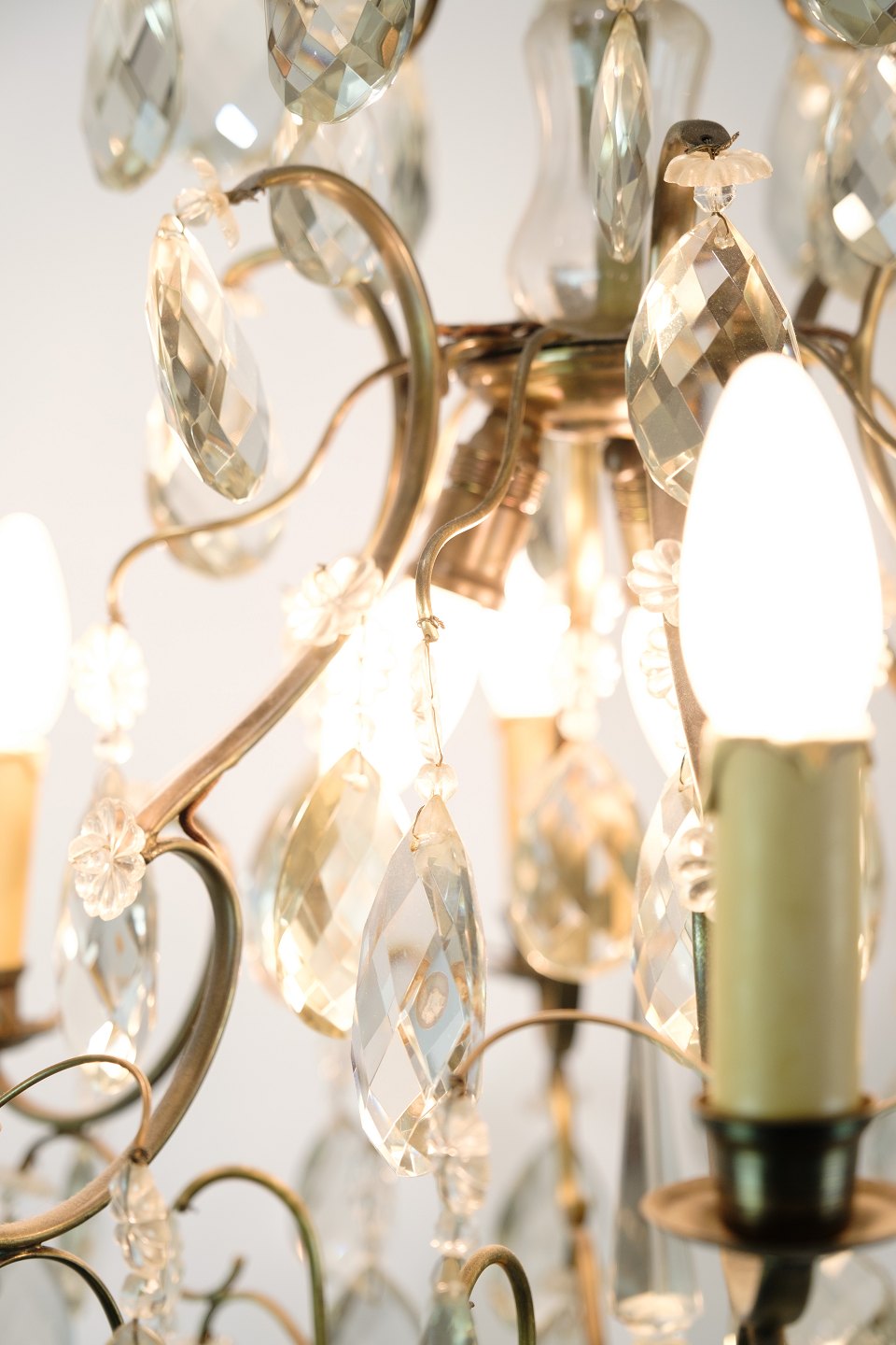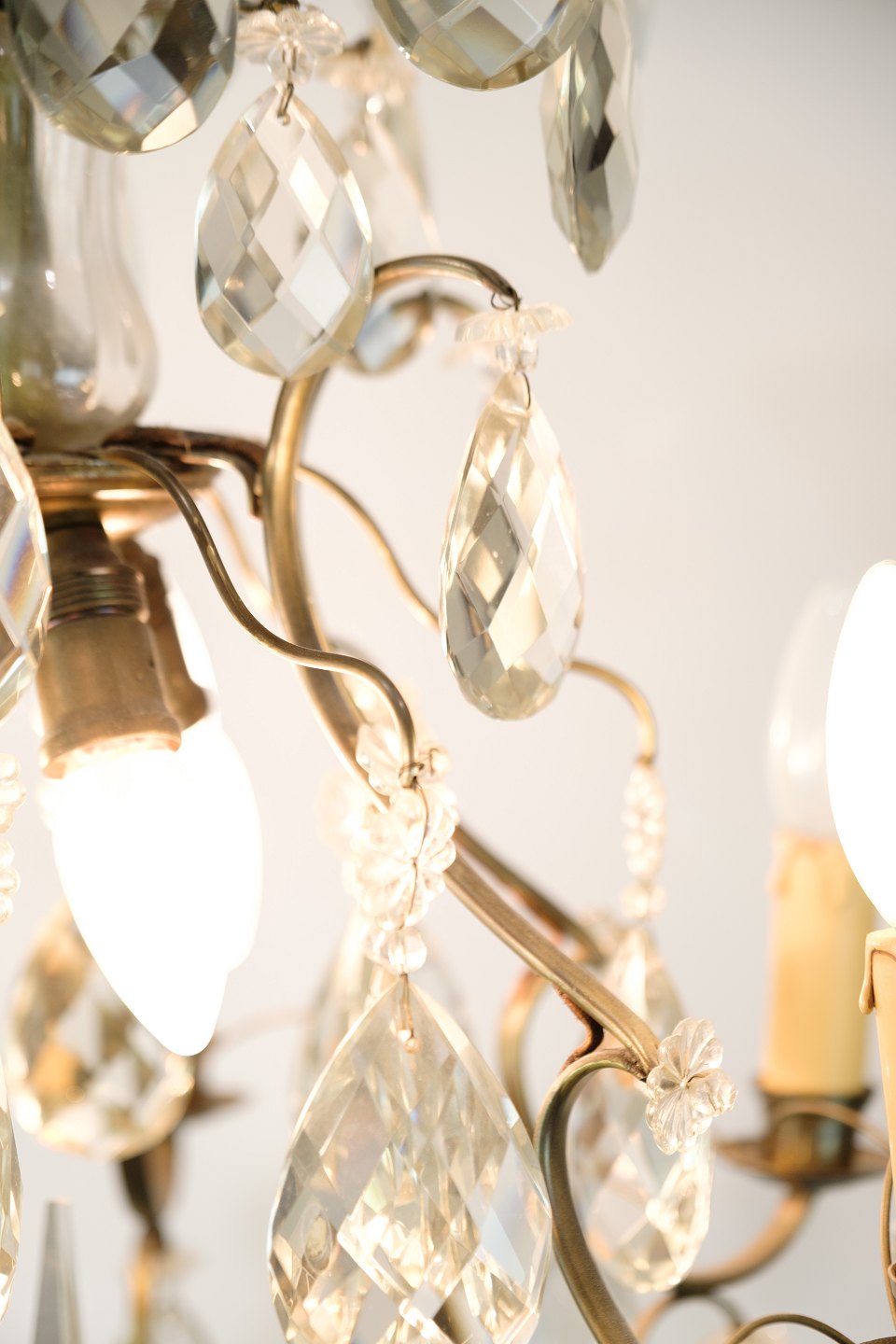 SolgtPrismekrone af messing og slebne prismer fra Frankrig omkring 1920erne. Til lampen medfølger en baldakin i messing.