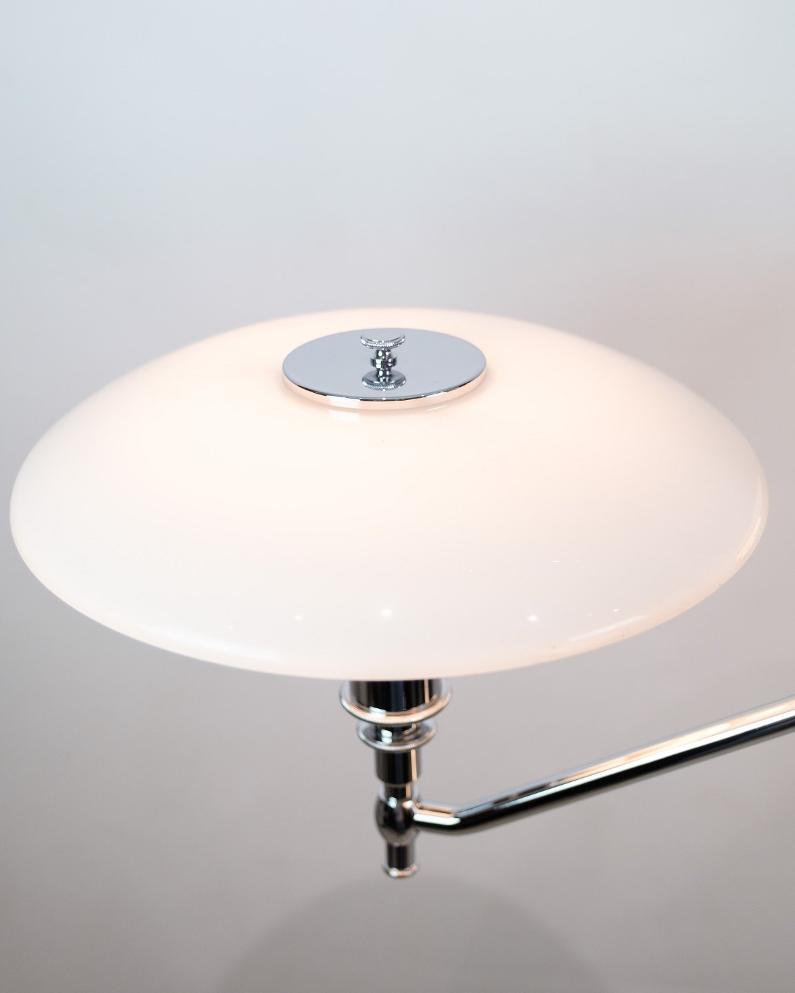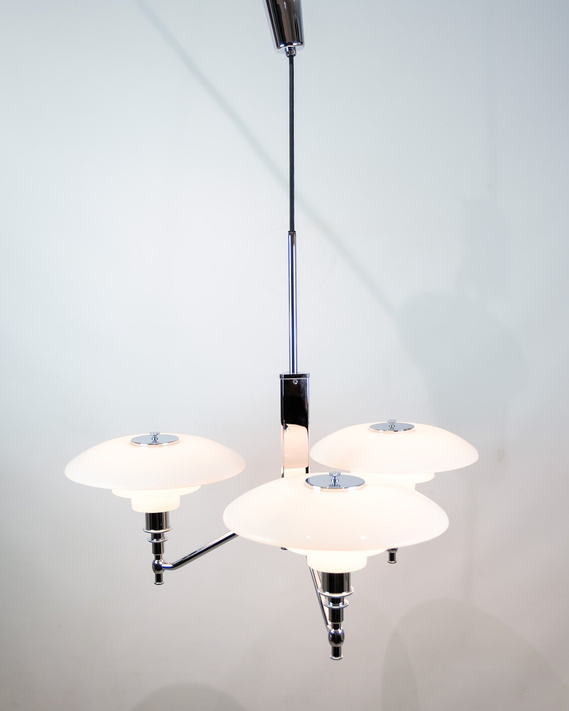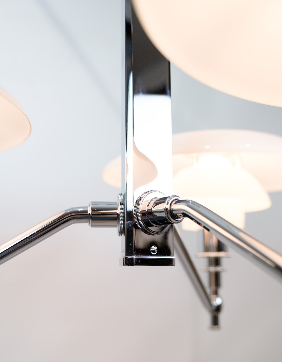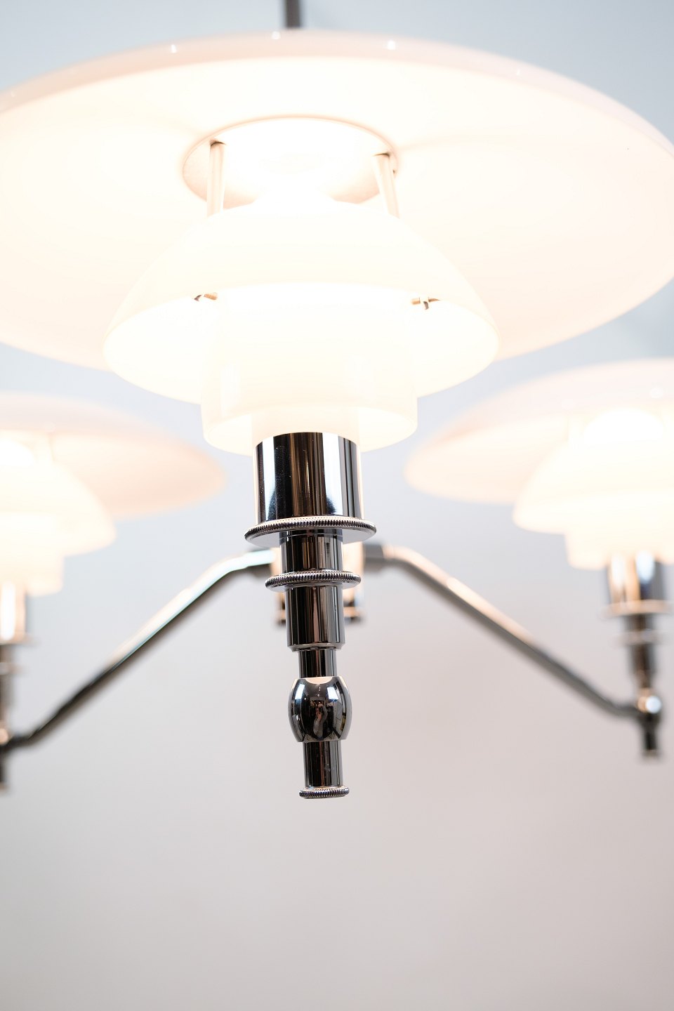 SoldPH 3/2 Academy crown designed by Poul Henningsen in 1925-1926, launched in 2000 and manufactured by Louis Poulsen. The crown is made of hand-blown white opal glass and high-gloss chrome-plated.