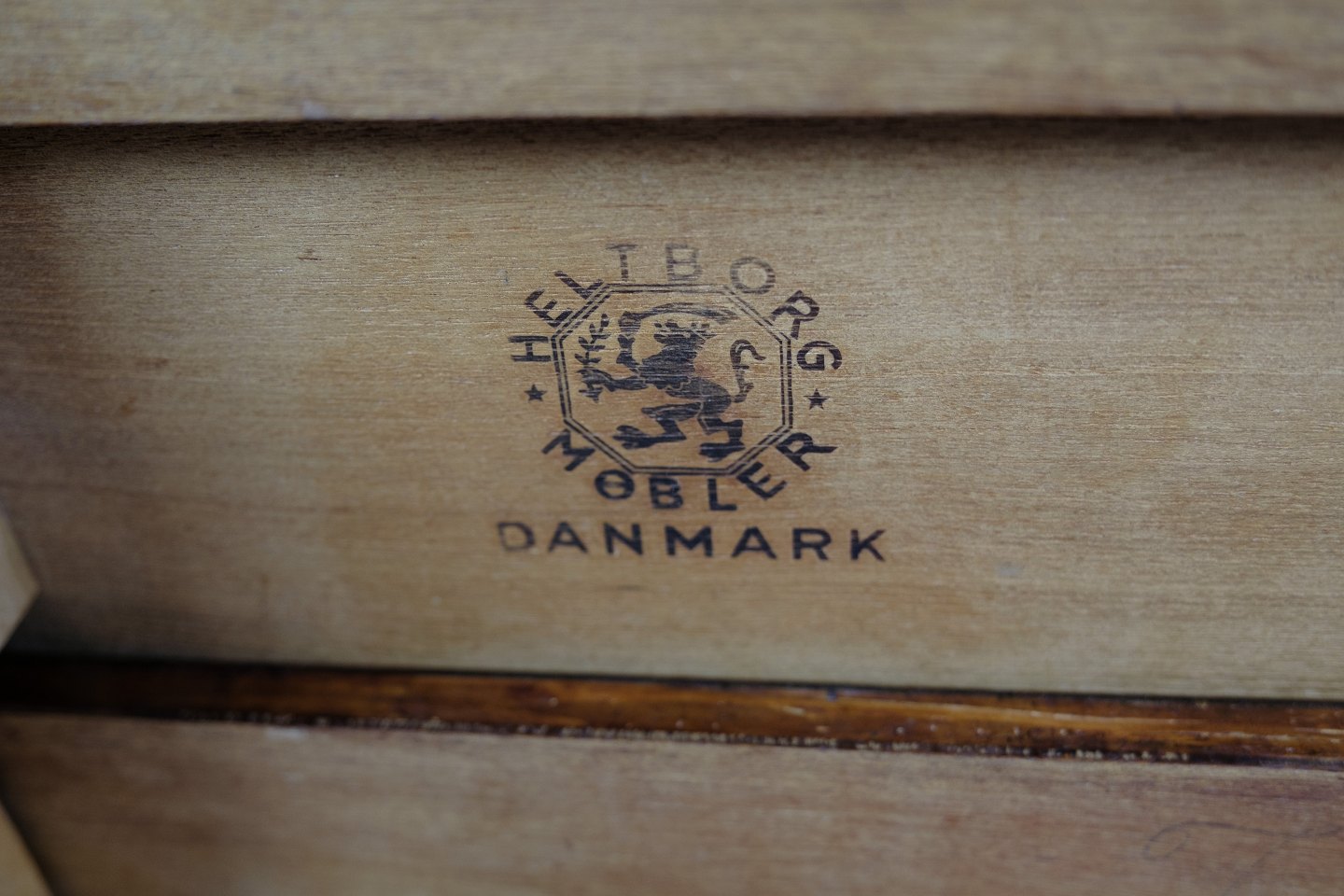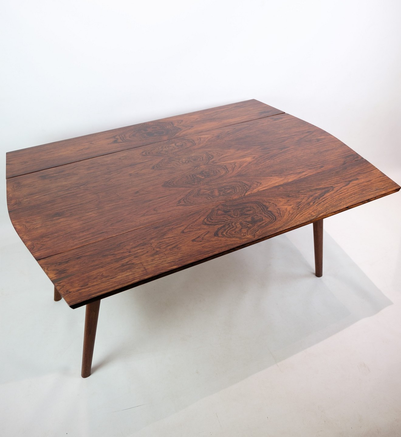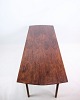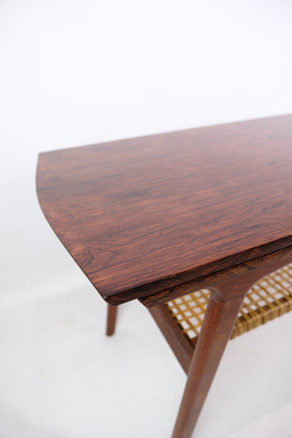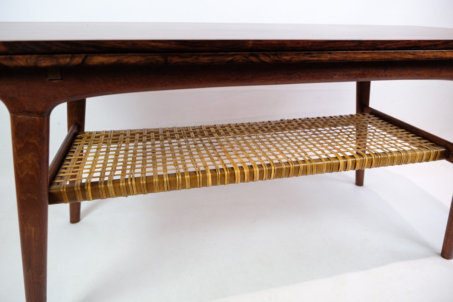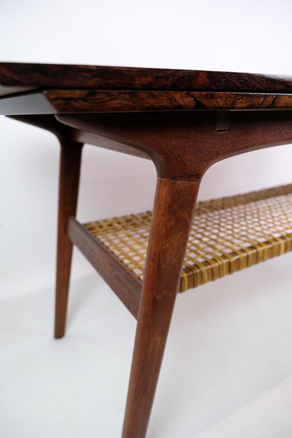 SolgtSofabord i palisander af Heltborg Møbler Danmark med underliggende flethylde fra omkring 1960'erne. Sofabordet har også udtræksplader i hver side, som gør det henholdsvis 47 cm og 87 cm bredt.