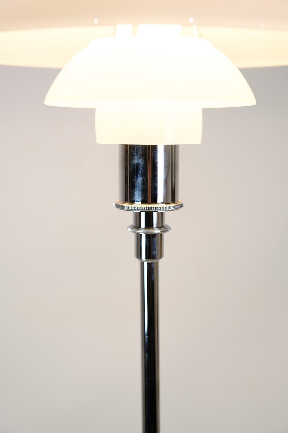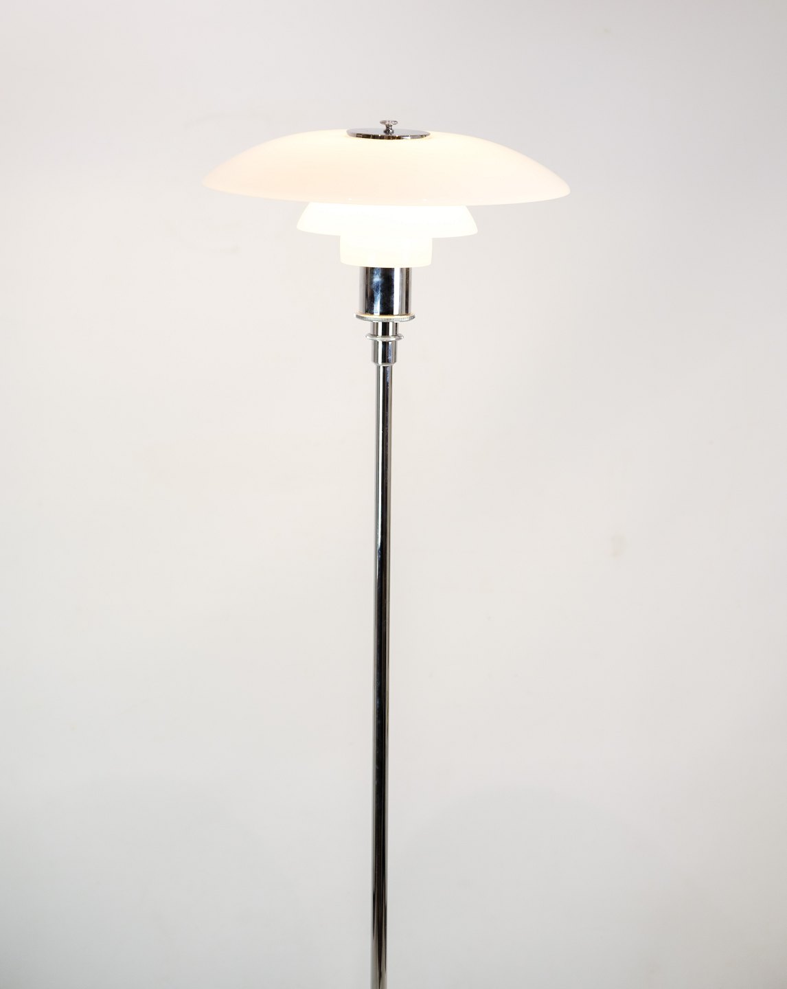 Gulvlampe, Model 3½-2½ krom, designet af Poul Henningsen med hvide opal glasskærme fremstillet af Louis Poulsen. Stellet er Højglansforkromet med en ledning af sort plast med stikprop.