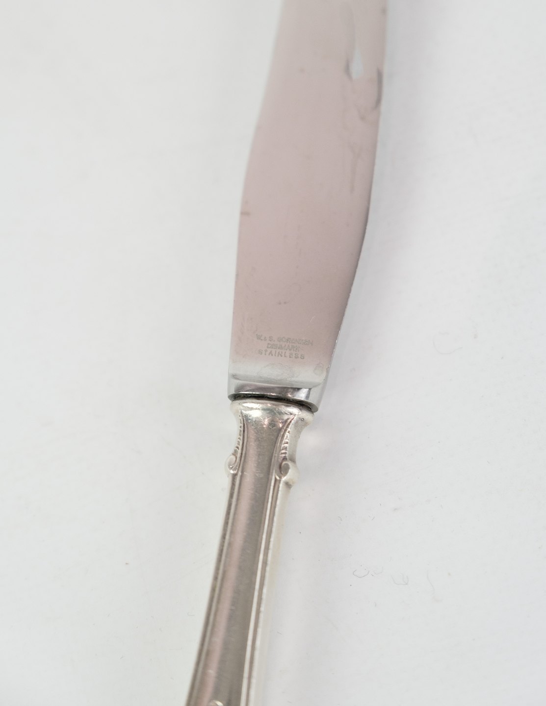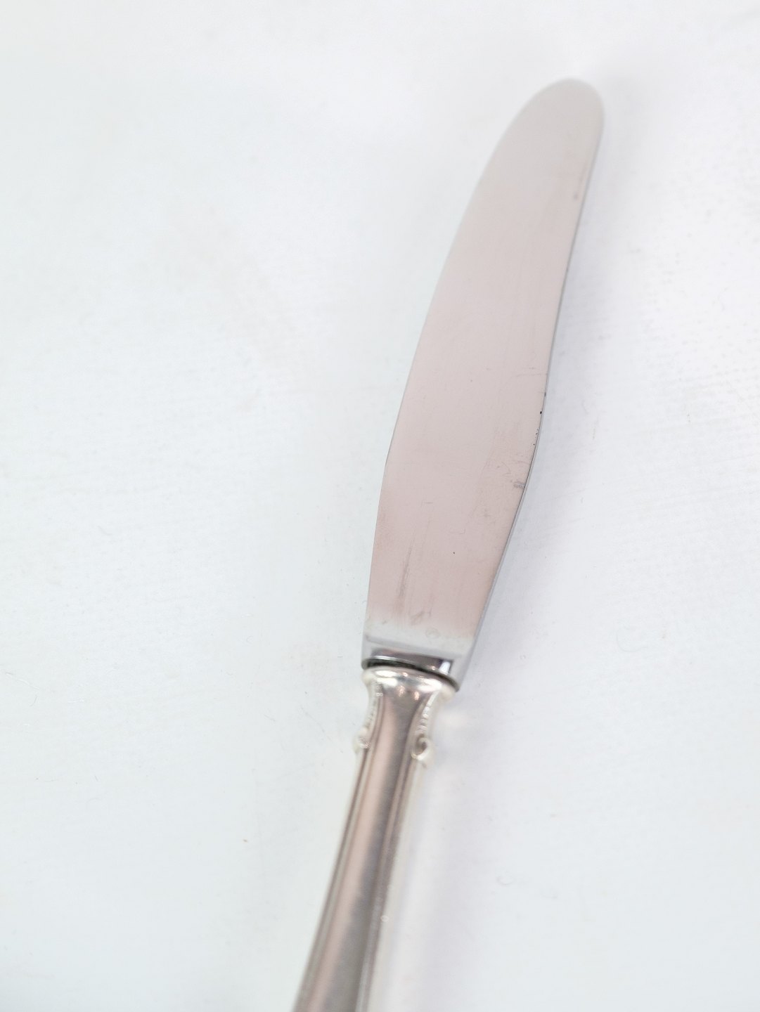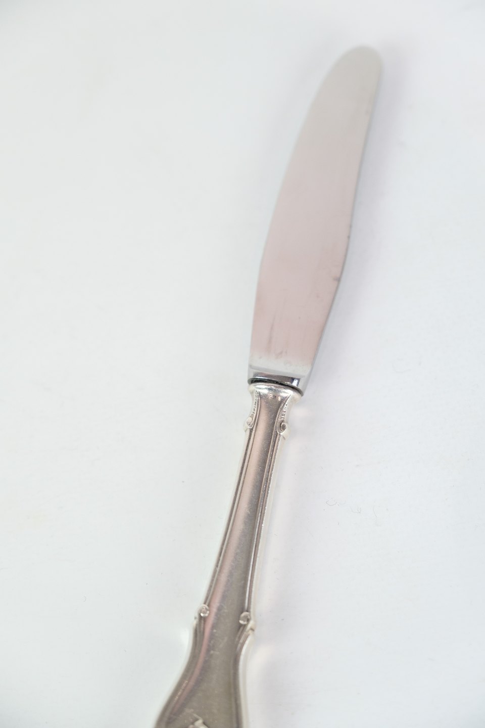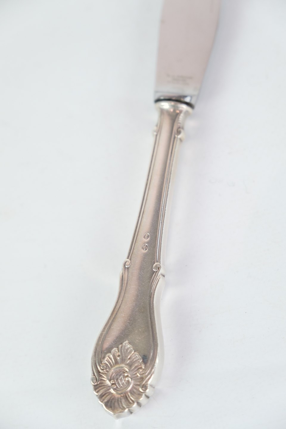 Middagskniv i rokoko af dansk sølvbestik i tretårnet 830s. fremstillet hos Horsens sølvvarefabrik.