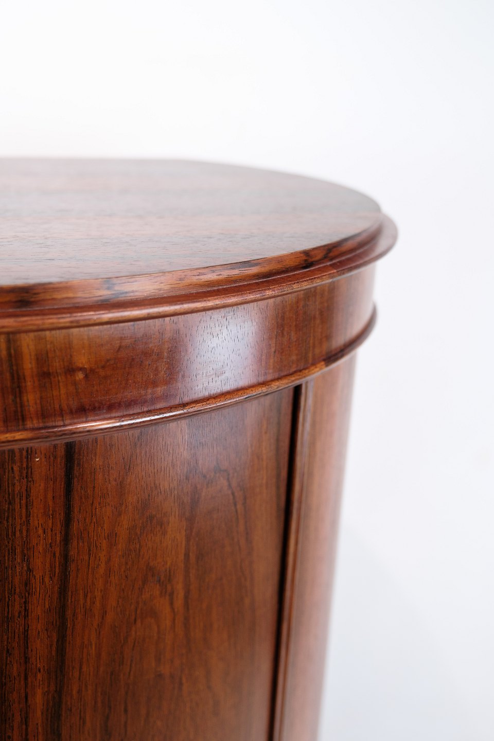 Dette smukke ovalt piedestalskab af palisander er designet af den anerkendte danske møbeldesigner Johannes Sorth, der var en del af Bornholms Møbelfabrik i Nexø i perioden fra 1955 til 1968.