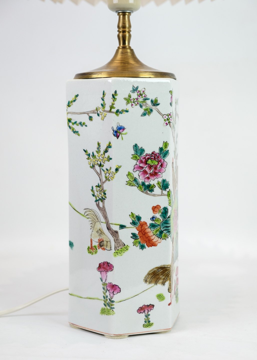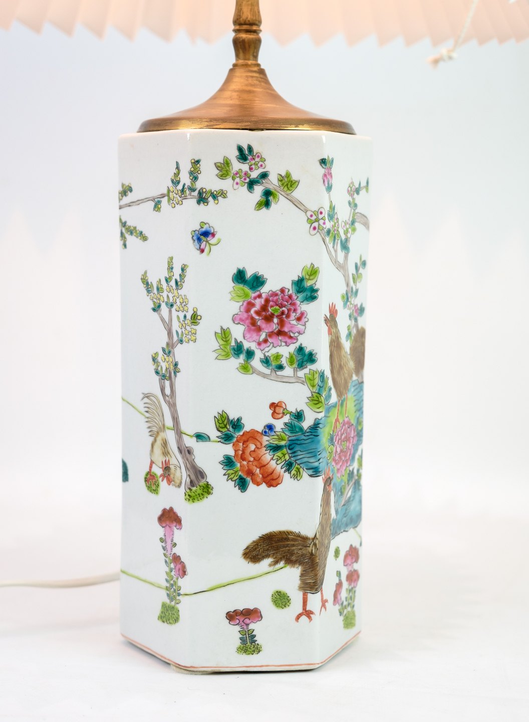 SoldA few of Chinese table lamps in porcelain with motifs of nature from the 1920s. Stands in fine used condition with a similar white screen.