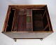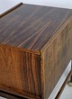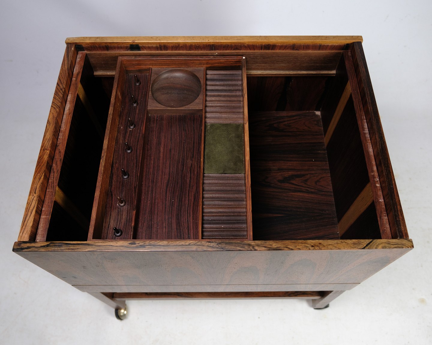 Boksen har en slidseåbning i midten af bordpladen, som åbner op i begge ender for at afsløre opbevaringsplads og en aftagelig bakke med mange rum. Der er en smuk kurvforet skuffe nederst, og bagsiden er også pænt afsluttet, så dette kan bruges som et fritstående møbel. Farven og palisandertræets kornmønstre er fantastiske overalt, selv indeni.