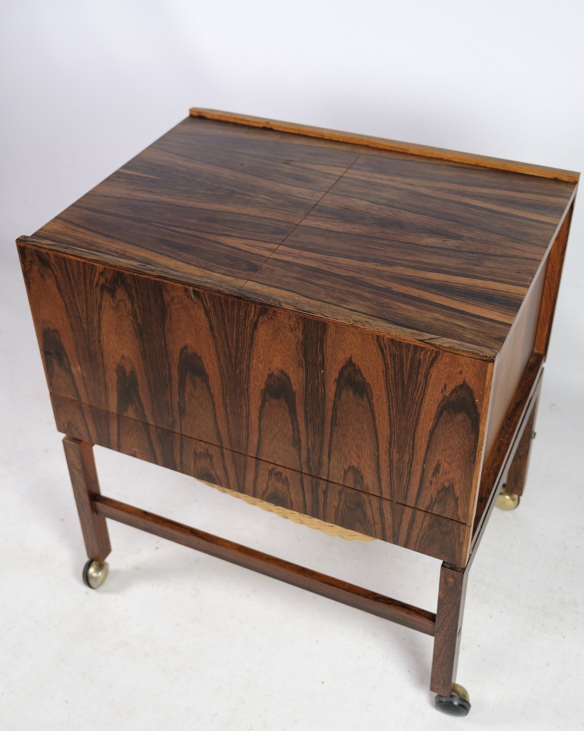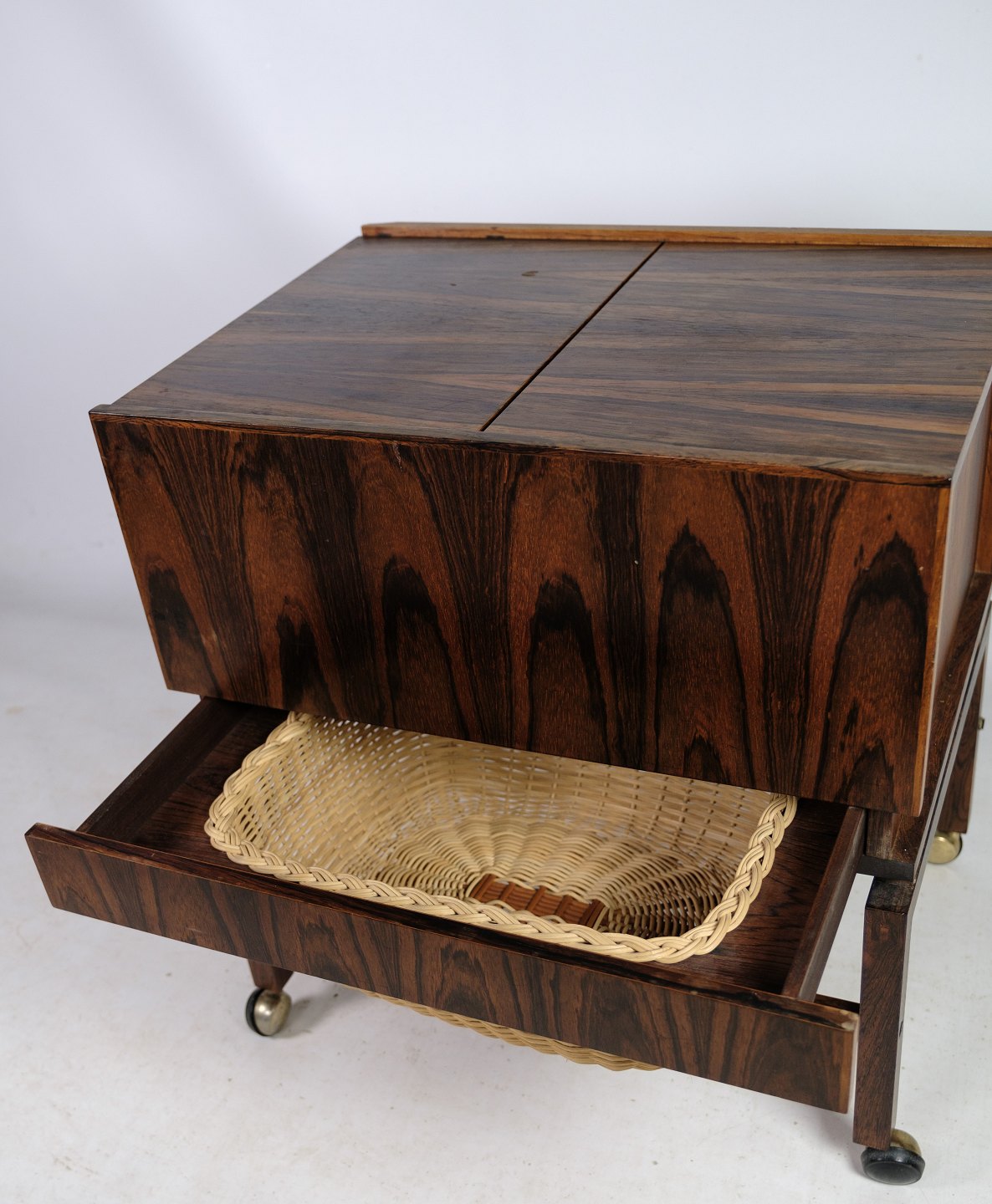 Denne vintage sybord / barbord på ben i palisander er et fantastisk eksempel på dansk møbeldesign fra 1960'erne. Den er fremstillet i Danmark og er af enestående kvalitet med en fantastisk design.