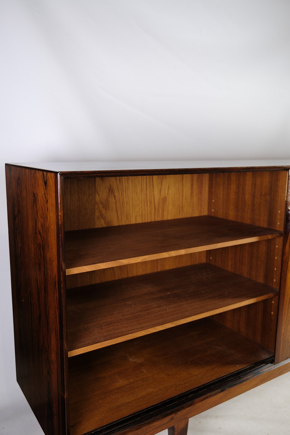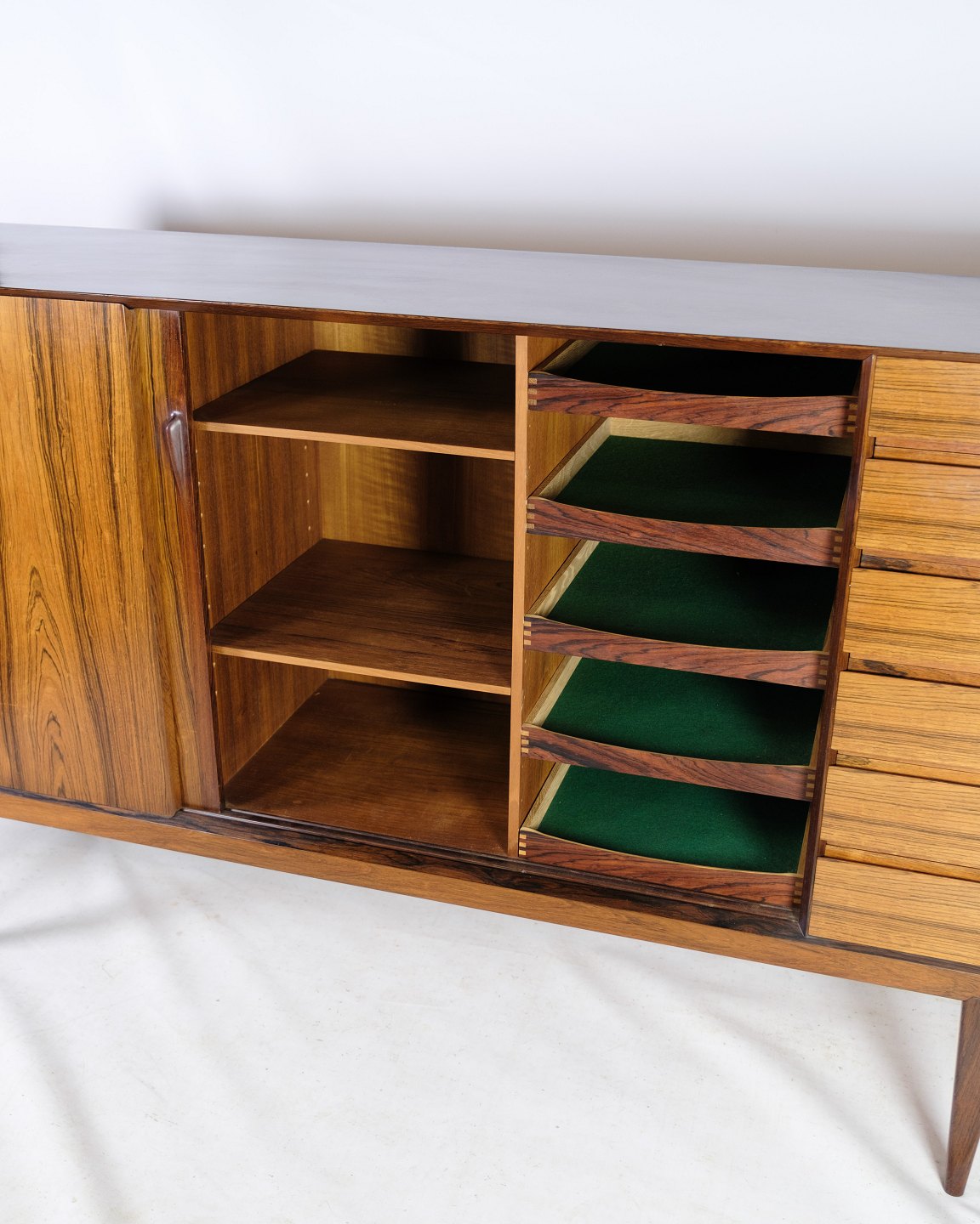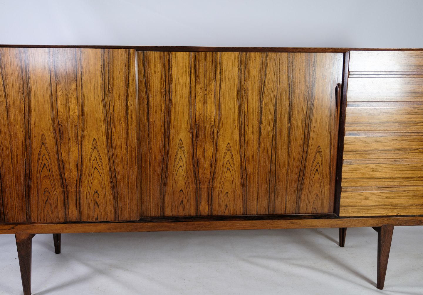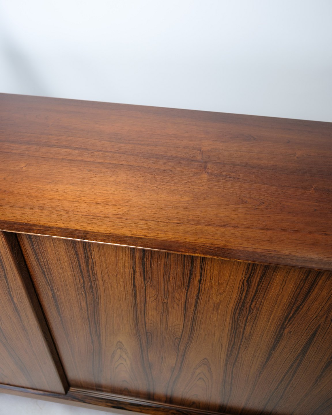 The sideboard in rosewood, designed by Henry Rosengren Hansen and produced by Brande Møbelindustri in 1960, is a splendid example of Danish furniture art from the middle of the 20th century. This sideboard exudes a timeless elegance with its beautiful rosewood, giving a warm and luxurious atmosphere to any room.