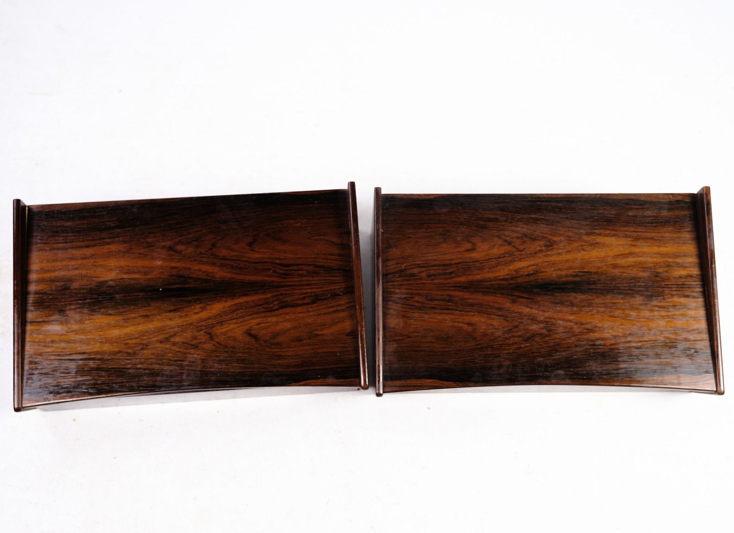 SolgtEt sæt væghængte natborde i palisander med skuffer fremstår med stempler af Ølholm Møbelfabrik, Horsens fra omkring 1960'erne.