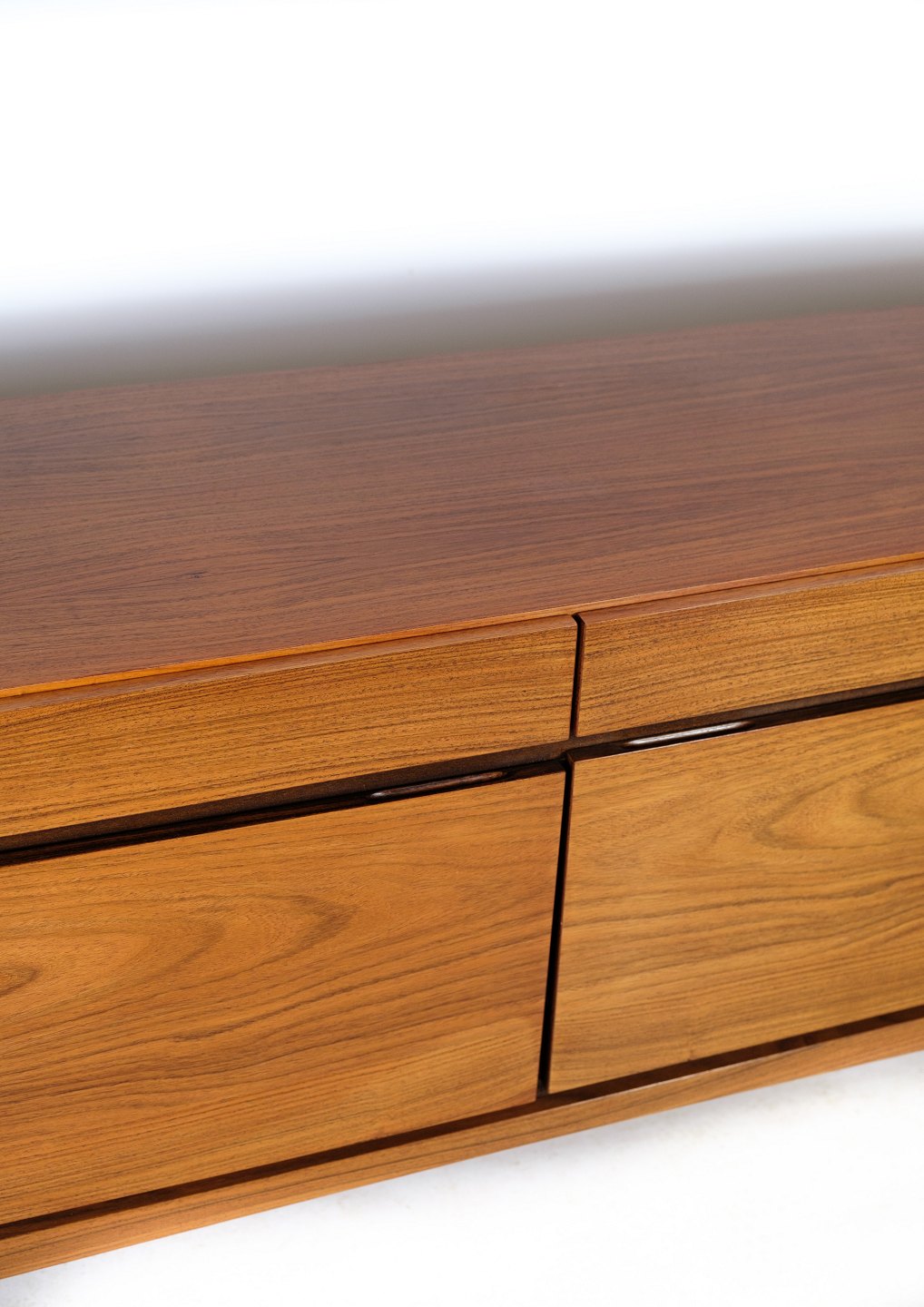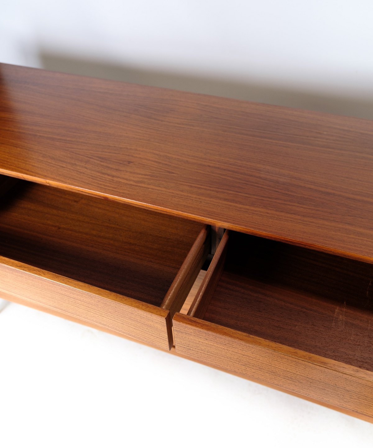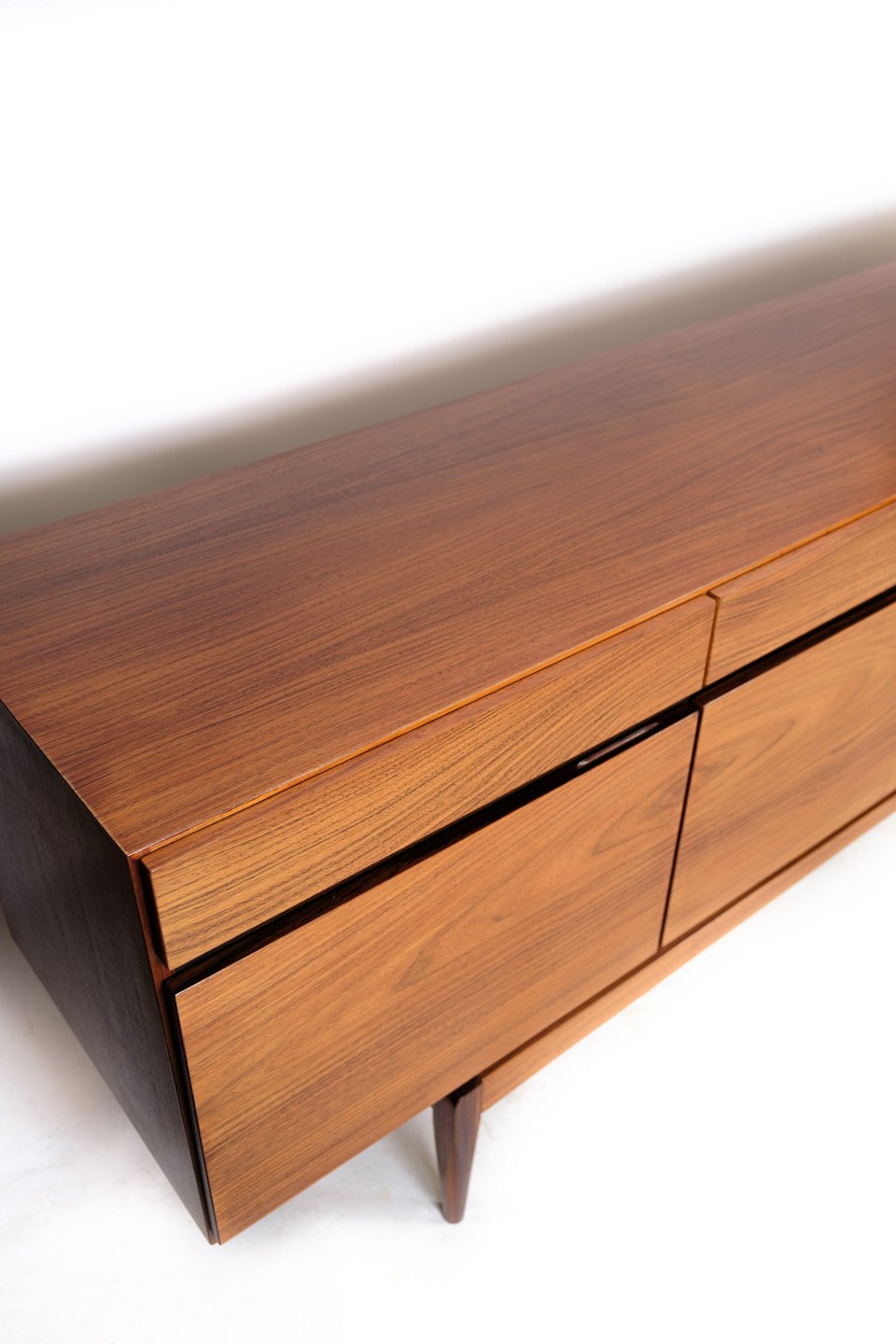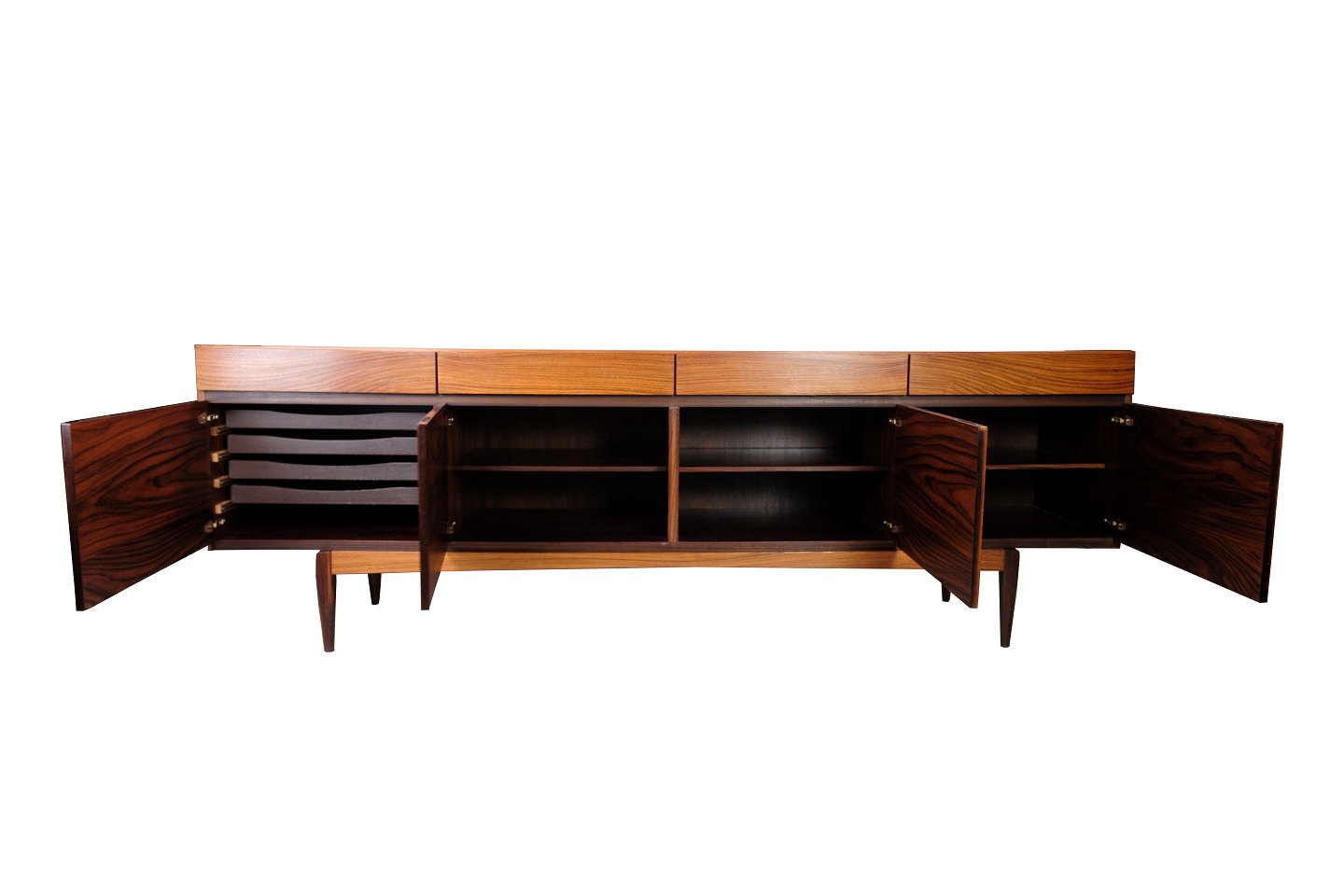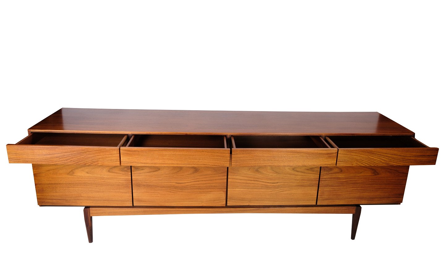 Skænk i palisander designet af Ib Kofod-Larsen, model FA66 fremstillet hos Faarup Møbelfabrik i 1960'erne. En lav fritstående skænk af den højeste kvalitet. Den er fineret med palisander med en meget smuk struktur. I fronten har den fire skuffer, samt fire låger, hvor der er både hylder og udtræksbakker.