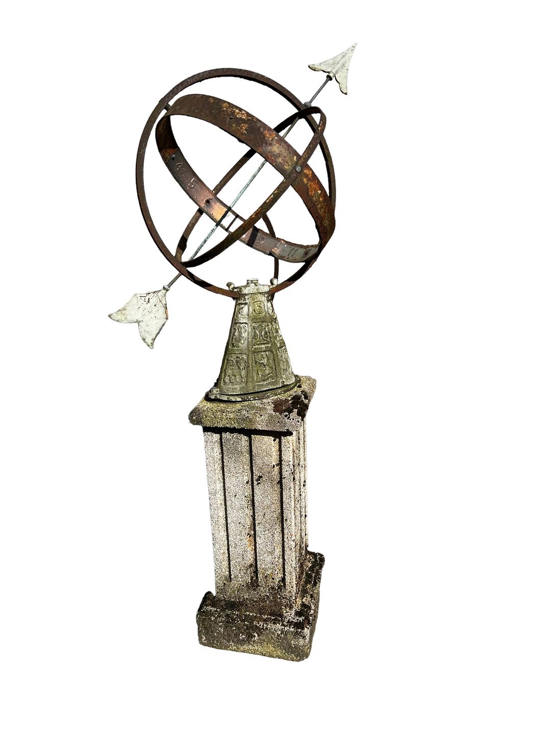 Sun clock made of iron, copper and zinc metal on a plinth of artificial stone. The sundial appears with a patina.
