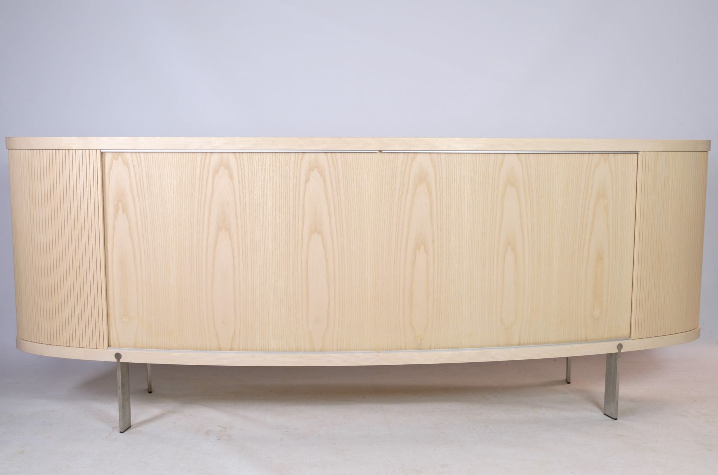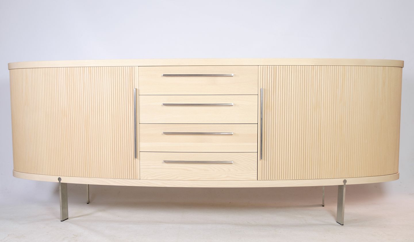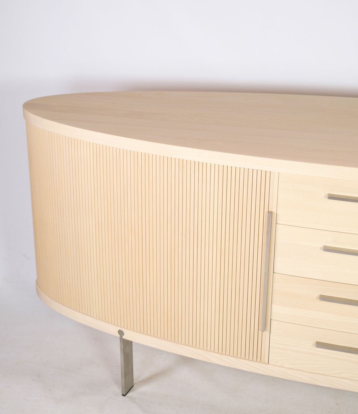 SolgtSkænk i træet ask, model AK-1300, designet og fremstillet af Naver Collection en klassisk oval skænk med jalousilåger som har fået et moderne twist. Står som ny med meget få brugstegn.