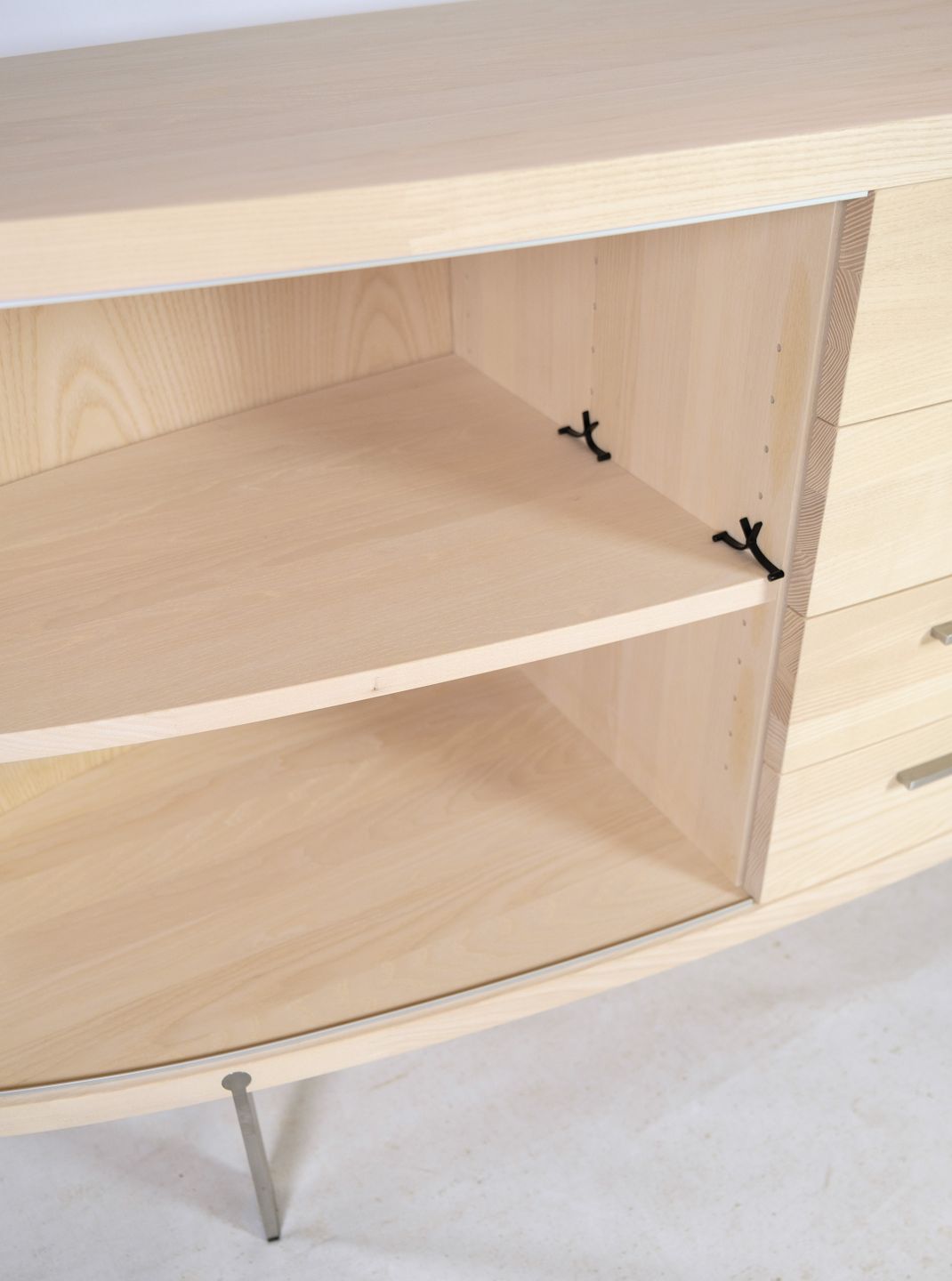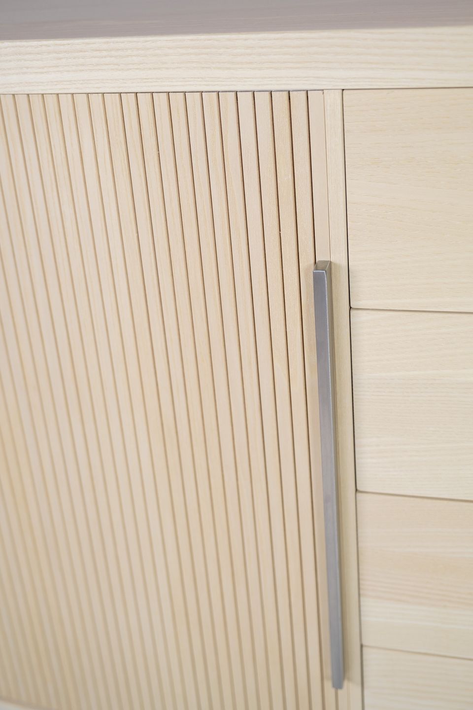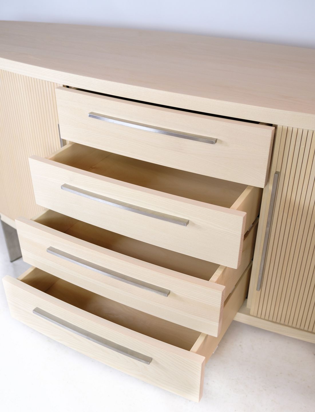 SolgtSkænk i træet ask, model AK-1300, designet og fremstillet af Naver Collection en klassisk oval skænk med jalousilåger som har fået et moderne twist. Står som ny med meget få brugstegn.