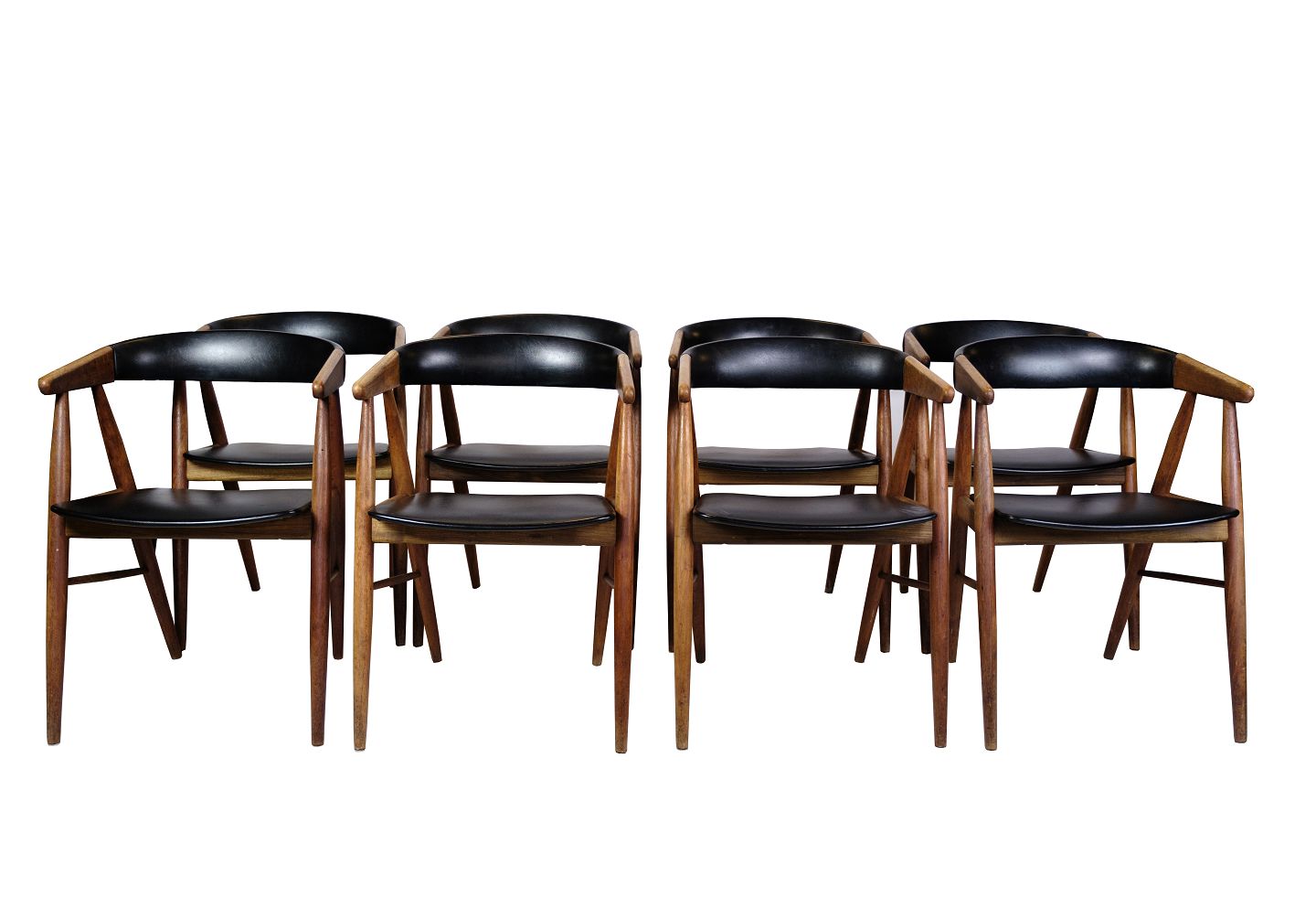 SoldSet of eight chairs in teak wood in black leather designed by Aksel Bender and Ejnar Larsen designed in the 1960s. They are all in very good vintage condition. Sold as a set of both 4 and 8.