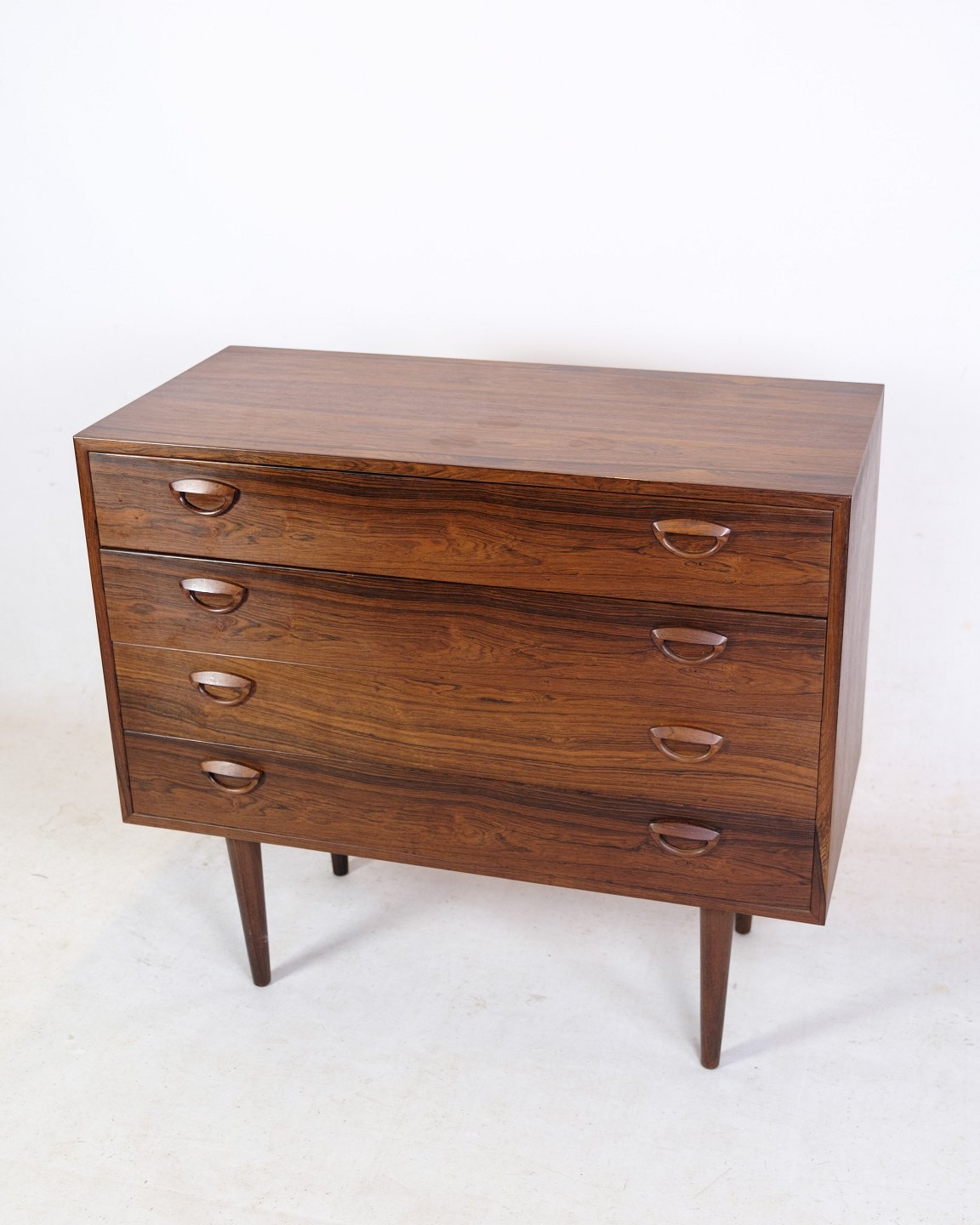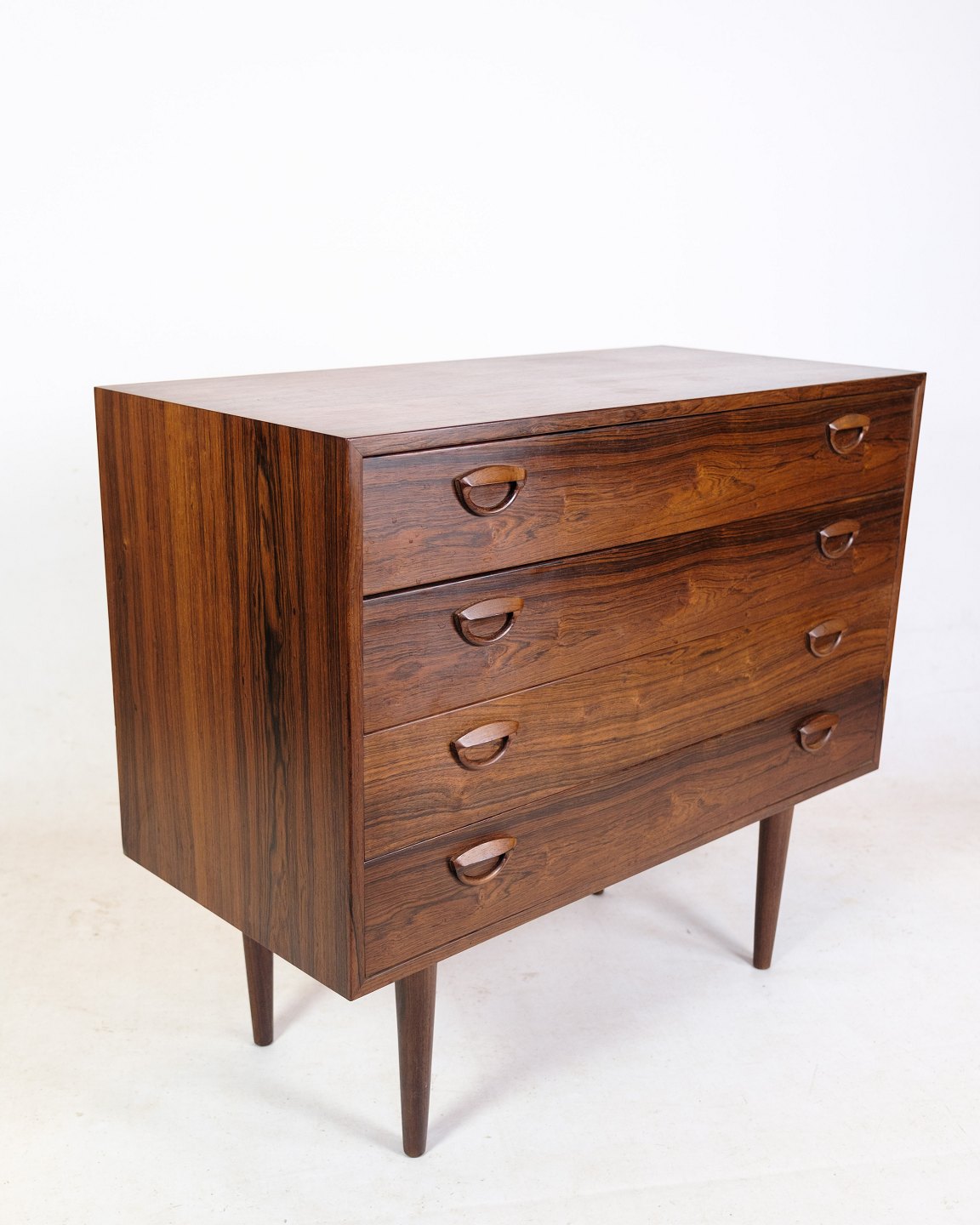 This chest of drawers, designed by the Danish furniture architect Kai Kristiansen around the 1960s, is an iconic piece of furniture design. Made of rosewood, the chest of drawers exudes elegance and timeless beauty. With four spacious drawers and tapered legs, it appears both functional and stylish.