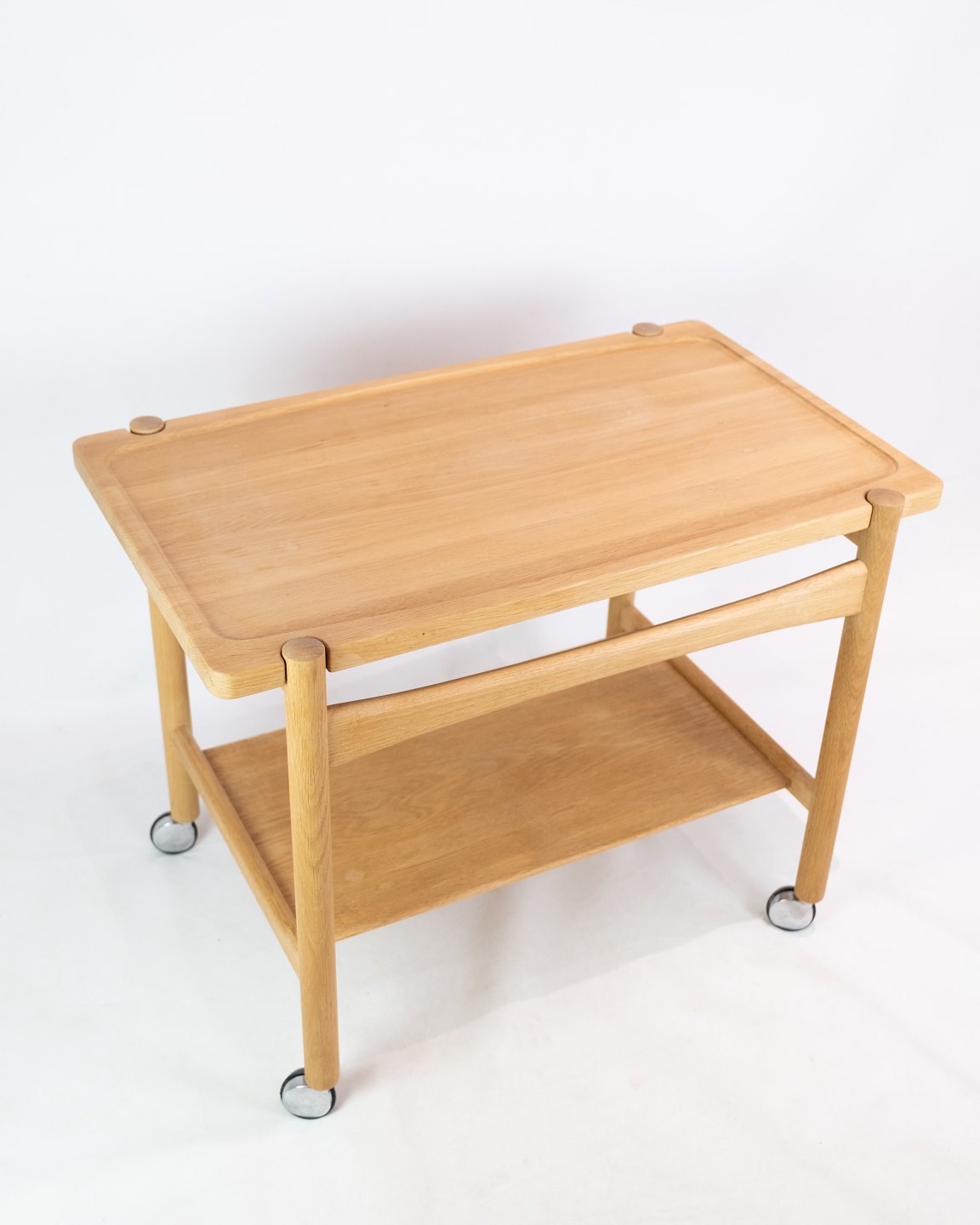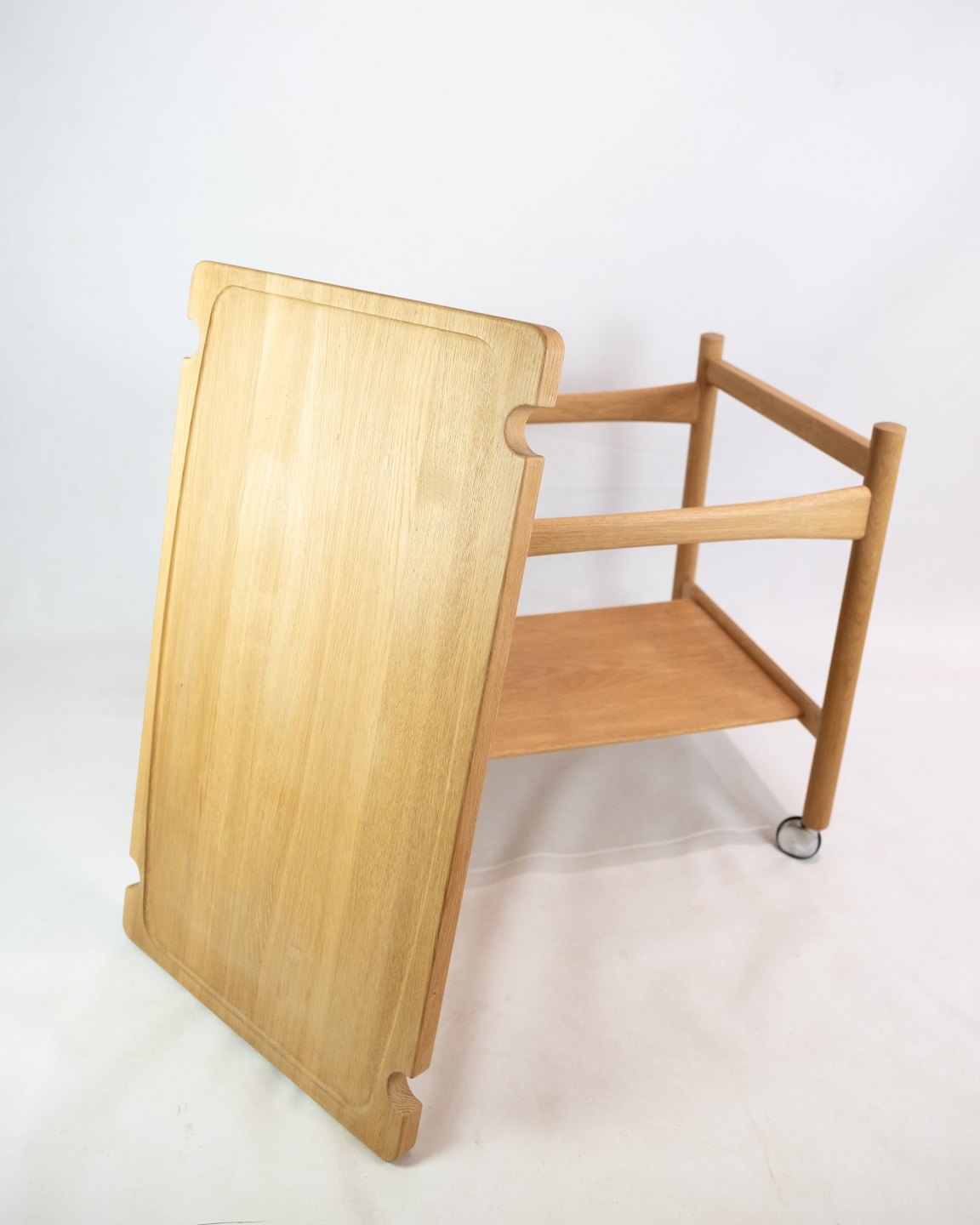 Hans J. Wegner's design brings a timeless elegance and functionality to the serving trolley, making it a sought-after and valued piece of furniture. With its solid oak construction, the "AT 48" serving trolley is a beautiful example of Danish design heritage that will add an elegant touch to any home or interior.