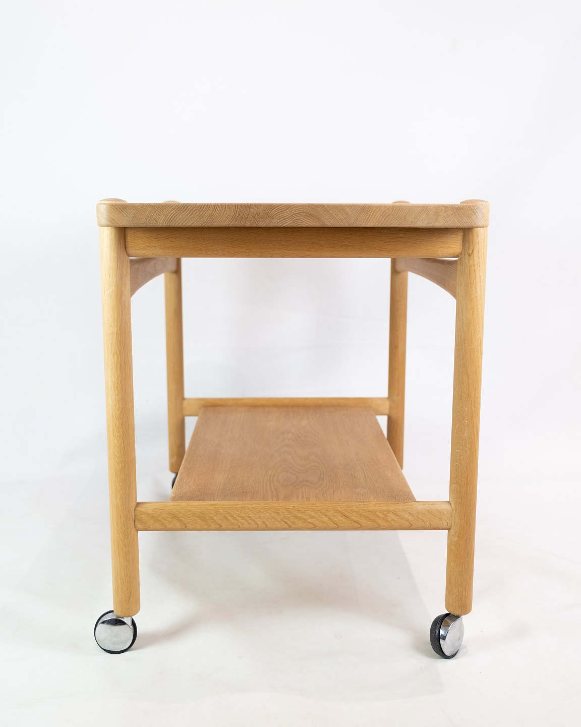 "AT 48" is the name of a serving trolley designed by Hans J. Wegner. The serving trolley is made of solid oak and has a reversible top, which makes it extra practical and functional. The underlying shelf also adds extra storage space, making the serving trolley ideal for serving and transporting various items.