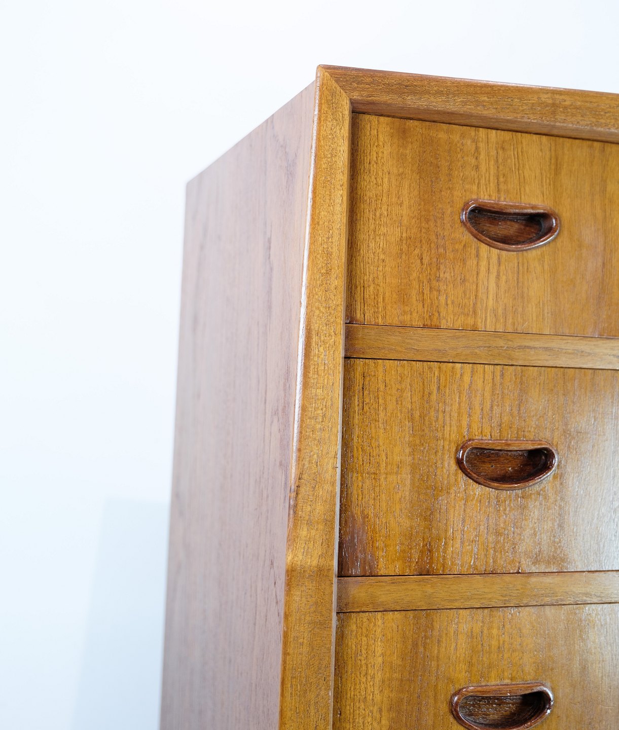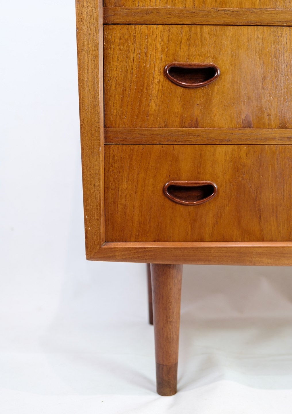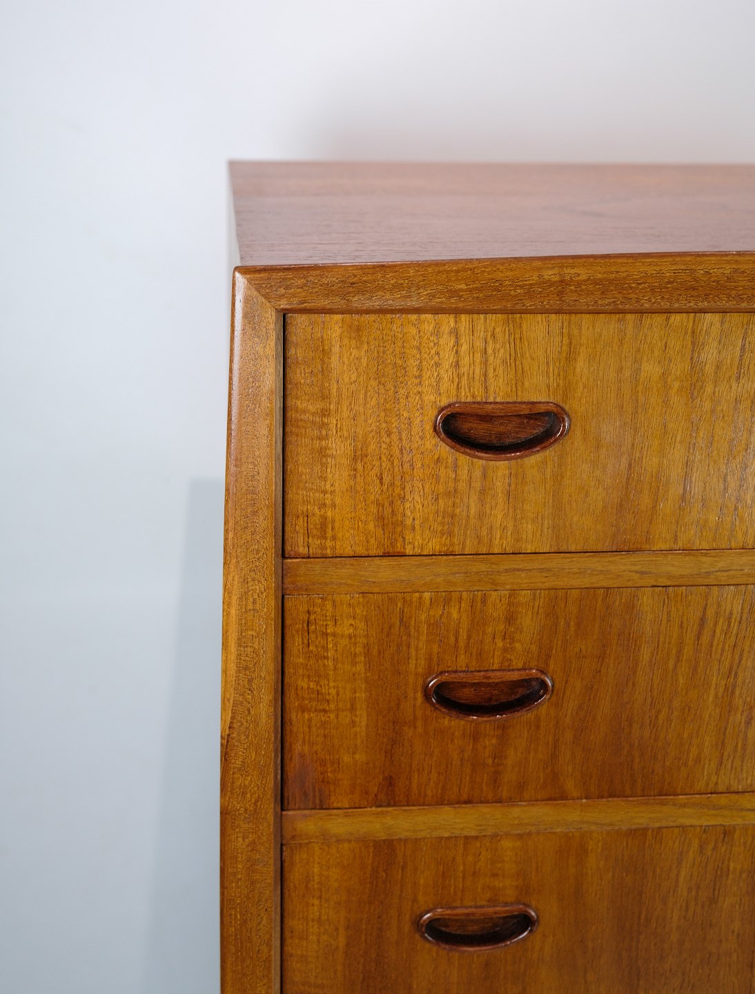 Teaktræet er kendt for sin naturlige skønhed, varme farver og holdbarhed, hvilket gjorde det til et foretrukket materiale til møbeldesign i denne æra. Kommoden vil sandsynligvis have enkle linjer og en elegant silhuet, der afspejler det tidløse og stilfulde design af 1960'erne.