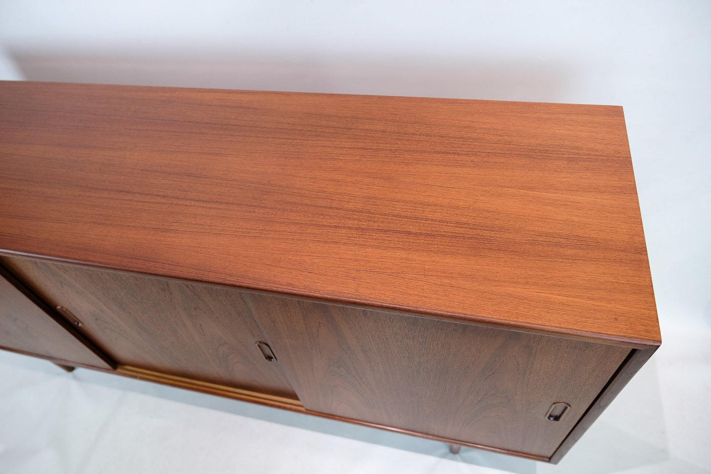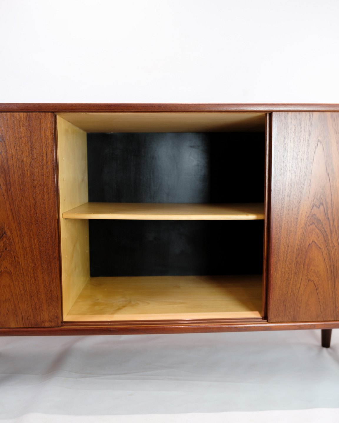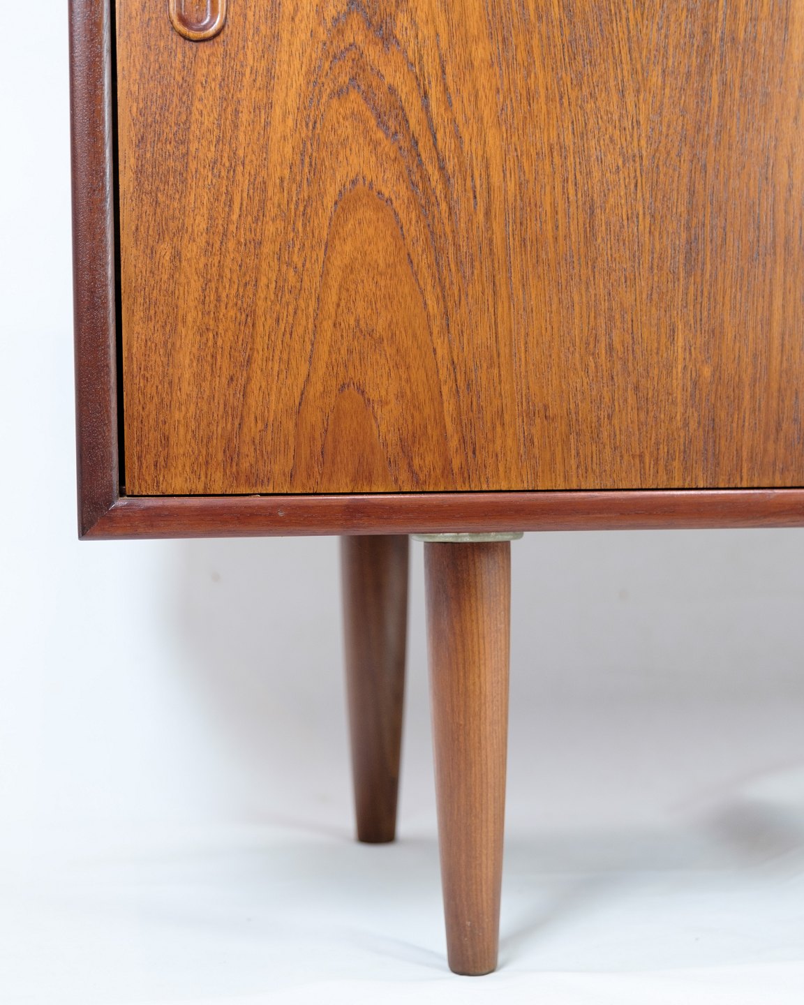 Skænken i teaktræ af dansk design fra omkring 1960'erne udstråler en tidløs æstetik og håndværksmæssig finesse. Det smukt udskårne teaktræ fremviser en varm og naturlig patina, der tilføjer karakter til enhver indretning.