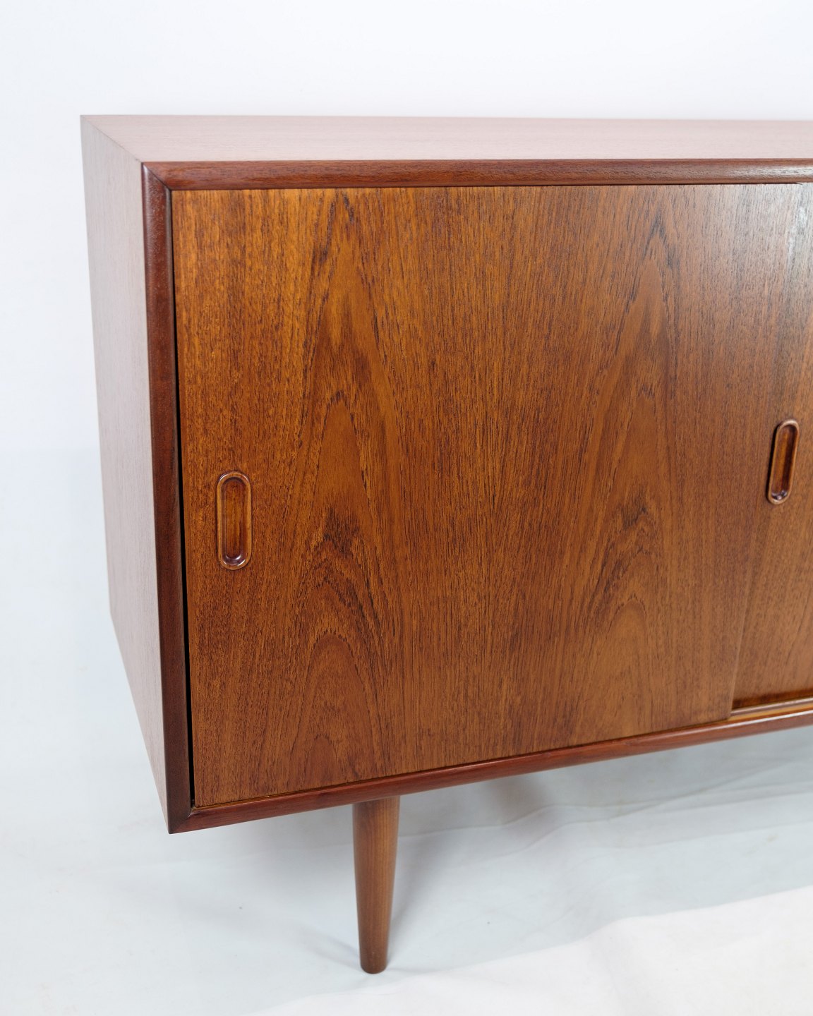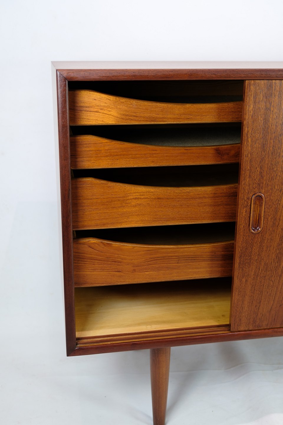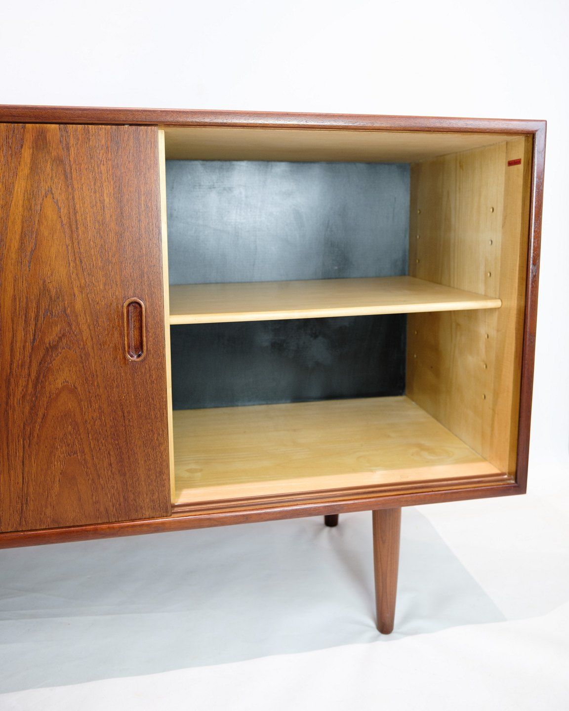 Skænken i teaktræ af dansk design fra omkring 1960'erne udstråler en tidløs æstetik og håndværksmæssig finesse. Det smukt udskårne teaktræ fremviser en varm og naturlig patina, der tilføjer karakter til enhver indretning.