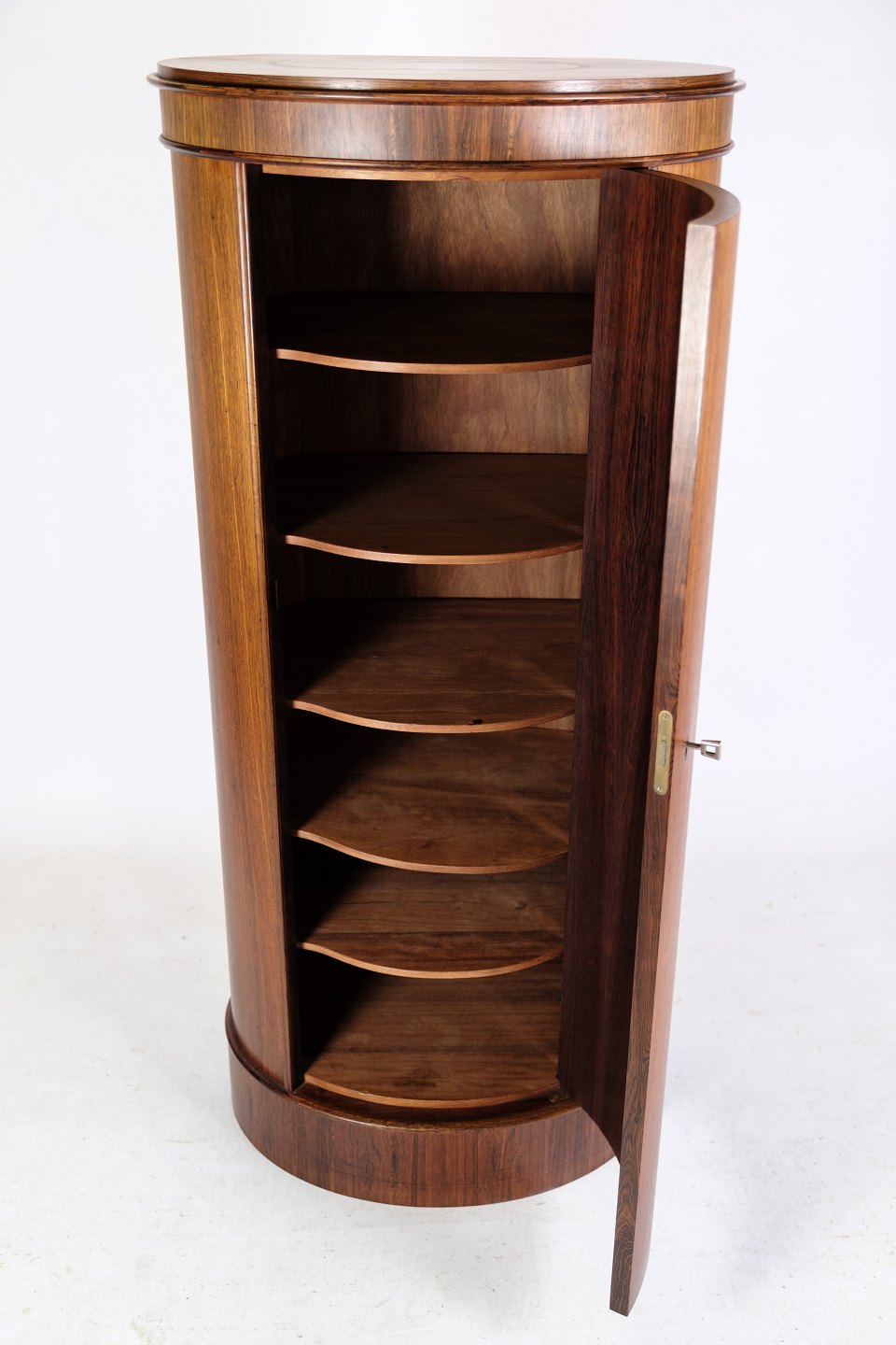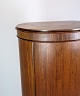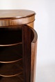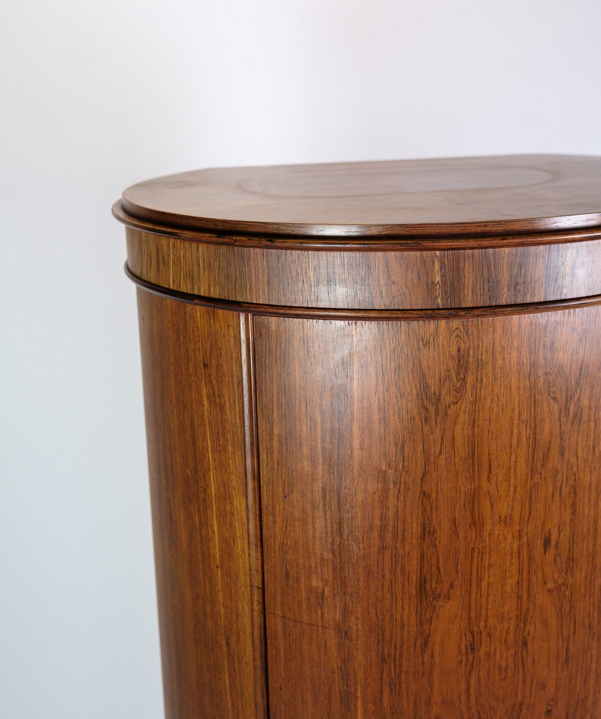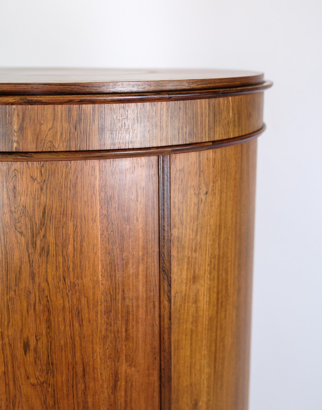 Dette ovalformede palisander piedestalskab, designet af Johannes Sorth for Bornholms Møbelfabrik omkring 1960'erne, udstråler en tidløs elegance og skønhed. Fremstillet af førsteklasses palisandertræ, er dette skab et smukt eksempel på dansk møbelhåndværk fra midten af det 20. århundrede.