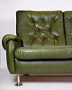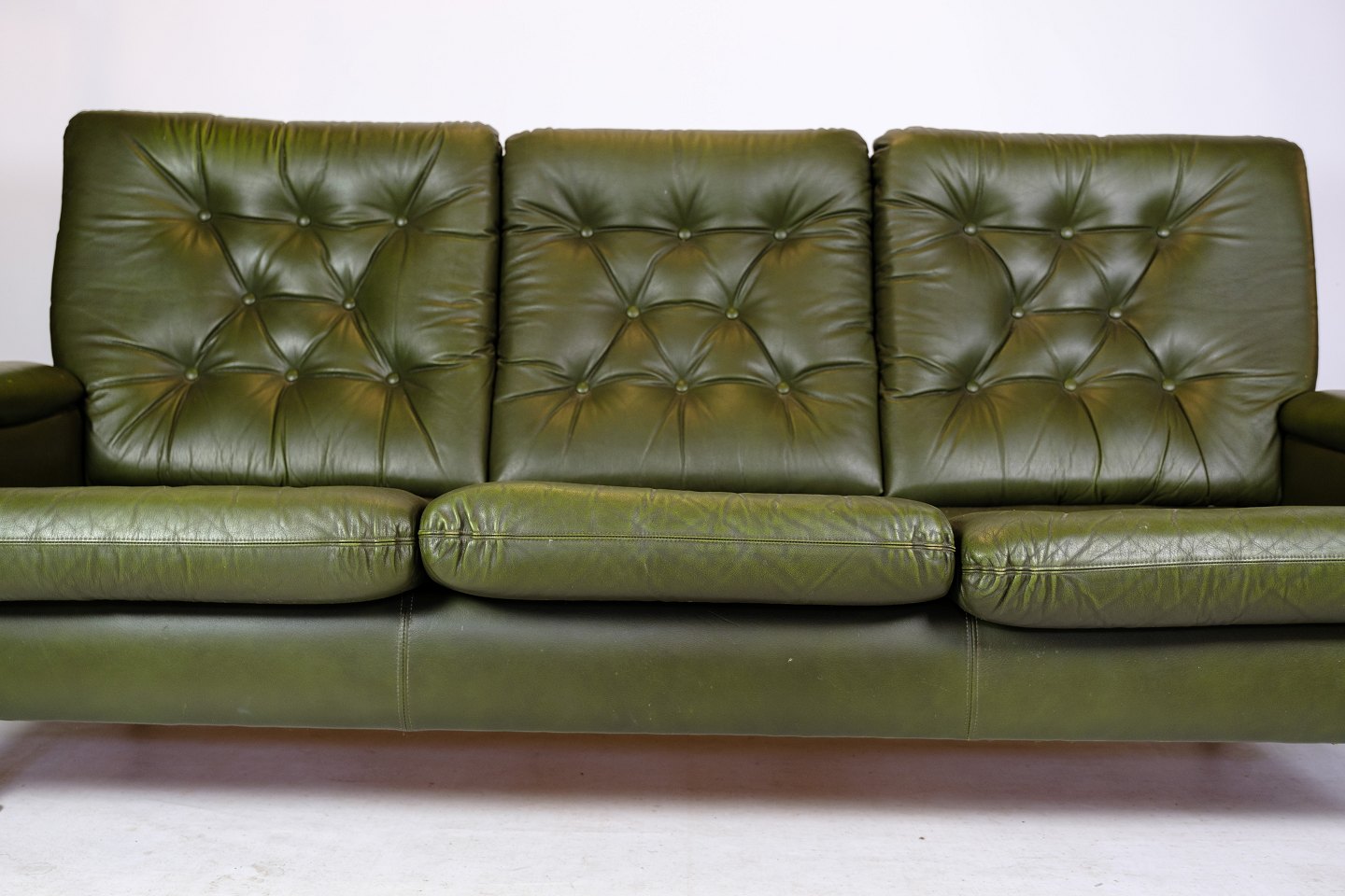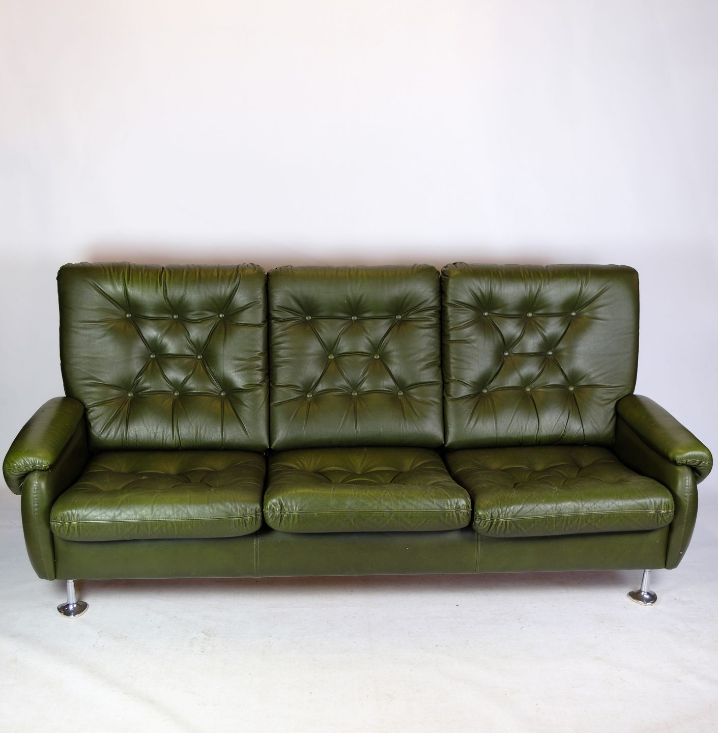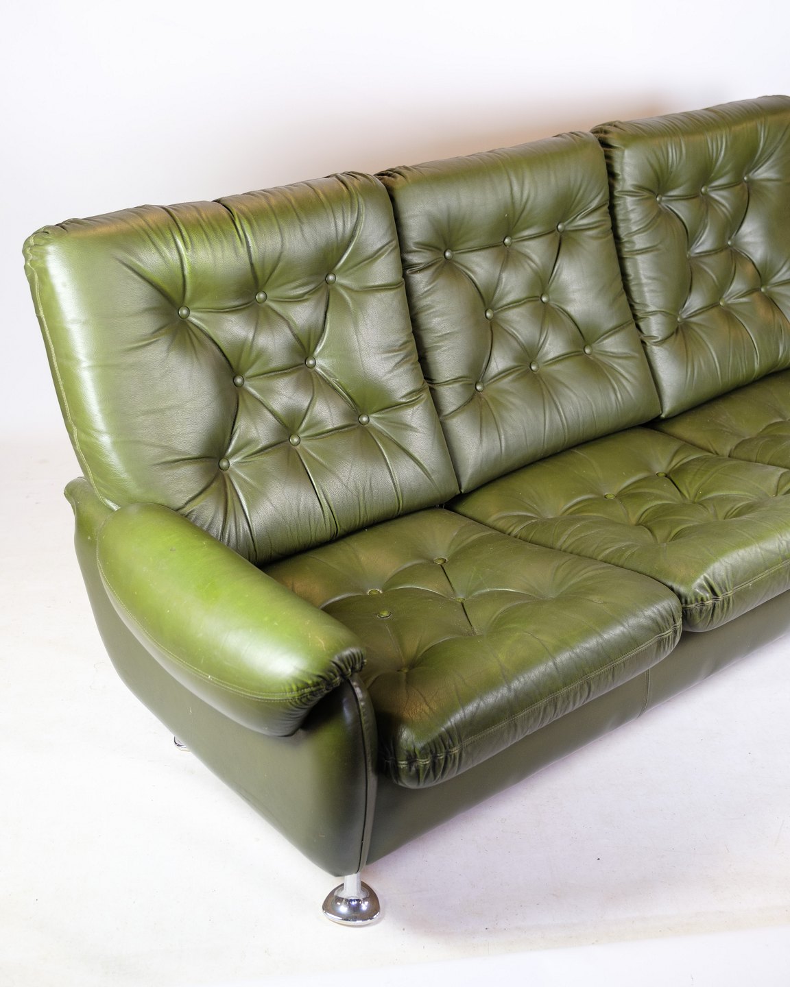 The 3-seater sofa in dark green leather with chrome legs from the early 1970s is a period and stylish piece of furniture that exudes a special elegance and luxury. The deep green color adds a touch of sophisticated charm to any living room or lounge, while the leather provides a sense of warmth and comfort.