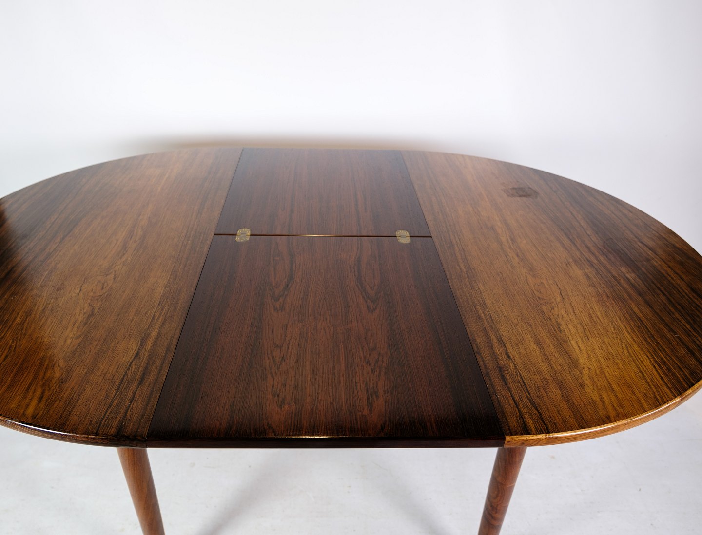 SoldTeak dining table with built-in additional plate and round legs of Danish design from around the 1960s.