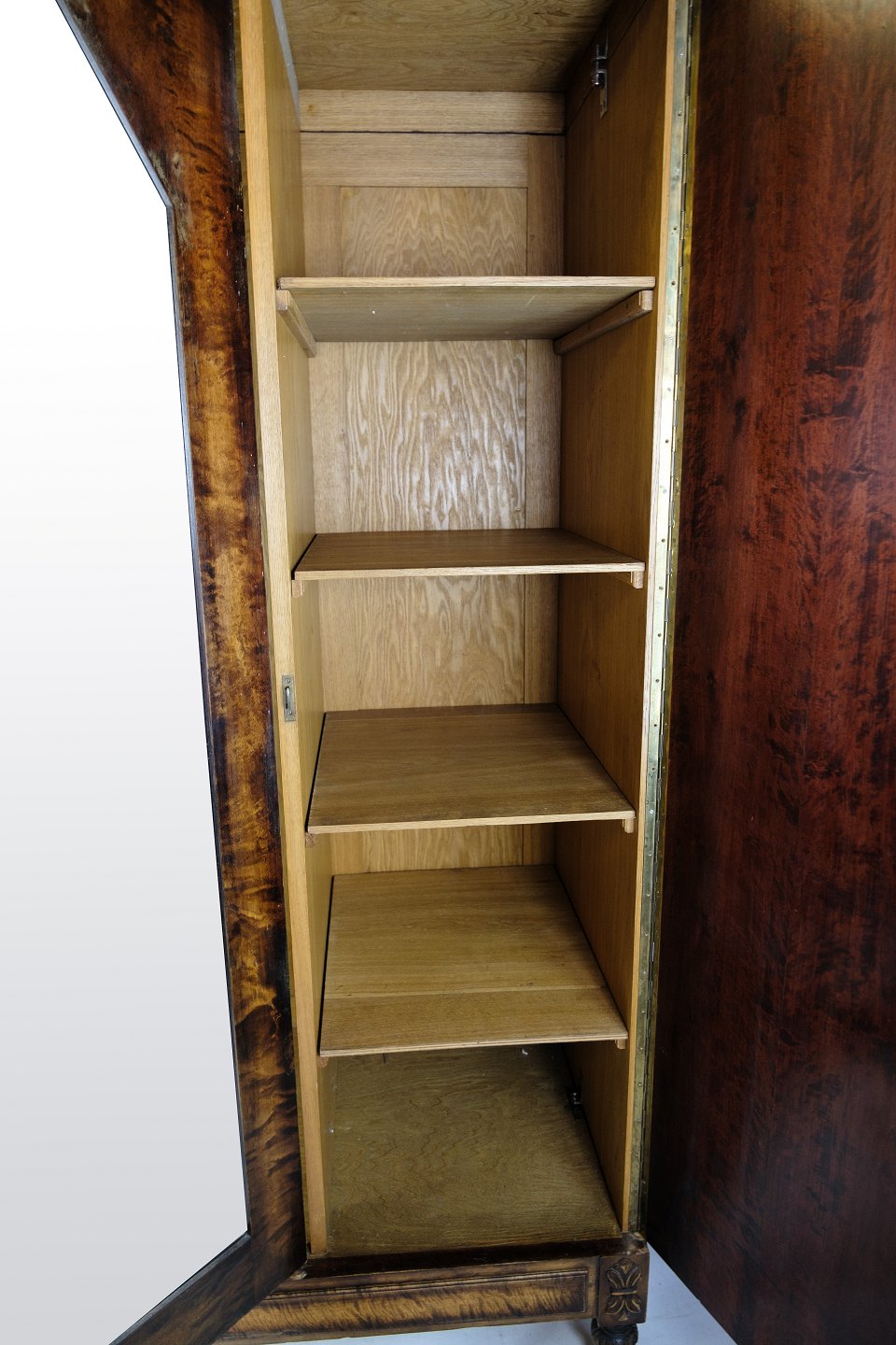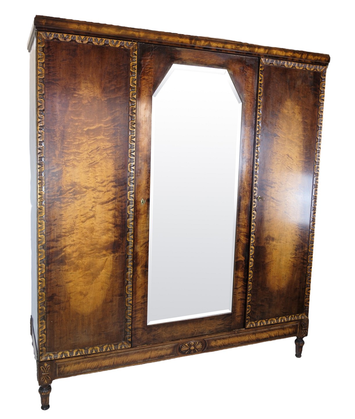 SolgtKlædeskab i poleret birketræ med facetslebet spejl i midten og 3 låger og hylder fra omkring år 1930'erne.