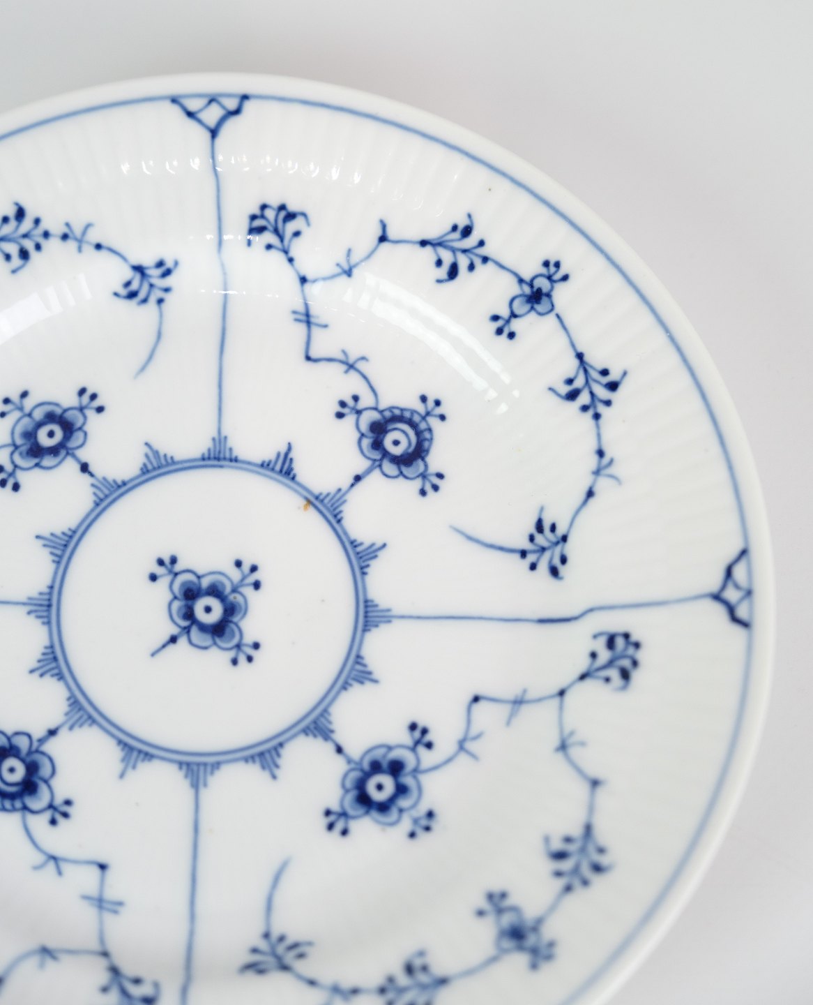 SolgtRoyal Copenhagen Musselmalet Riflet 180-1 sidetallerken er en smuk og klassisk del af den ikoniske Musselmalet Riflet-serie, der har prydet bordene i generationer.