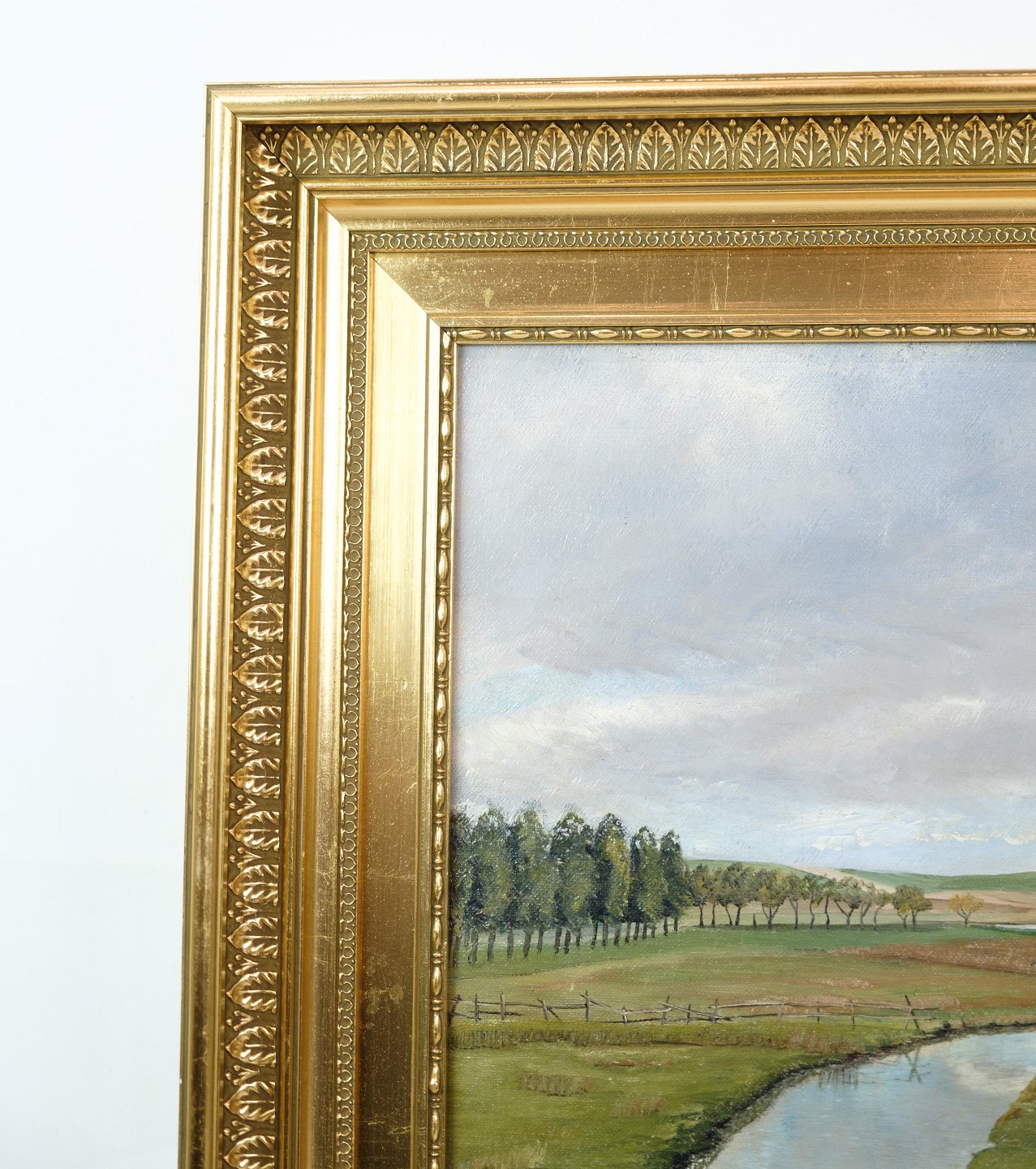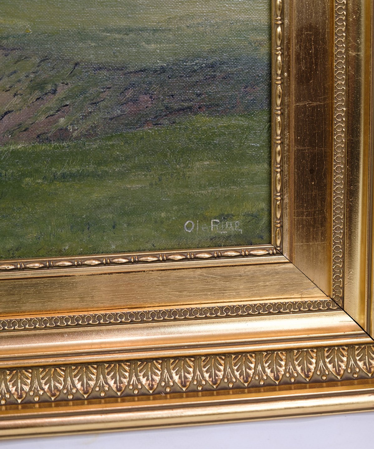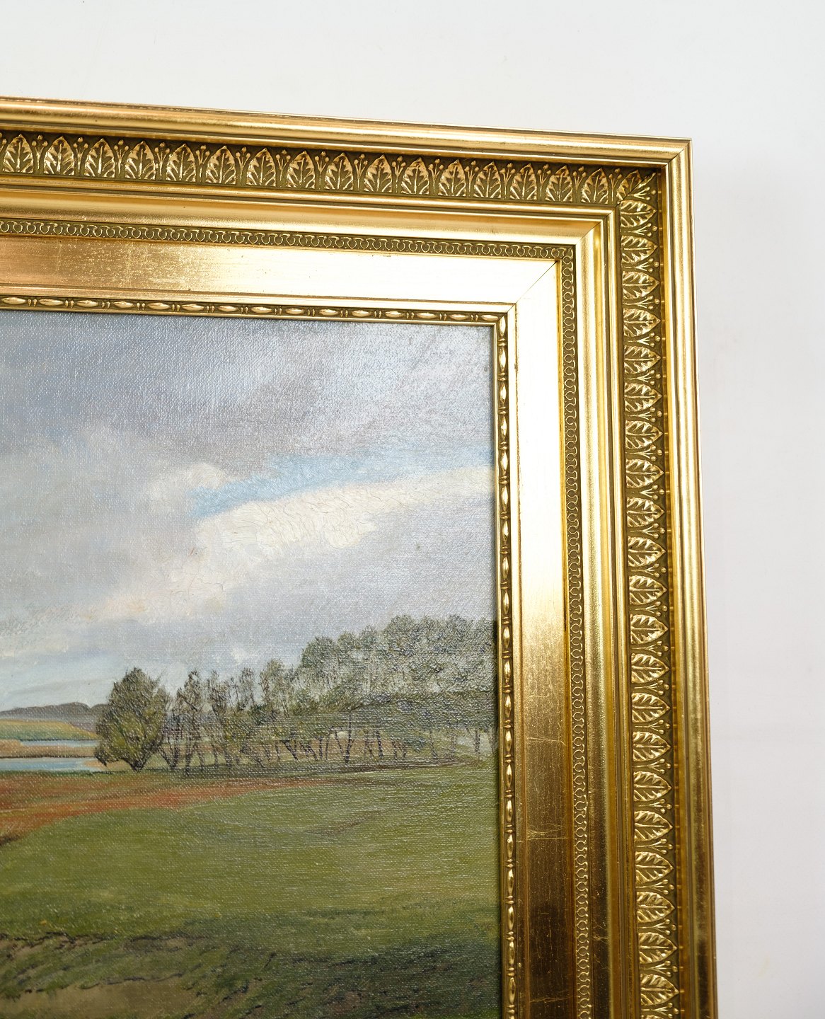 SolgtLandskabsmaleri med ramme af bladguld malet af kunstneren Ole Ring (f.1902-d.1972), som holdte til i Roskilde, Danmark området. Billedet illustrere formodeligt landskabet omkring Boserup skov, som er skrevet på bagsiden.