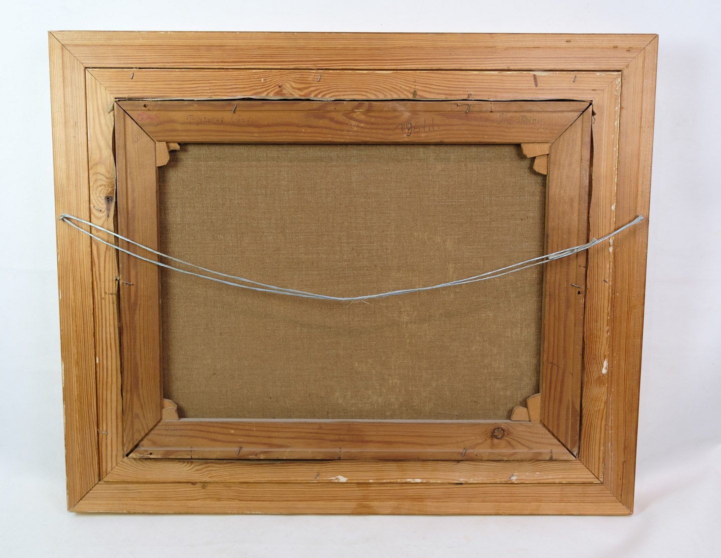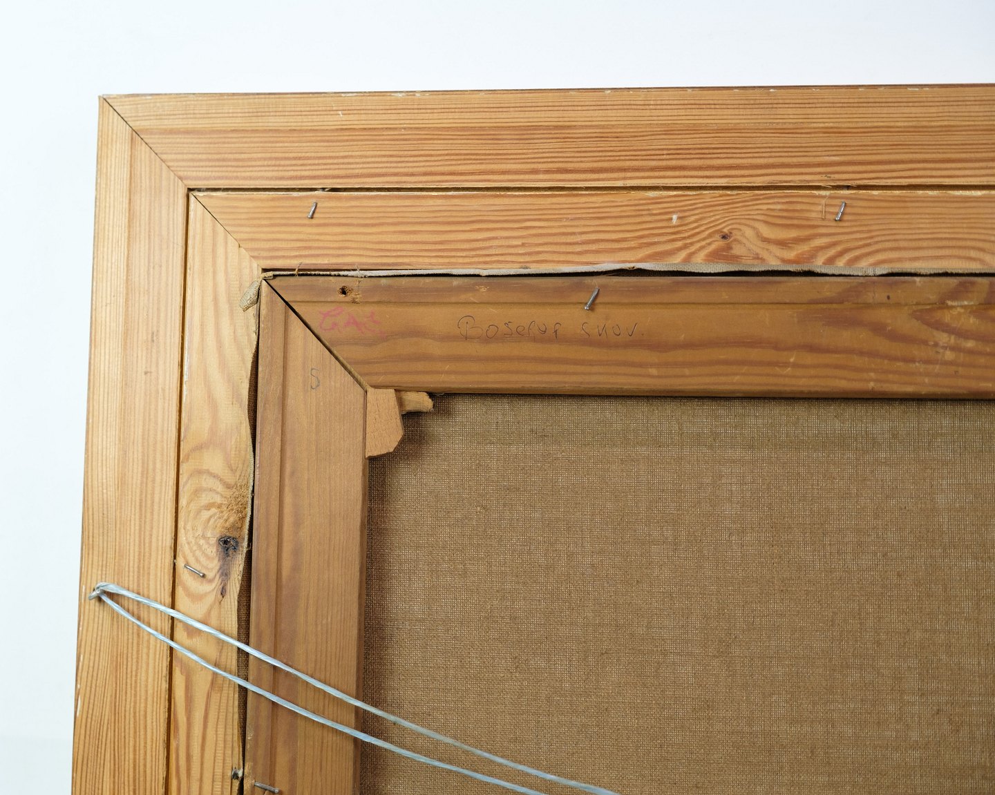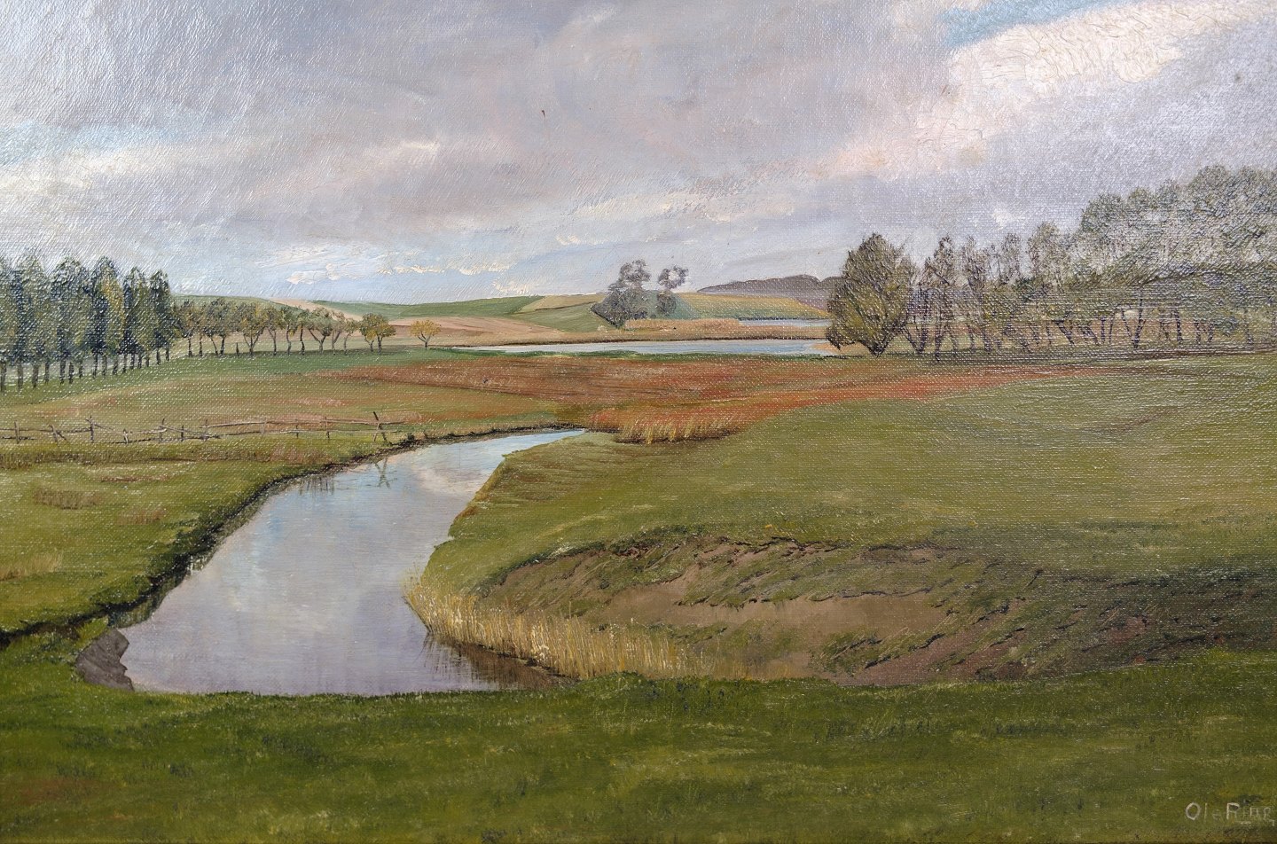 SolgtLandskabsmaleri med ramme af bladguld malet af kunstneren Ole Ring (f.1902-d.1972), som holdte til i Roskilde, Danmark området. Billedet illustrere formodeligt landskabet omkring Boserup skov, som er skrevet på bagsiden.