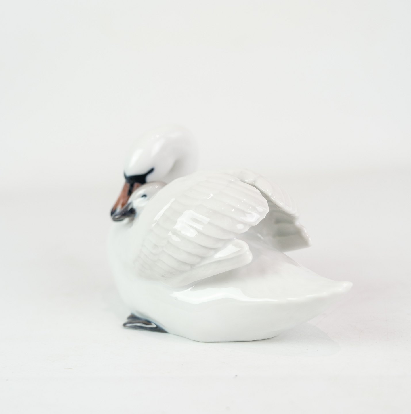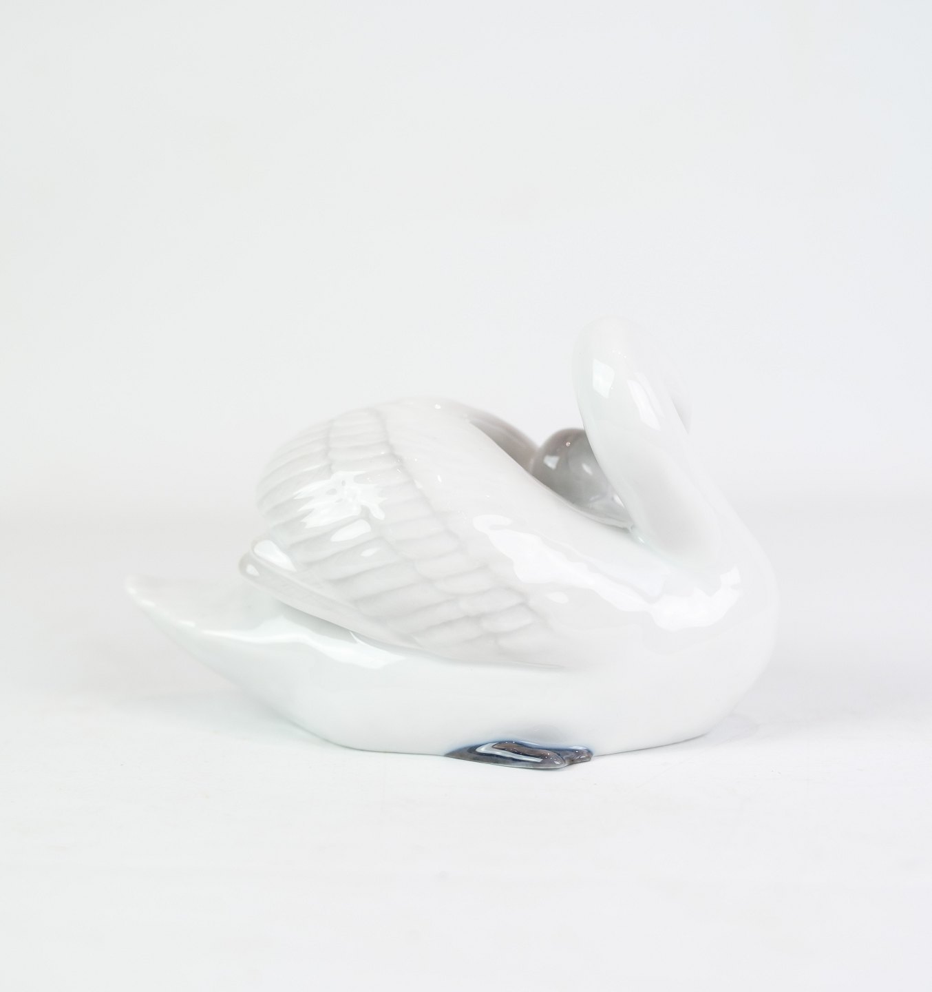 This figure was designed by Allan Therkelsen, who is a recognized Danish artist. The underglaze decoration used for this figure allows fine detail and color to be incorporated into the porcelain, bringing to life the natural beauty of the swan and its young.