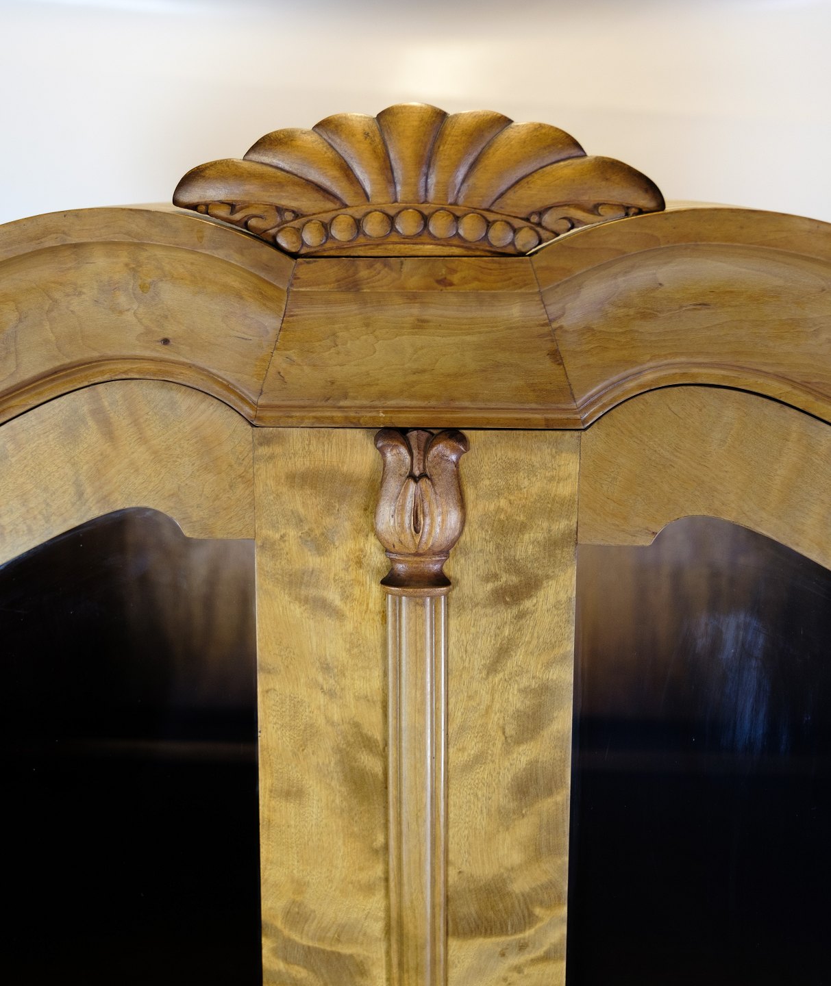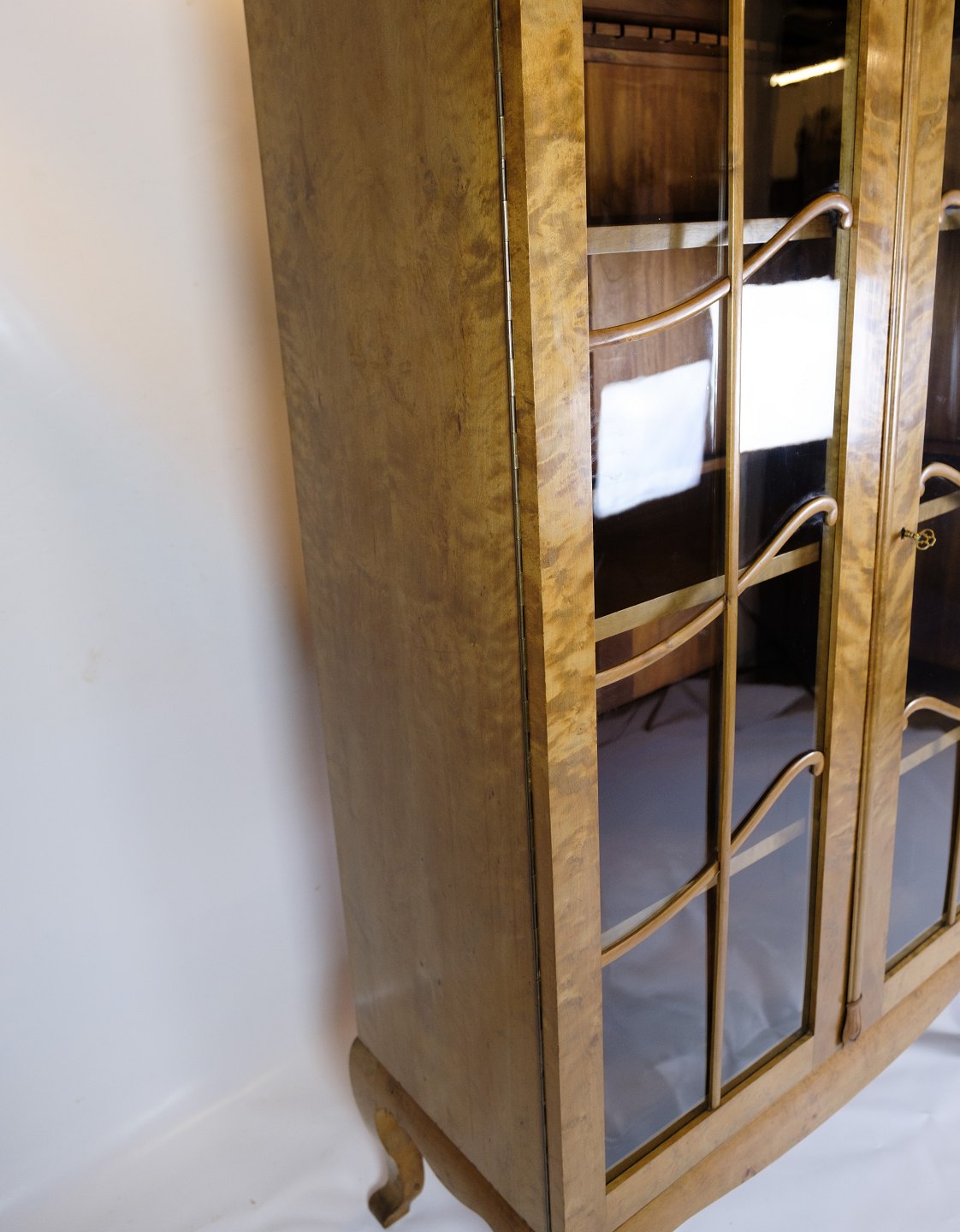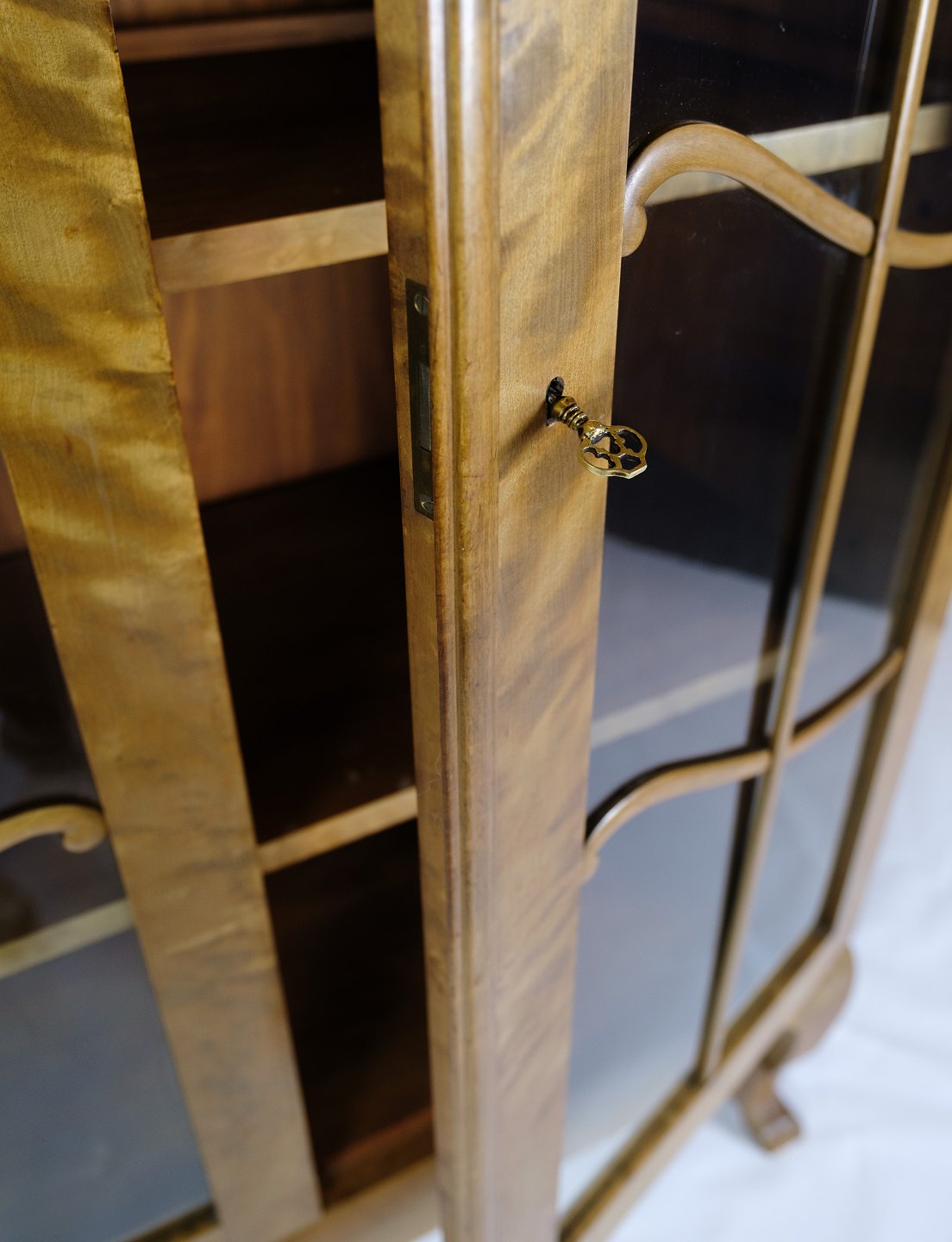 SolgtVitrineskab af birketræ med 3 hylder og glasruder fra omkring år 1920'erne.