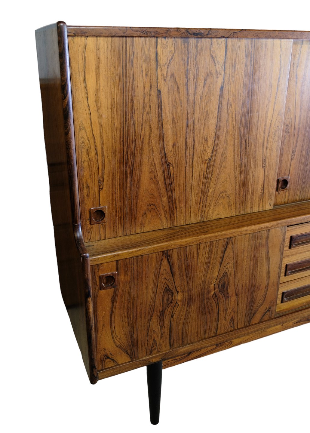 Skænken i palisander udstråler en tidløs elegance med sit smukt udskårne træ og rene linjer. Den høje konstruktion giver rigelig opbevaringsplads, hvilket gør den ideel til brug som et funktionelt møbel i ethvert hjem.