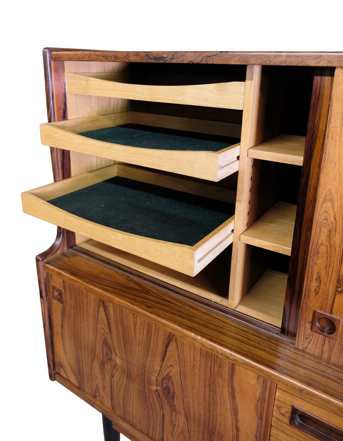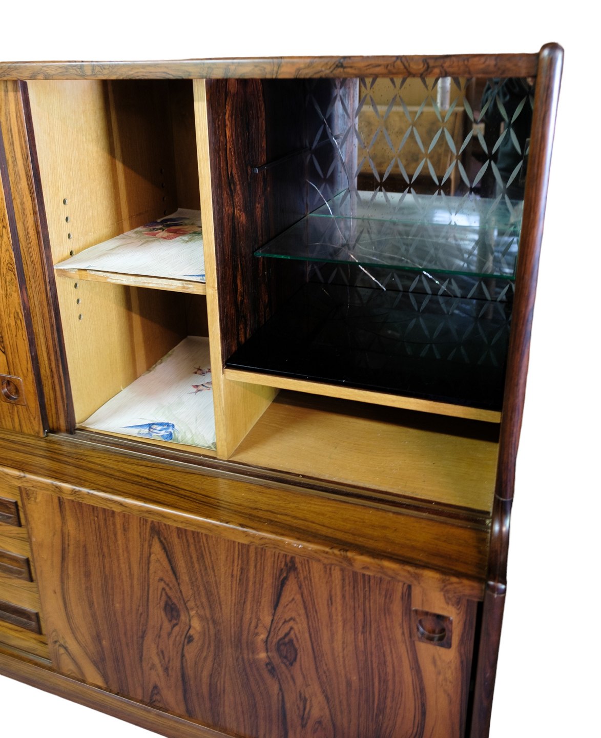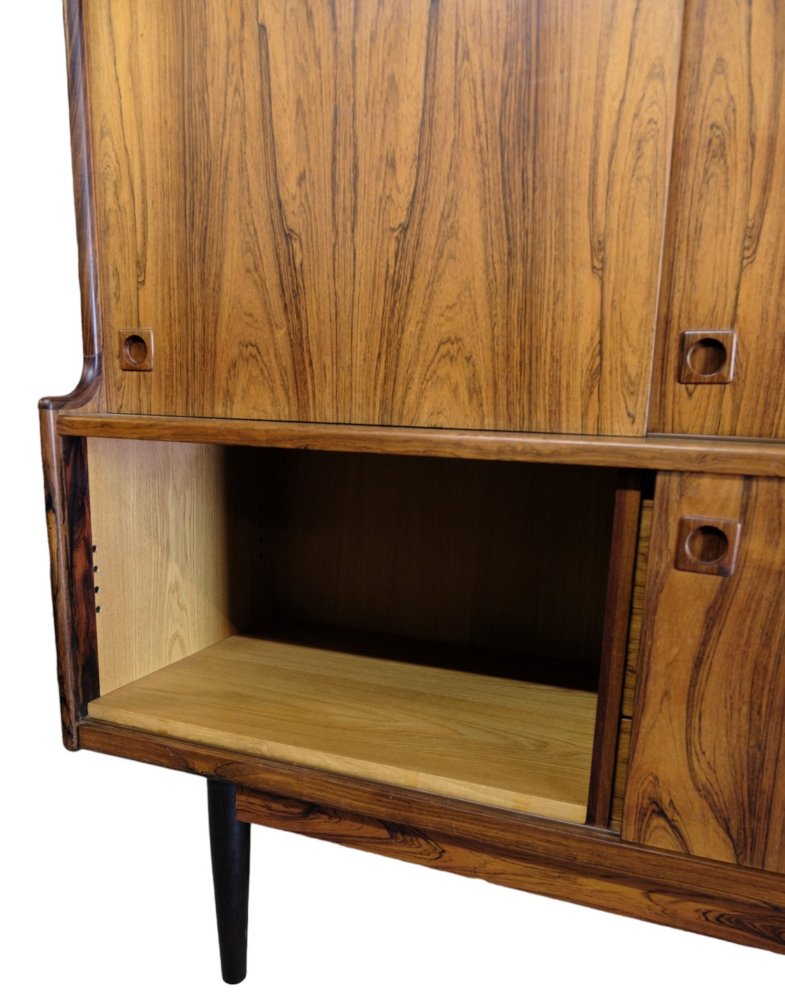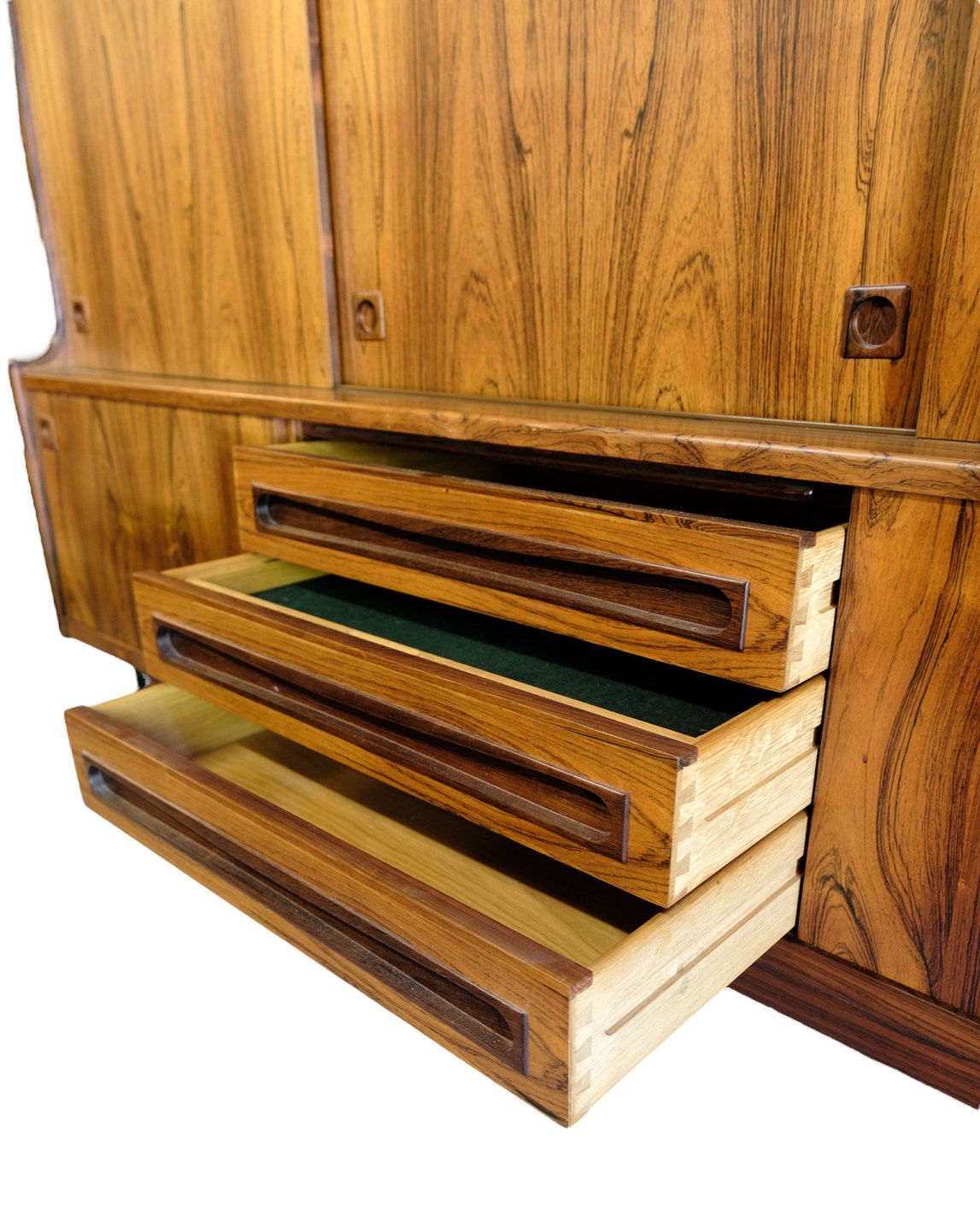 Den høje skænk i palisander, designet af Johannes Andersen og produceret af Skaaning Møbelfabrik omkring 1960'erne, er et imponerende eksempel på dansk møbelkunst fra denne periode.