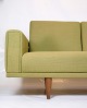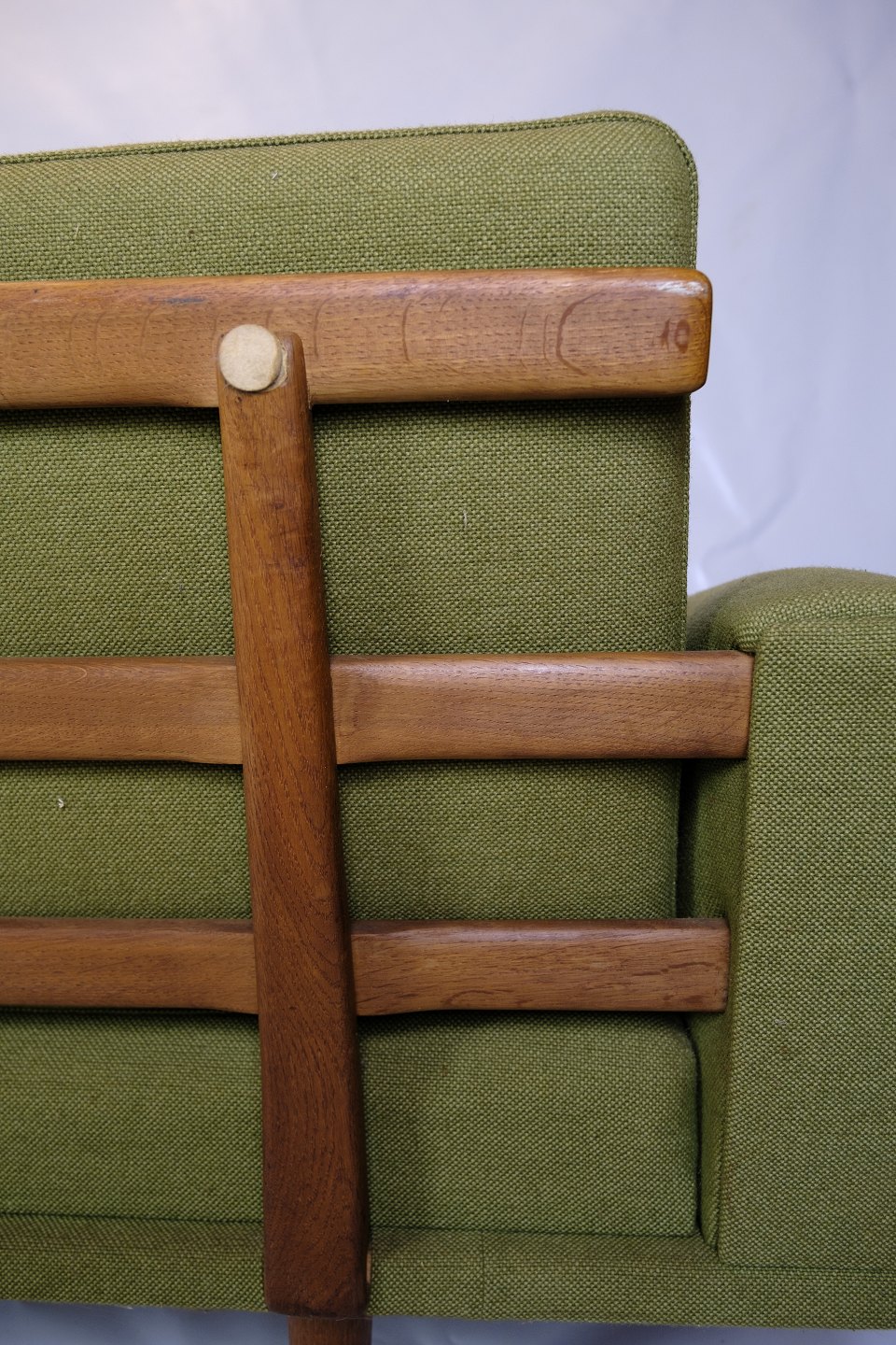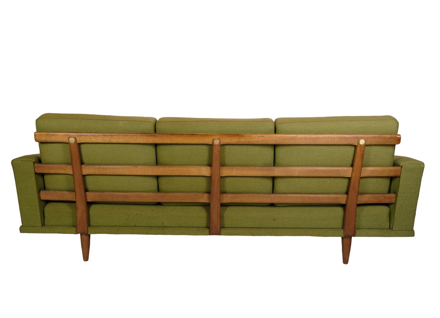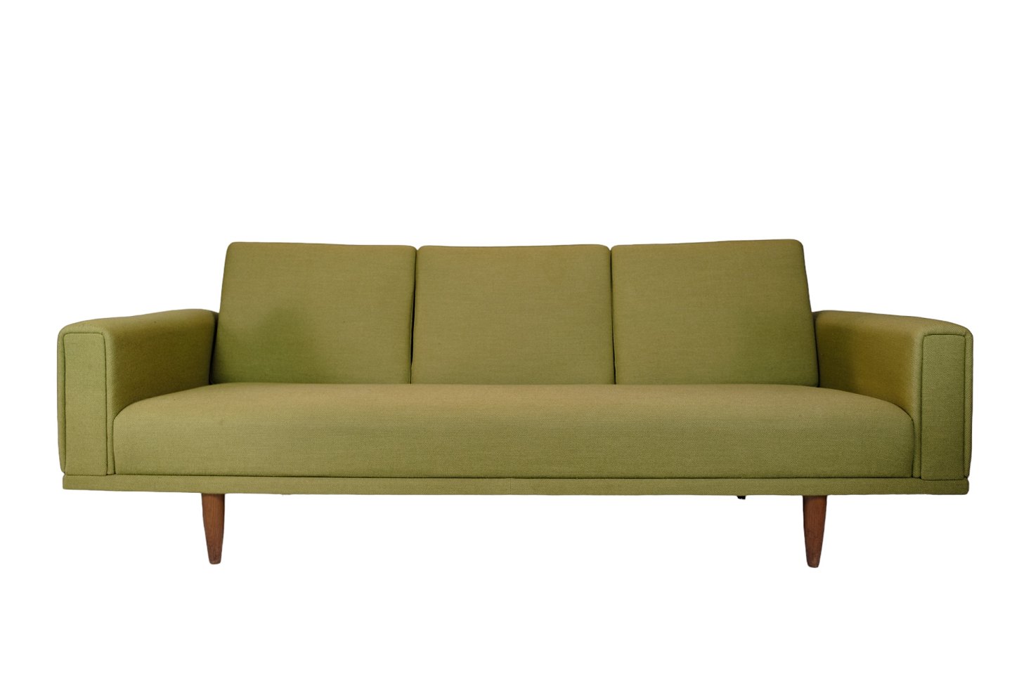 3-personers sofaen, designet af Illum Wikkelsø i 1960'erne, er et smukt eksempel på dansk møbeldesign fra denne æra. Sofaen er betrukket med et elegant grønt stof, der tilføjer et strejf af farve og varme til ethvert rum. De runde ben giver et organisk udtryk, mens bagbeklædningen af egetræ tilføjer et naturligt og tidløst element til designet.