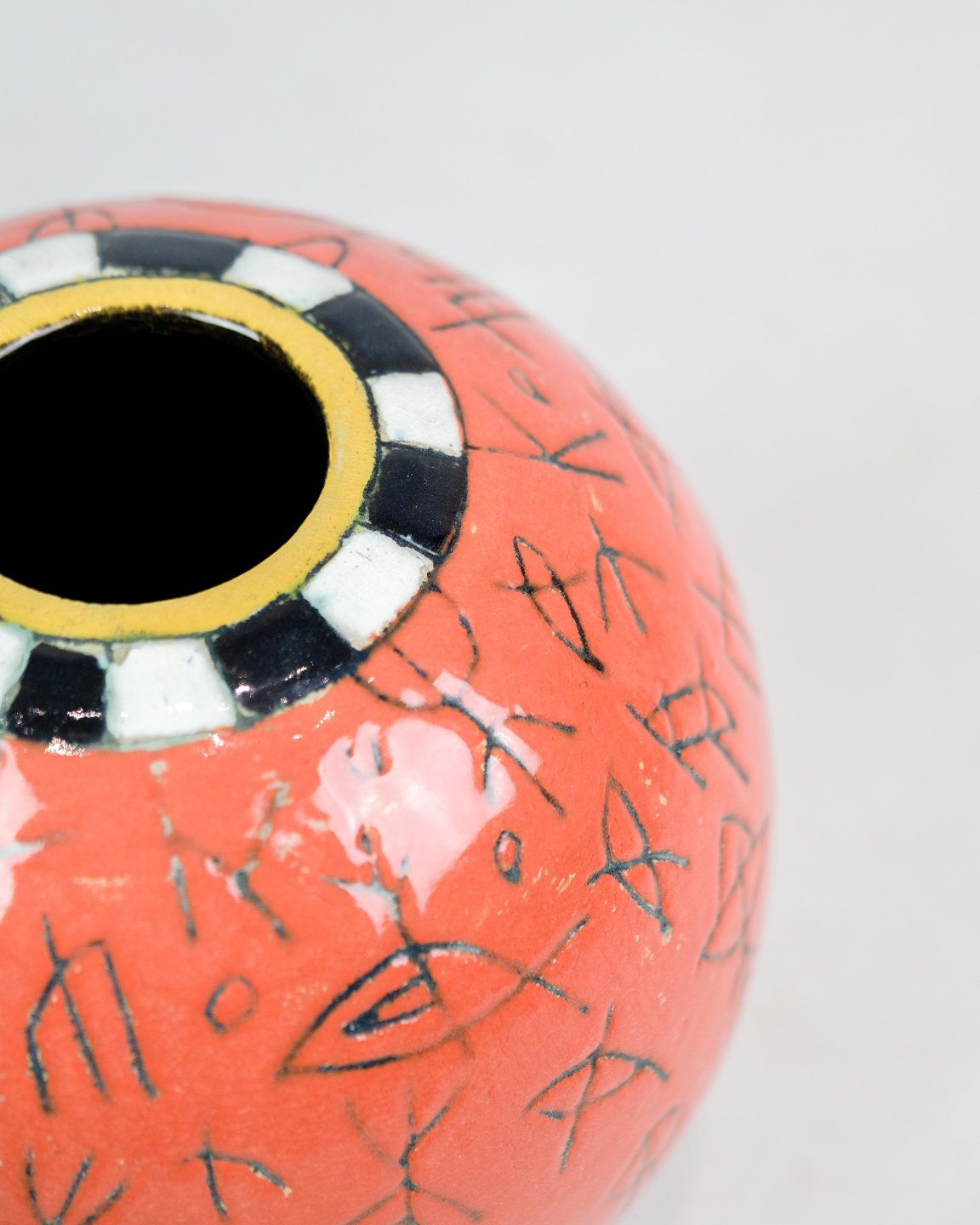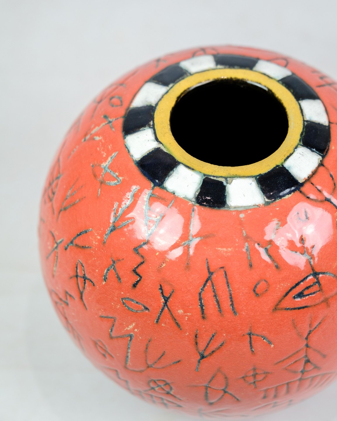SoldLene Regius' round vase with black and white top, orange glaze and black patterned engravings from around the 1980s represents a unique period in ceramic design. The vase combines different colors and patterns to create a characteristic expression, typical of the time and the artist's style.