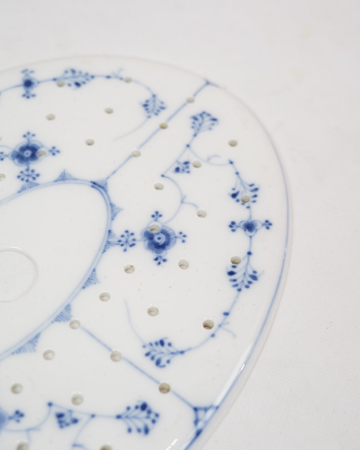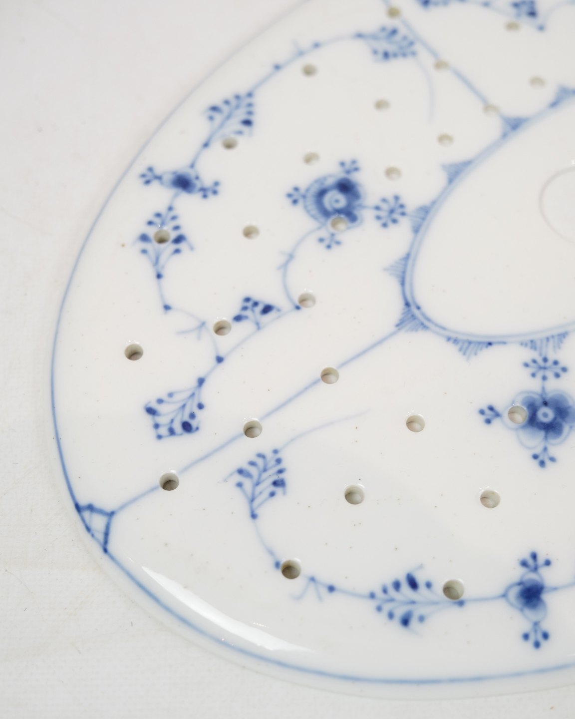 Det ovale Royal Copenhagen Musselmalet løse fiskerist til fiskefadet (Dekorationsnummer 1/110) er en smuk og funktionel tilføjelse til dit porcelænssæt. Dette løse fiskeri er designet specielt til at supplere fiskefadet og tilføjer et unikt og dekorativt touch til din borddækning.