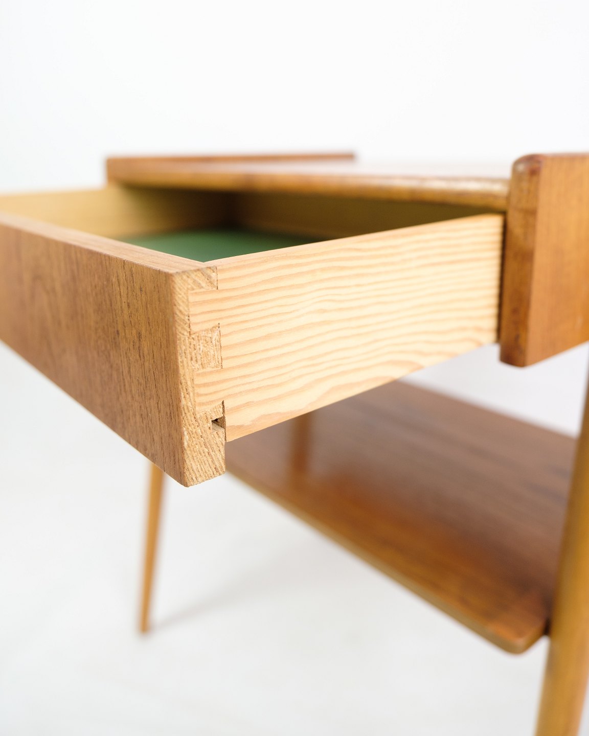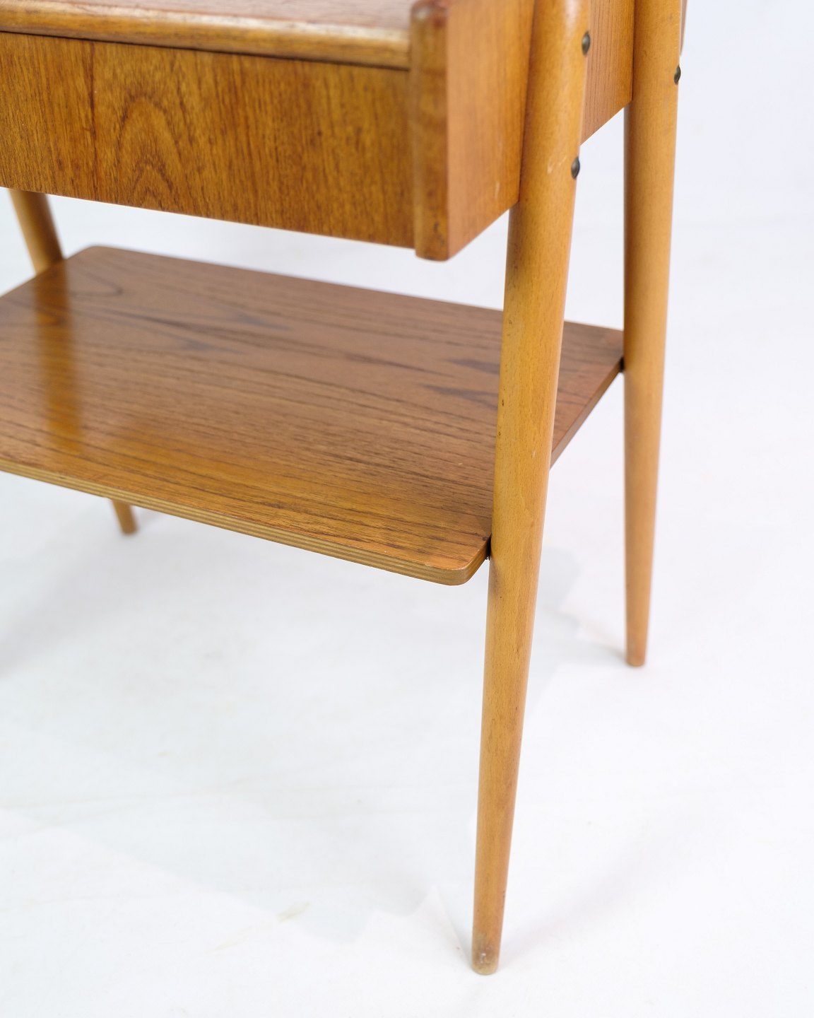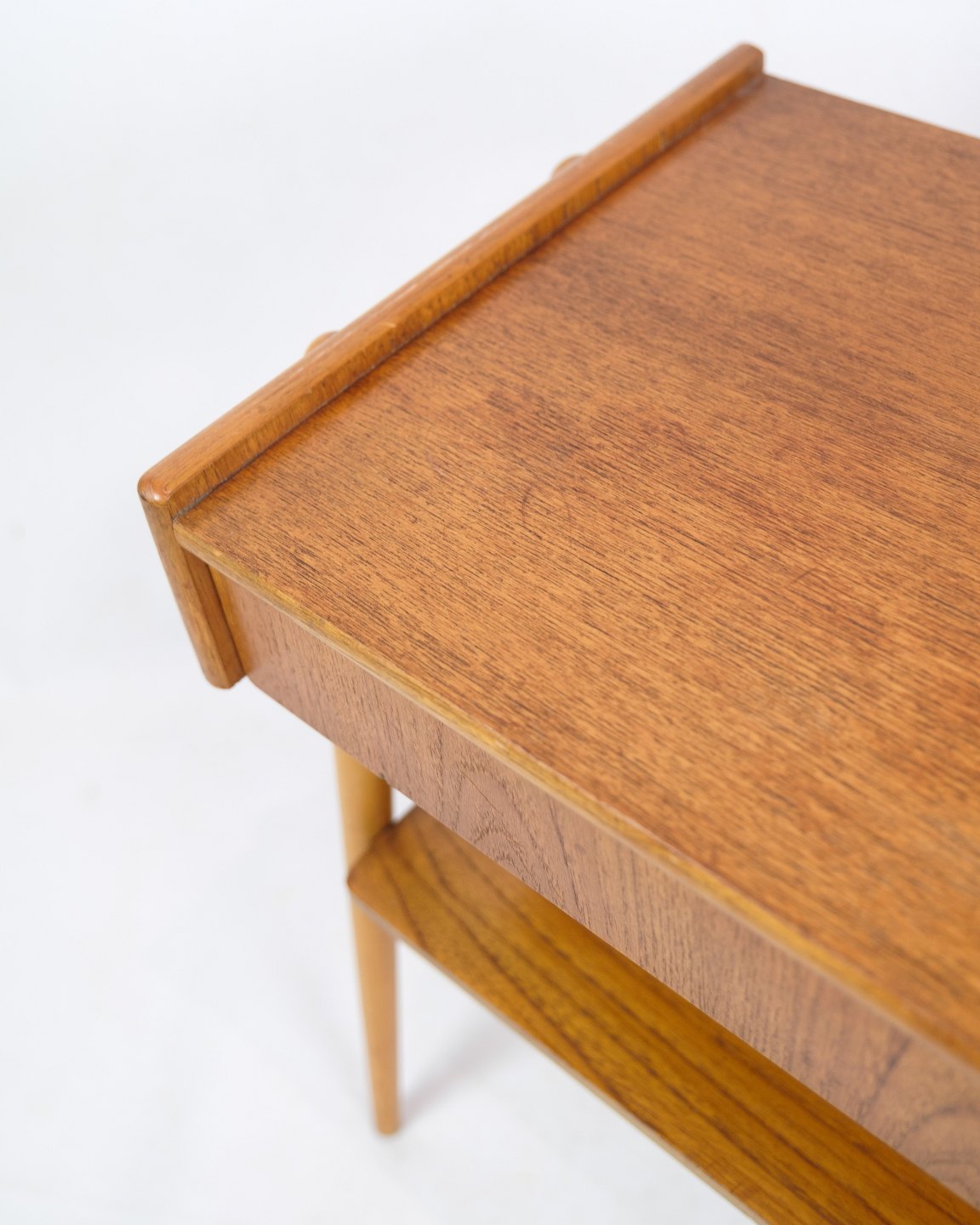 Sæt af natborde på ben med skuffe og hylde, fremstillet af AB Carlström & Co møbelfabrik i Sverige fra 1950'erne. Disse natborde repræsenterer det tidløse og funktionelle design, der kendetegner skandinavisk møbelkunst fra perioden. Benstrukturen giver et let og luftigt udseende, mens skuffen og hylden tilbyder praktisk opbevaringsplads. Producenten, AB Carlström & Co, var kendt for at skabe kvalitetsmøbler.