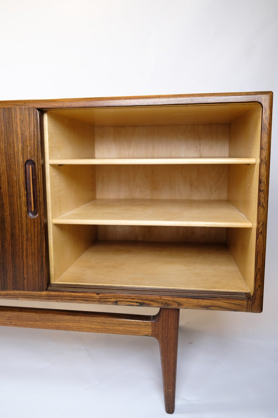 The sideboard is an impressive example of Danish furniture art from the 1960s, where rosewood was used to create beautiful and functional furniture. Rosewood and the solid rosewood legs give the sideboard an elegant and timeless appearance that fits perfectly into a modern interior.