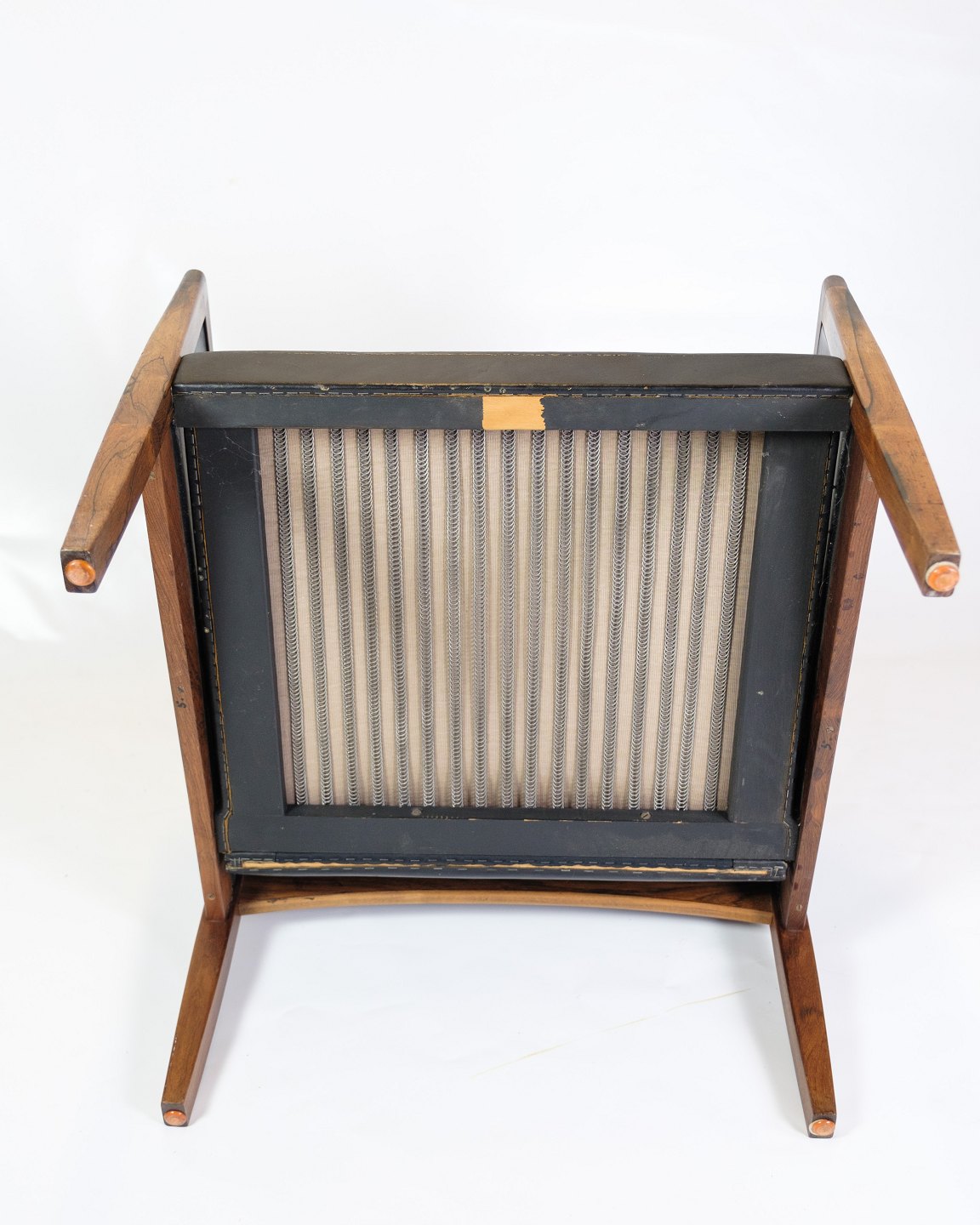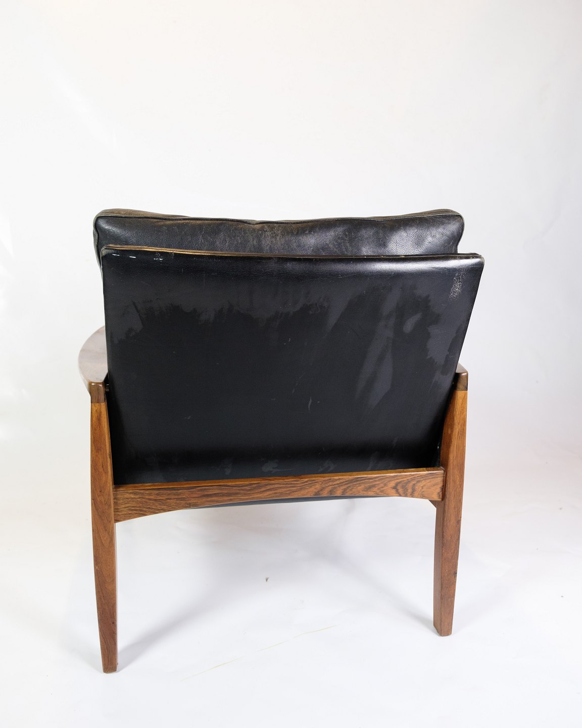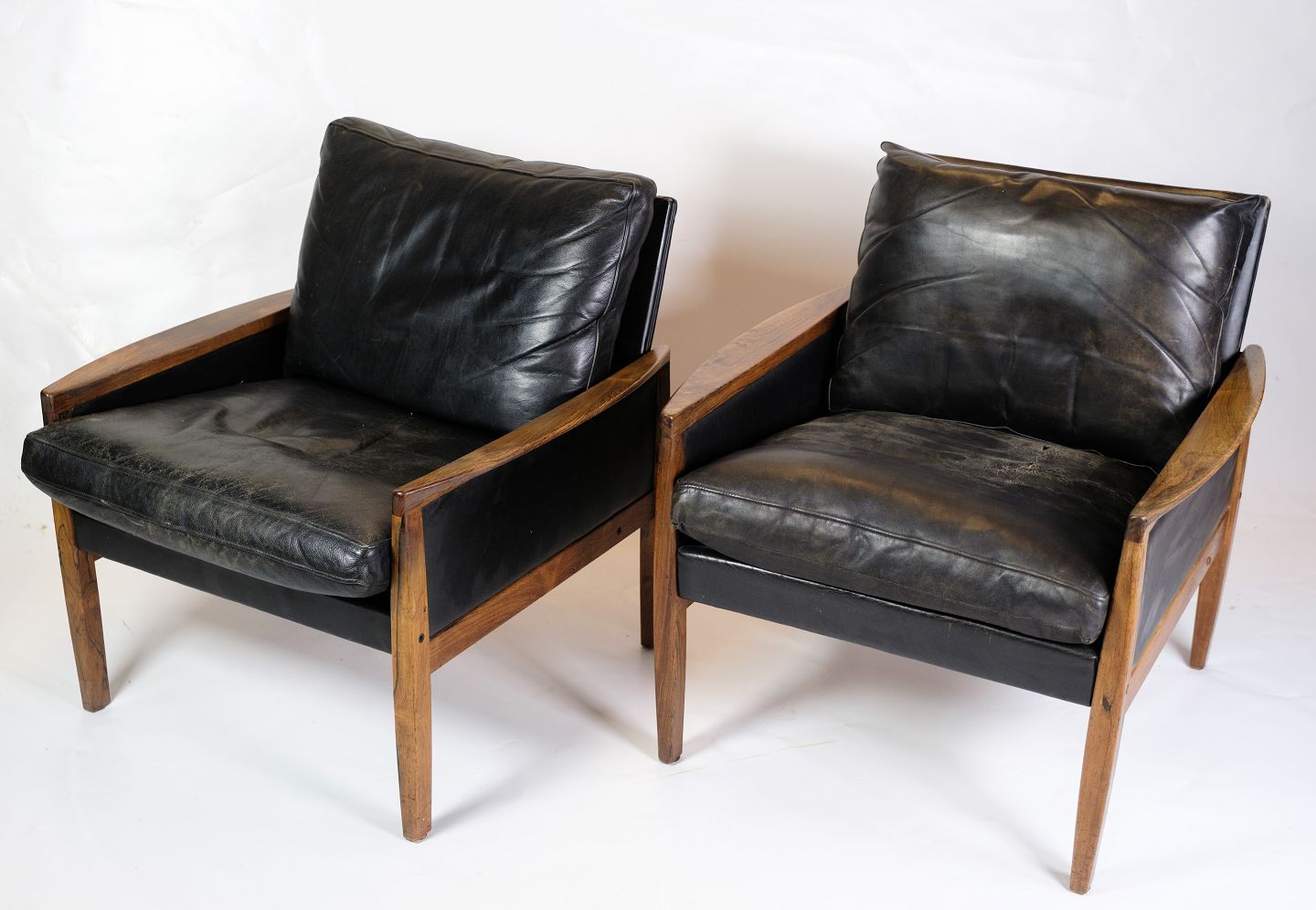 SoldThis set of two elegant armchairs in rosewood with black leather cushions exudes classic Danish design at its finest. The rich color and beautiful grain of the rosewood gives these chairs a luxurious and timeless elegance, while the soft, black leather ensures a comfortable sitting experience.