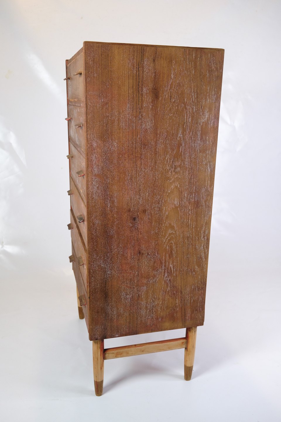 This chest of drawers is a beautiful example of Danish design from the 1960s, created by the talented designer Poul M. Volther for FDB. Crafted from teak wood and supported by elegant oak legs, this chest of drawers exudes a timeless charm and simplicity that fits perfectly with any modern decor.