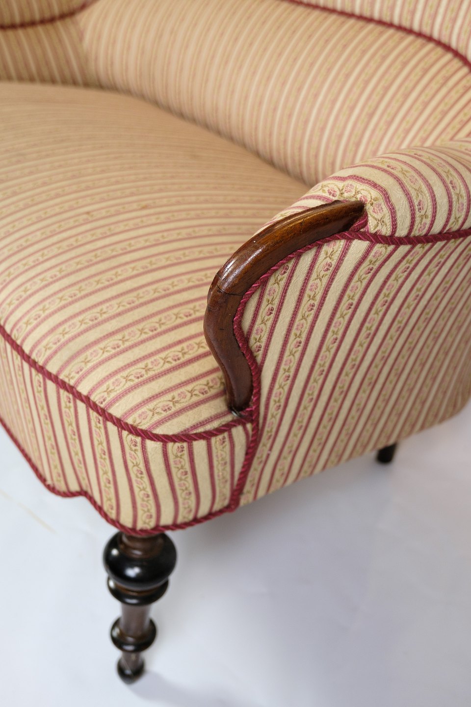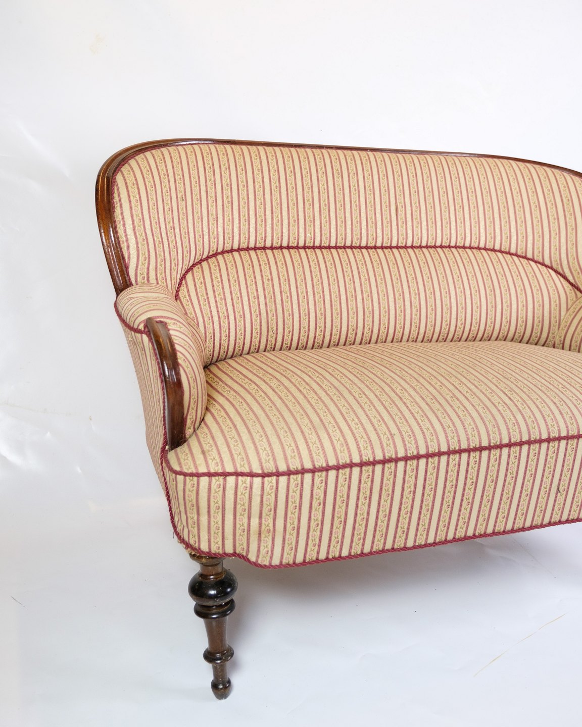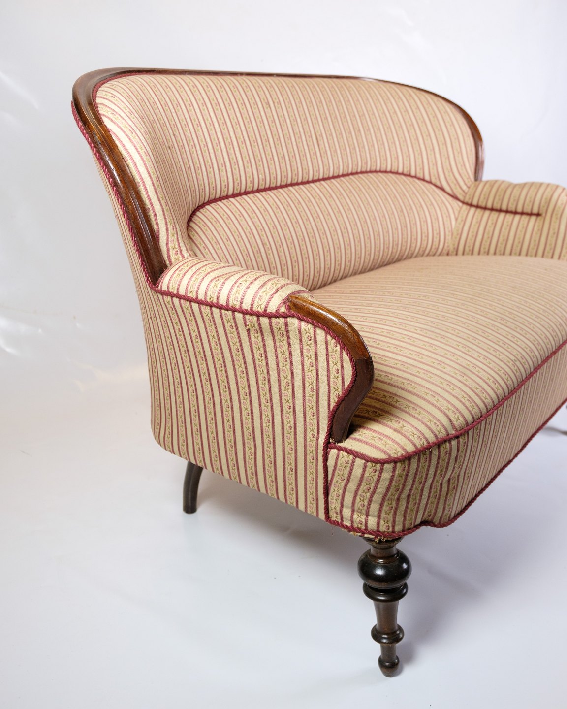 SoldThis antique two-seater sofa from approx. 1890 is a fine example of period craftsmanship and elegance. Made of mahogany wood, the sofa exudes a timeless charm and durability. Upholstered in a beautifully patterned fabric, it adds a touch of elegance and personality to any decor. With its older age, the sofa wears an authentic patina that only adds to its unique appeal. The comfortable seating makes it perfect for relaxing and socializing.