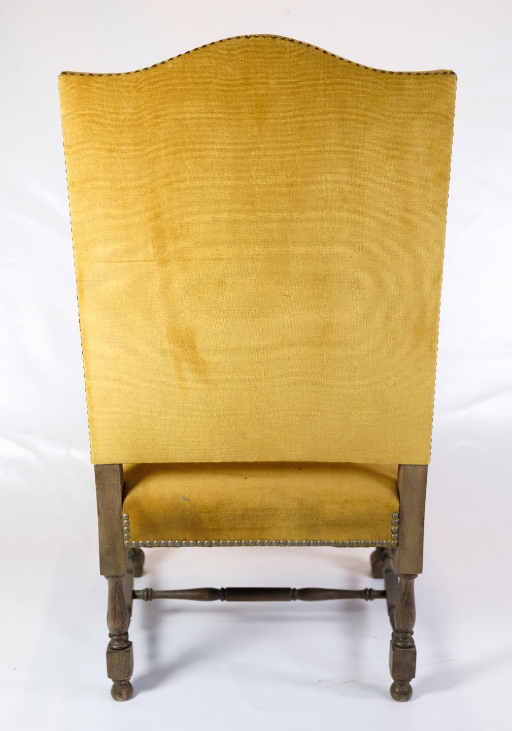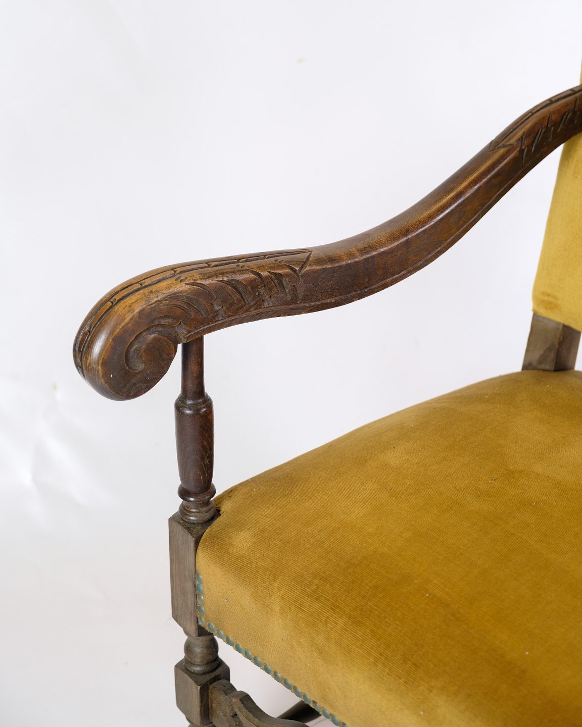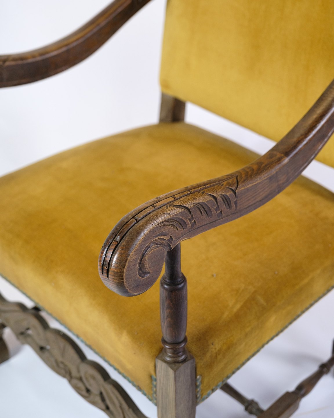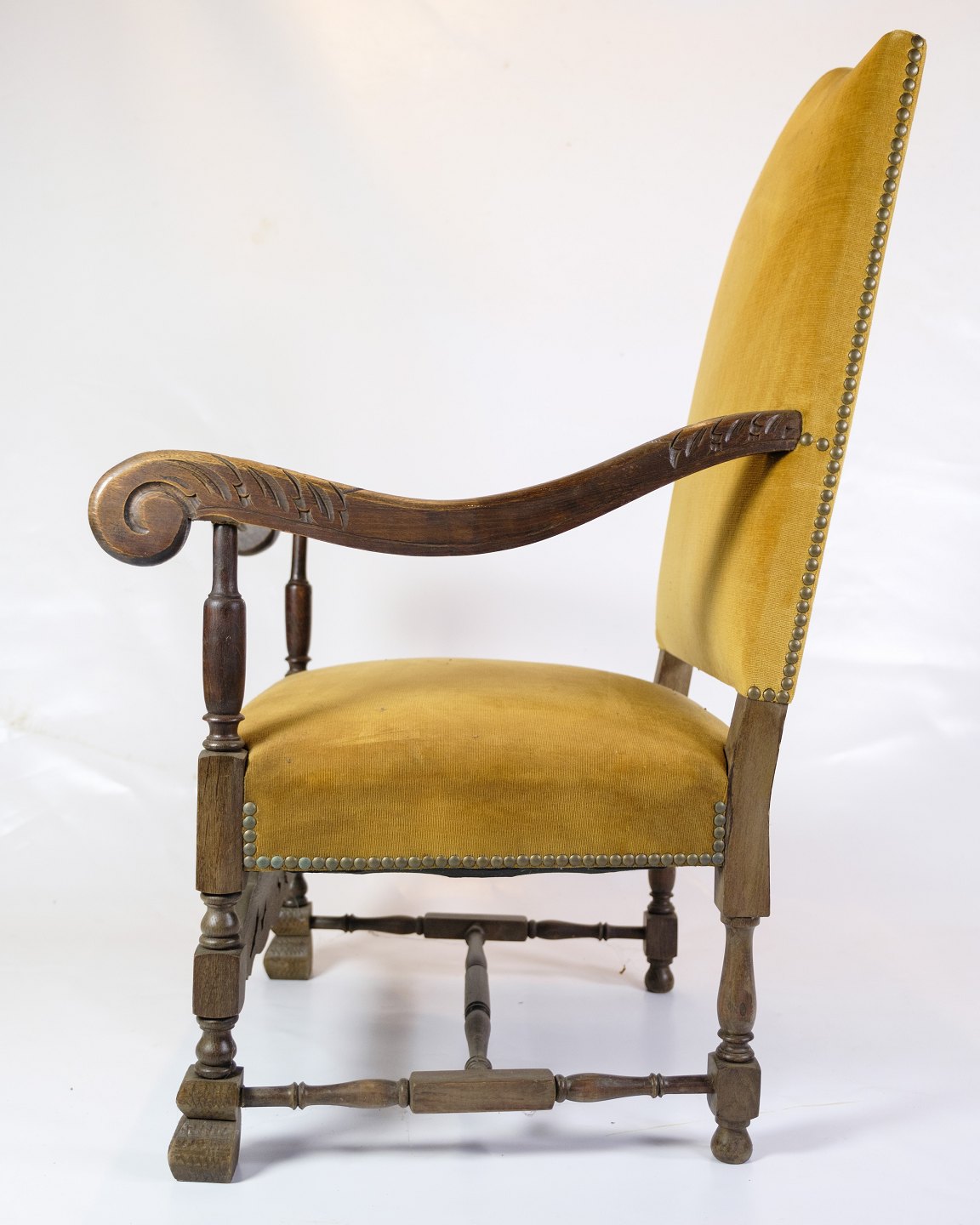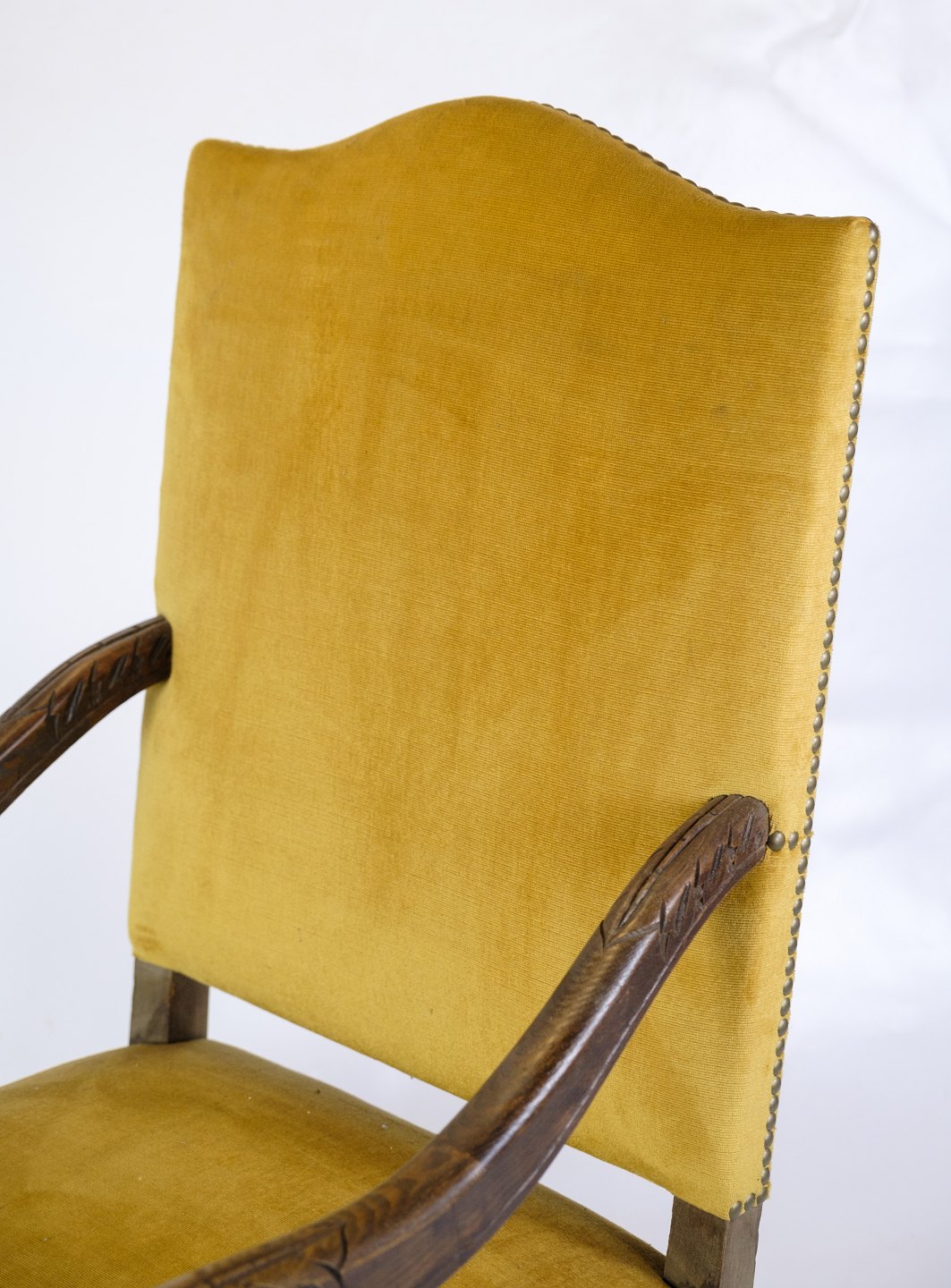 Antique King's chair - Yellow Nail-Studded Velour - Carvings in armrests & legs - Year 1920