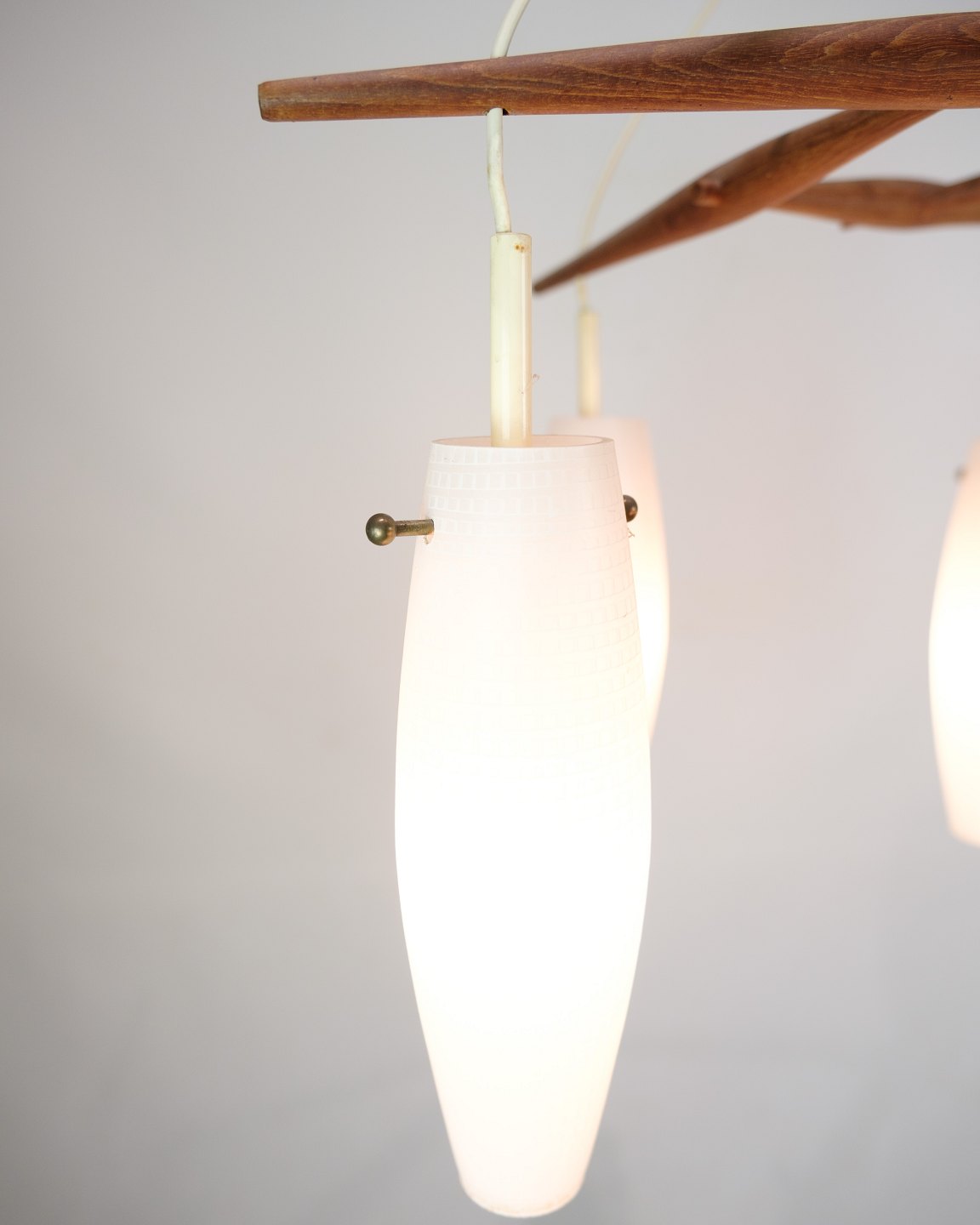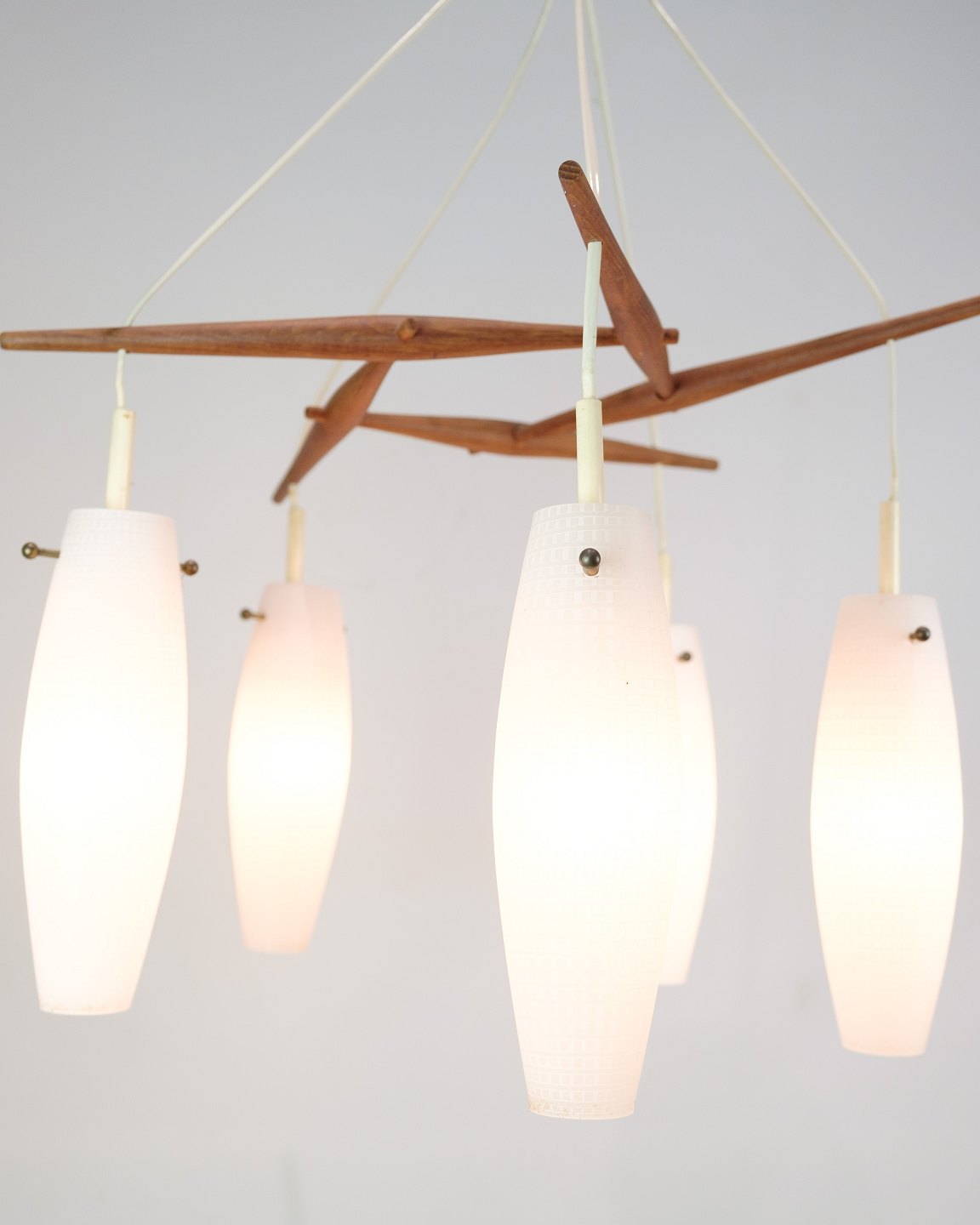 Teaktræets varme farve og opalglasets bløde belysning skaber en behagelig atmosfære i ethvert rum. Denne kombination af materialer giver lampen et organisk udseende, der passer perfekt til både moderne og retroindretninger.