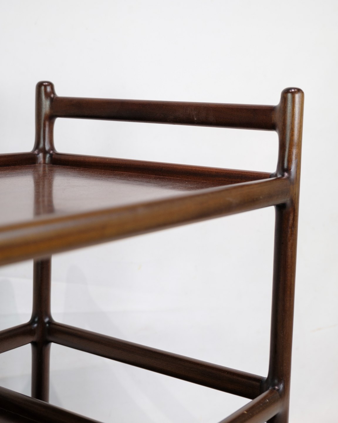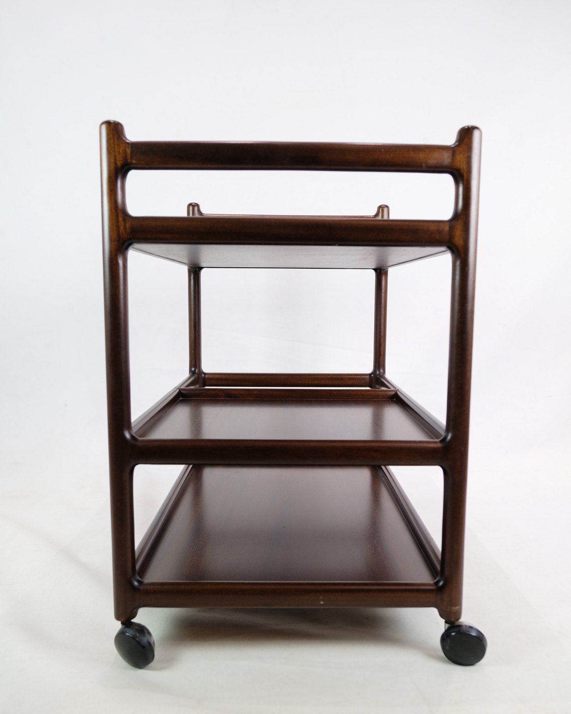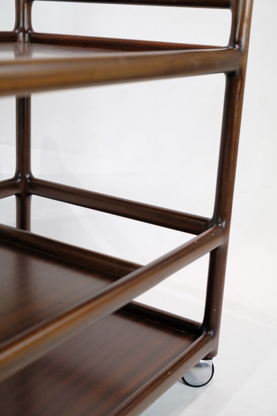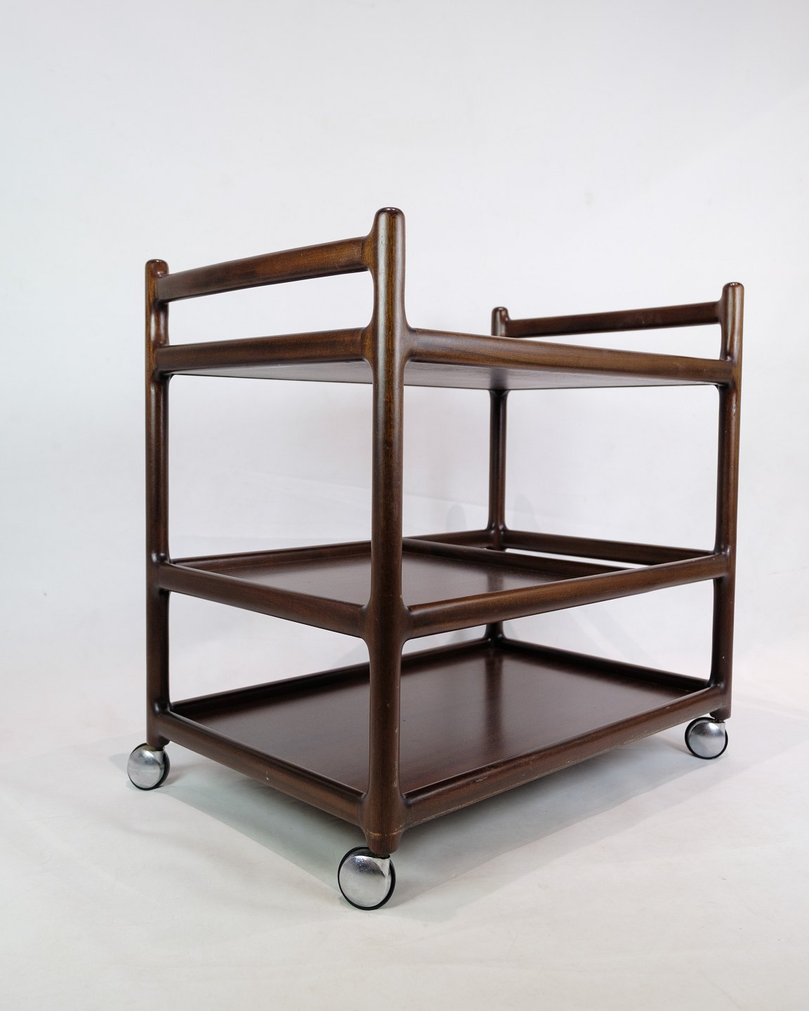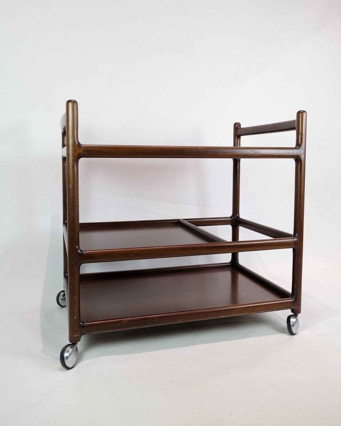 SolgtDenne serveringsvogn er et fortryllende eksempel på Henning Korch´s designæstetik fra 1960'erne og blev produceret af Silkeborg Møbelfabrik. Lavet af mahognitræ udstråler vognen en varm og indbydende atmosfære, der er typisk for denne æra af dansk design.