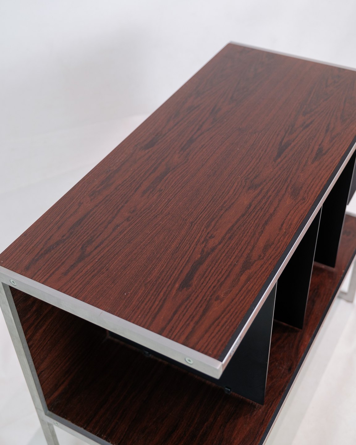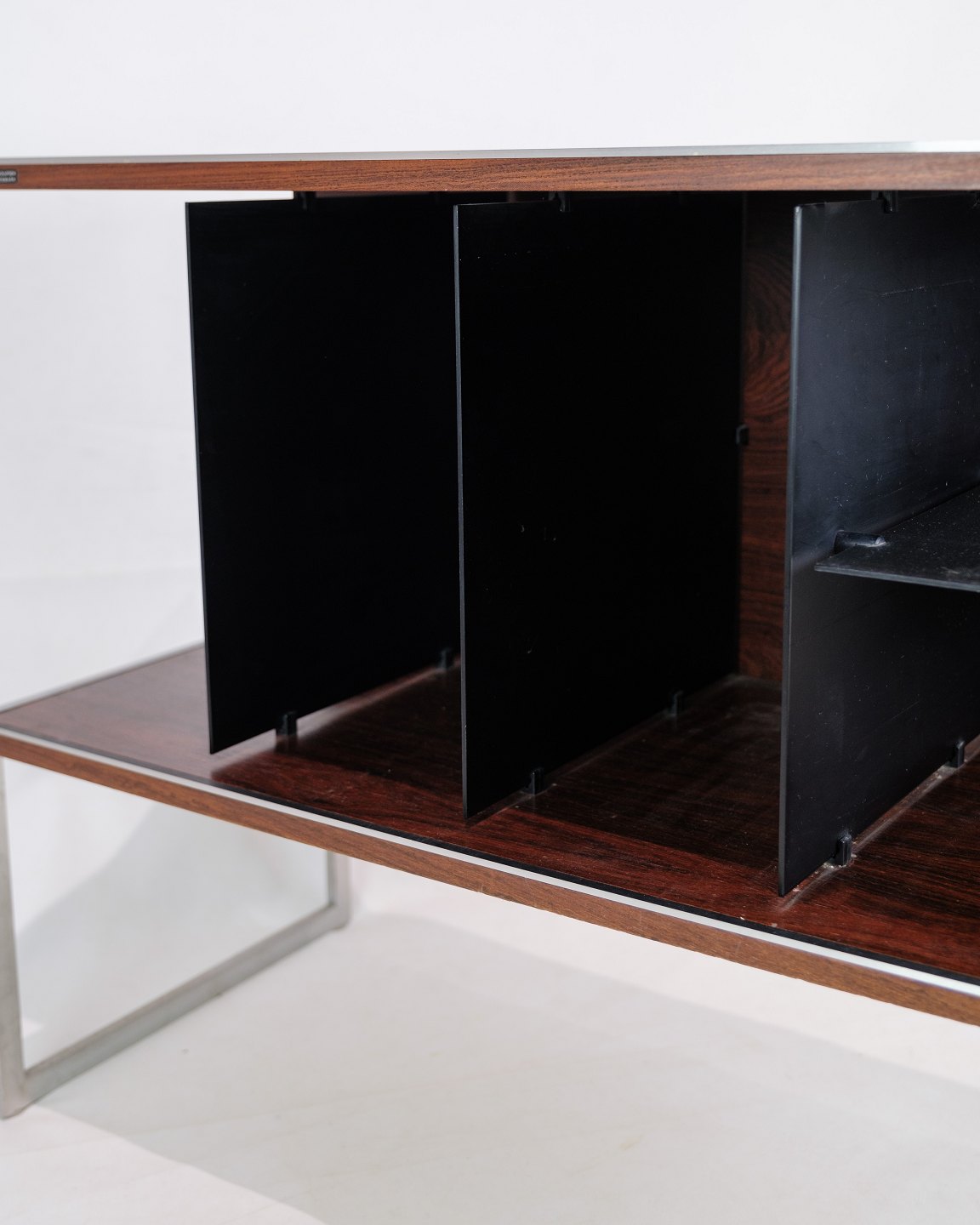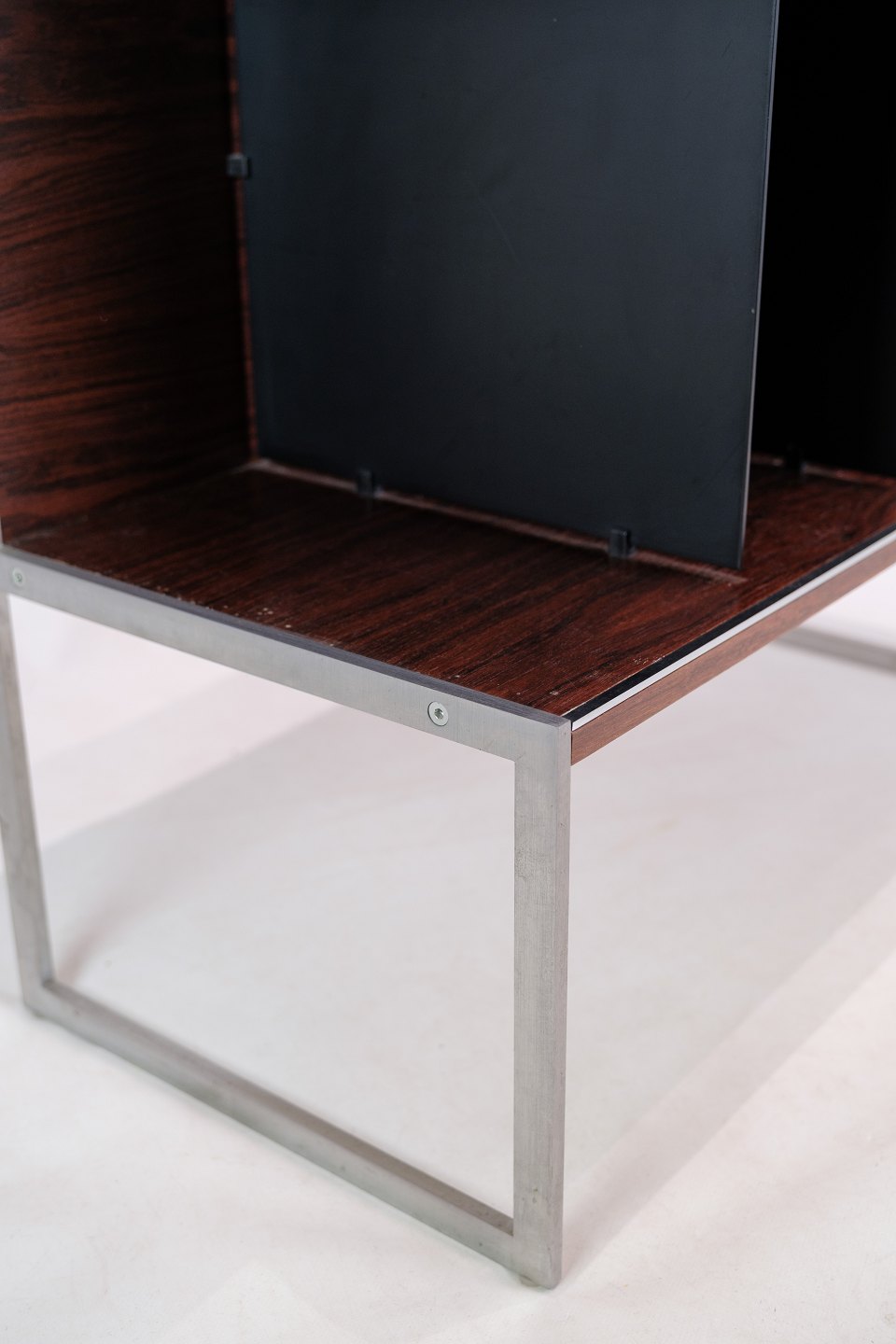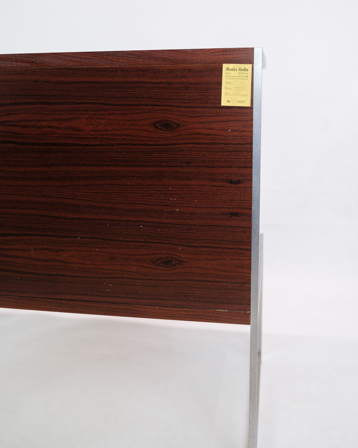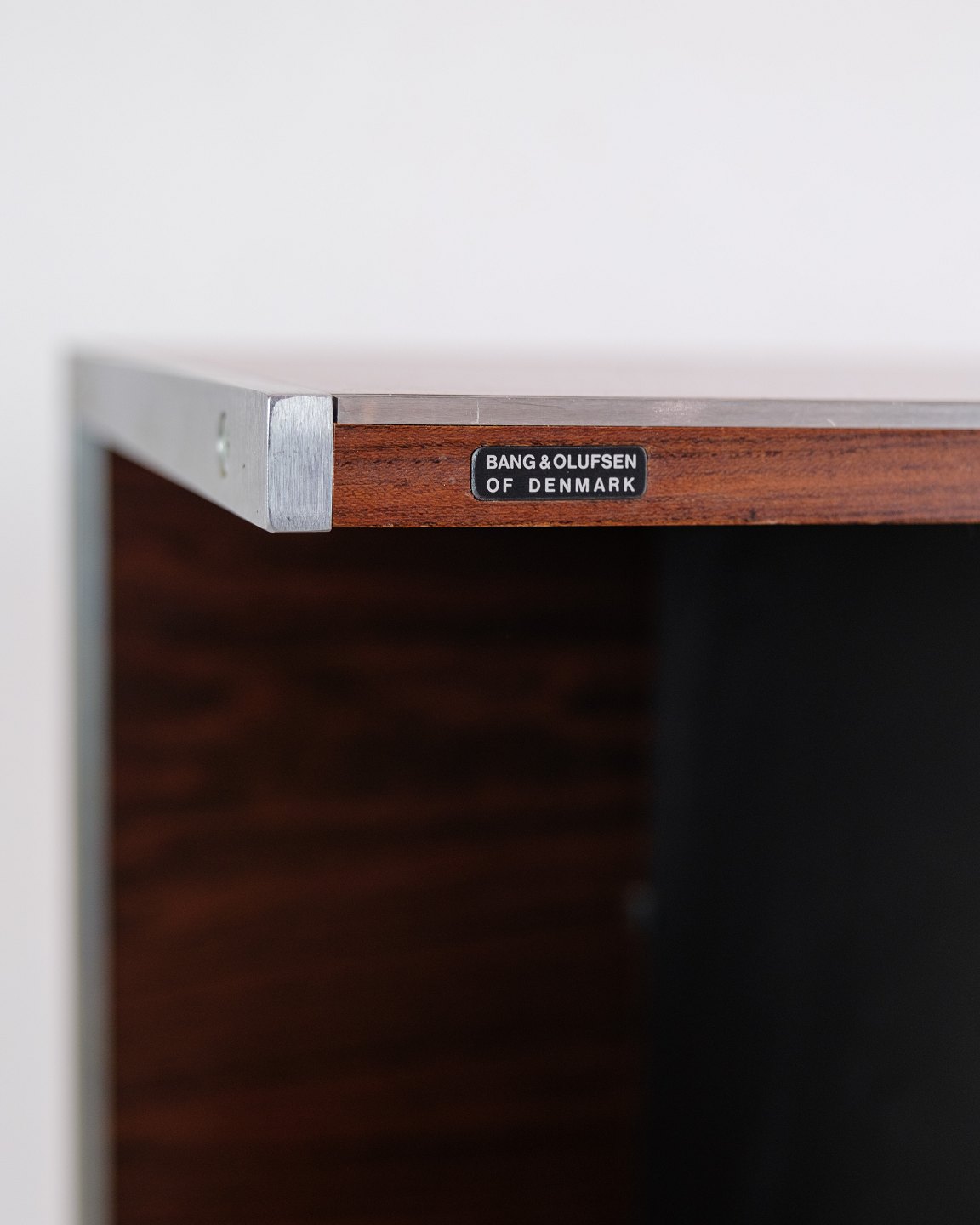 Palisanderets varme tone og aluminiumets slanke profil skaber en kontrastfyldt, men harmonisk helhed, der vil tilføje karakter til enhver stue eller rum. Møblet er designet til at matche Bang & Olufsens ikoniske lyd- og videoudstyr, hvilket giver et ensartet og stilfuldt udseende.