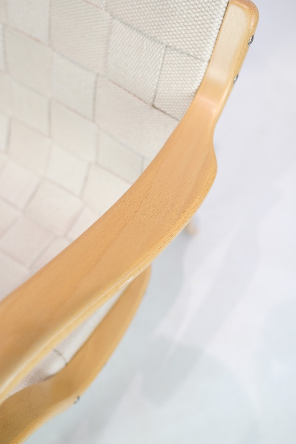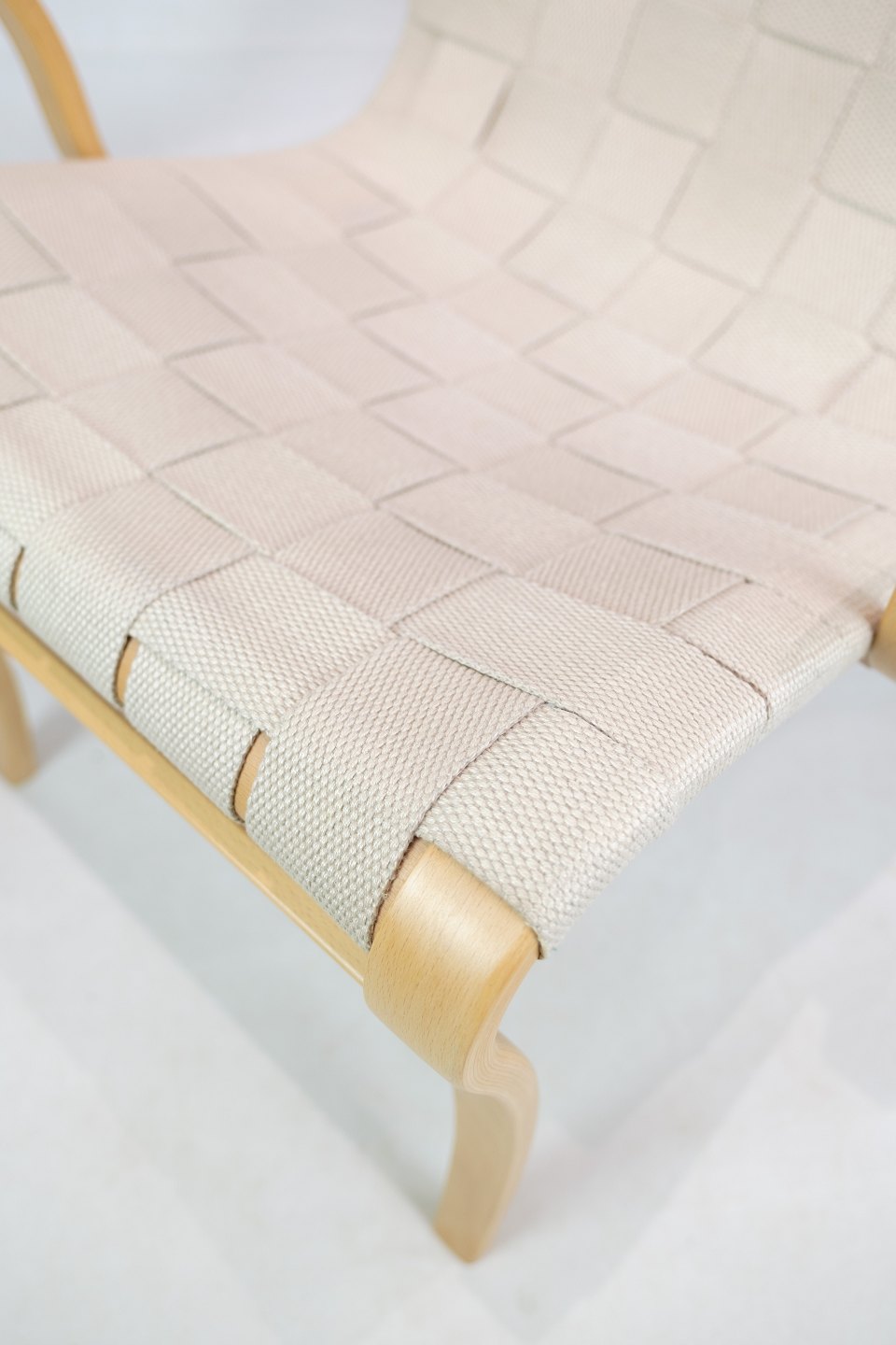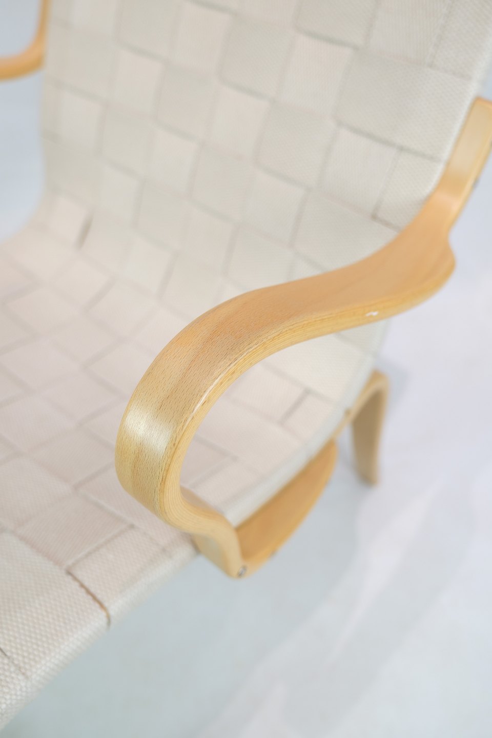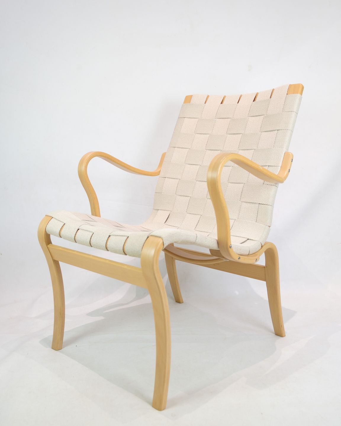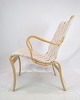 SolgtDenne lænestol, kendt som Model Mina, repræsenterer et eksemplarisk stykke møbeldesign skabt af den anerkendte svenske designer Bruno Mathsson. Stolen er konstrueret af formbøjet bøg, hvilket giver den en naturlig og elegant form.