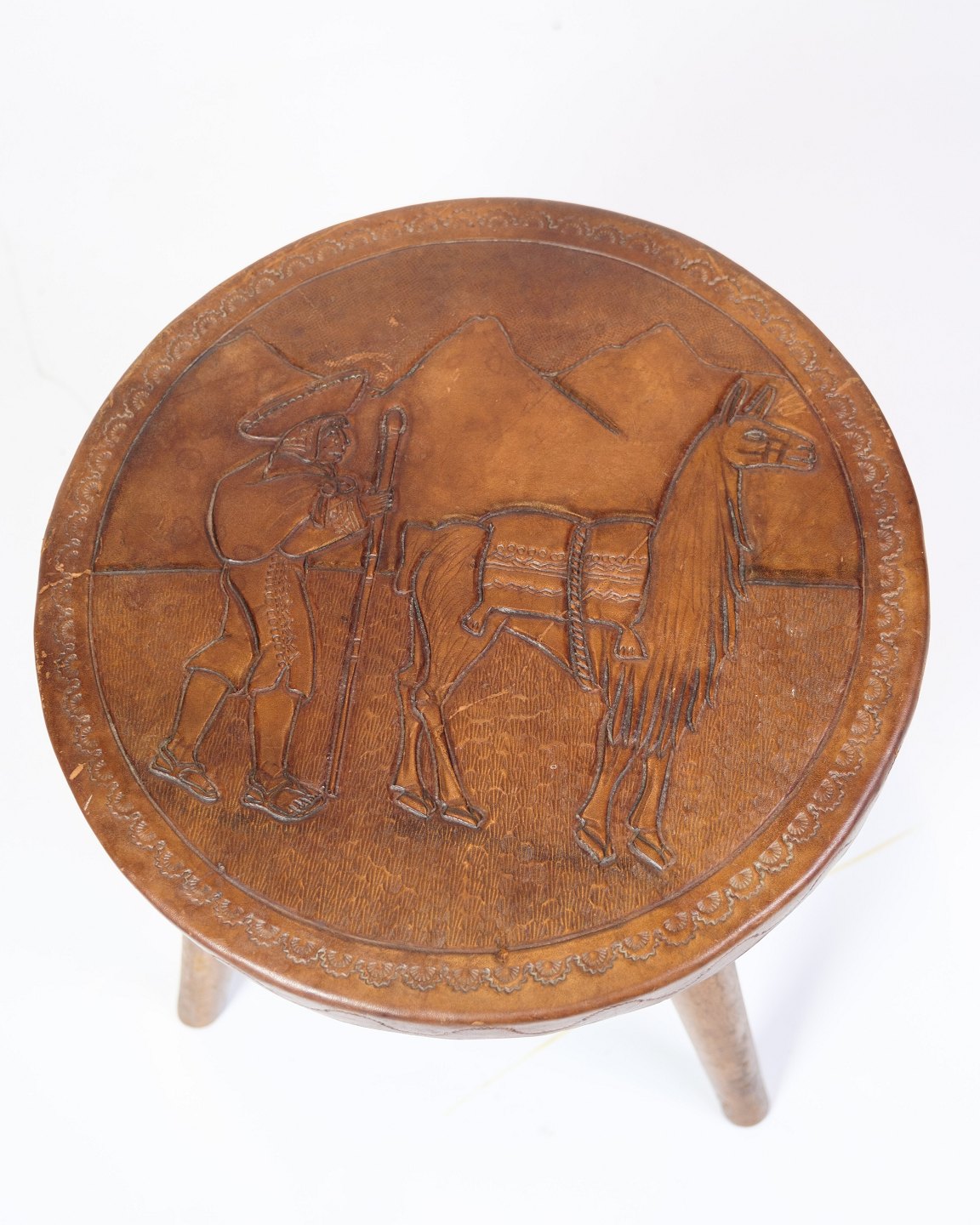 Denne antikke skammel er et eksemplar af fin håndværkskunst, der bærer et motiv af en bonde med en alpaca, udskåret med omhu og præcision. Motivet viser ikke kun en smuk iscenesættelse af bondelivet, men også en hyldest til naturens skønhed og det landlige liv.