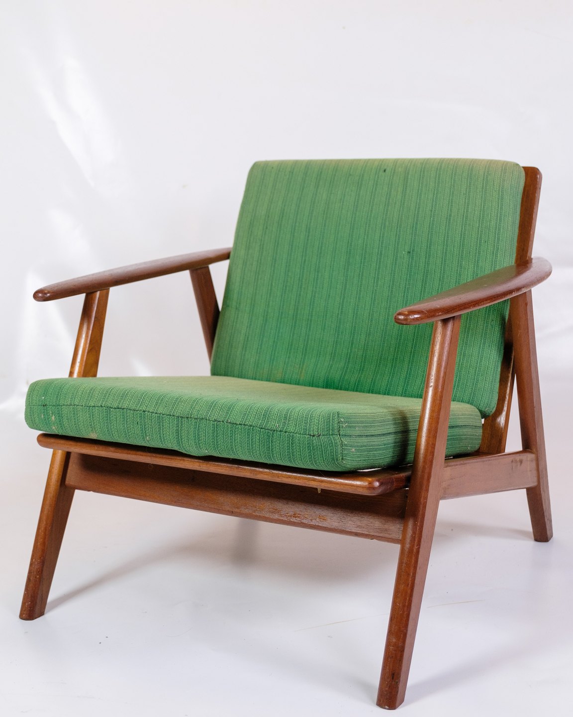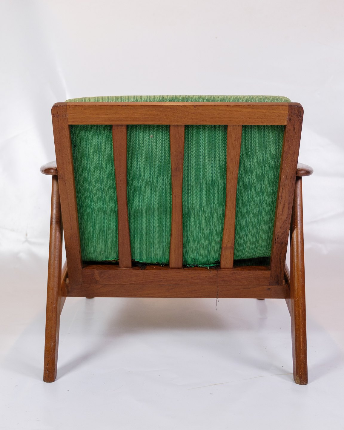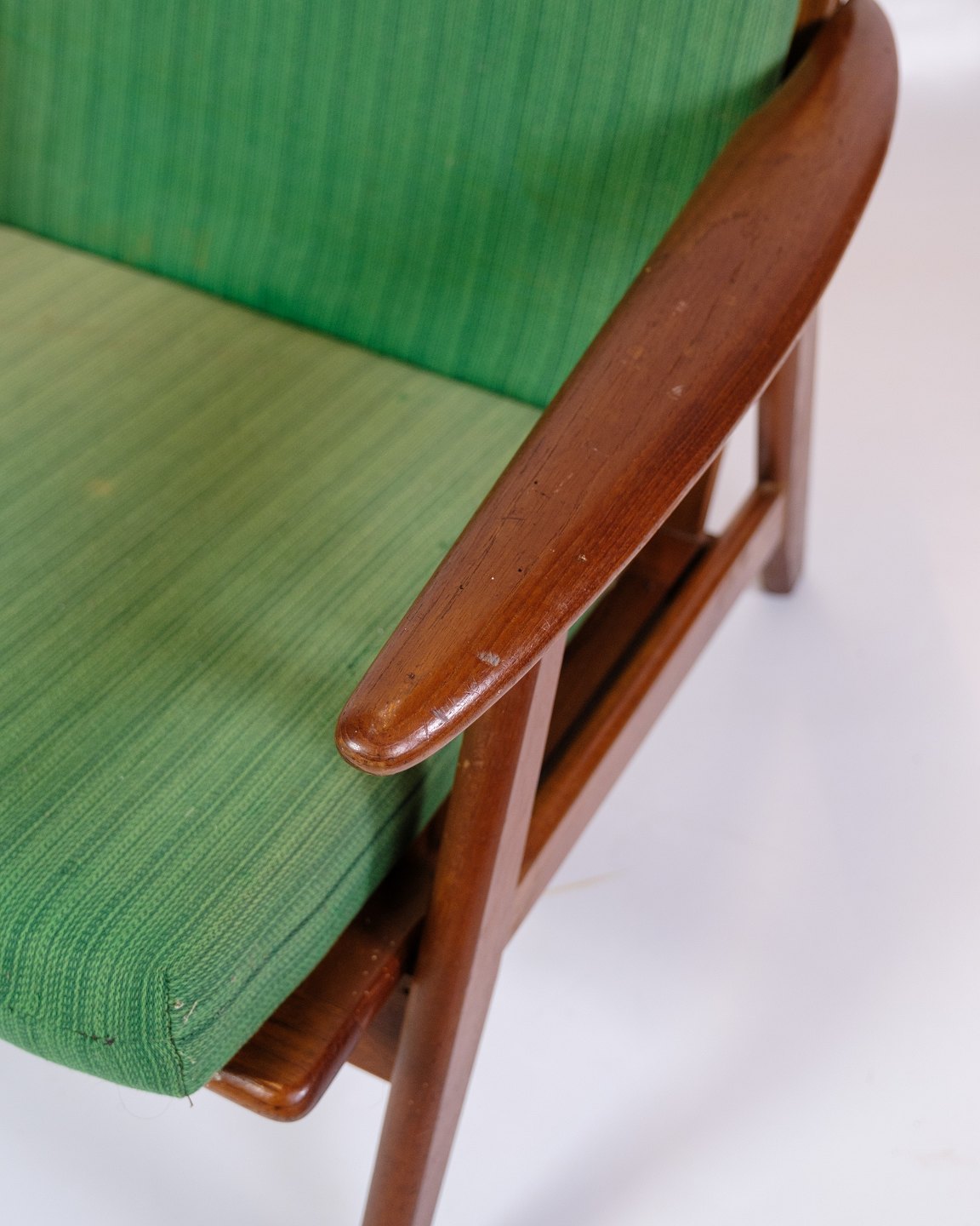 Denne lænestol fra 1960'erne er et fremragende eksempel på dansk design fra midten af det 20. århundrede. Stolen er fremstillet af teaktræ og betrukket med grønt stof, hvilket kombinerer naturlige materialer med tidens farvetrends.